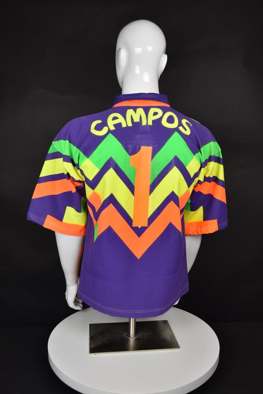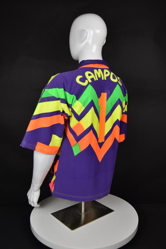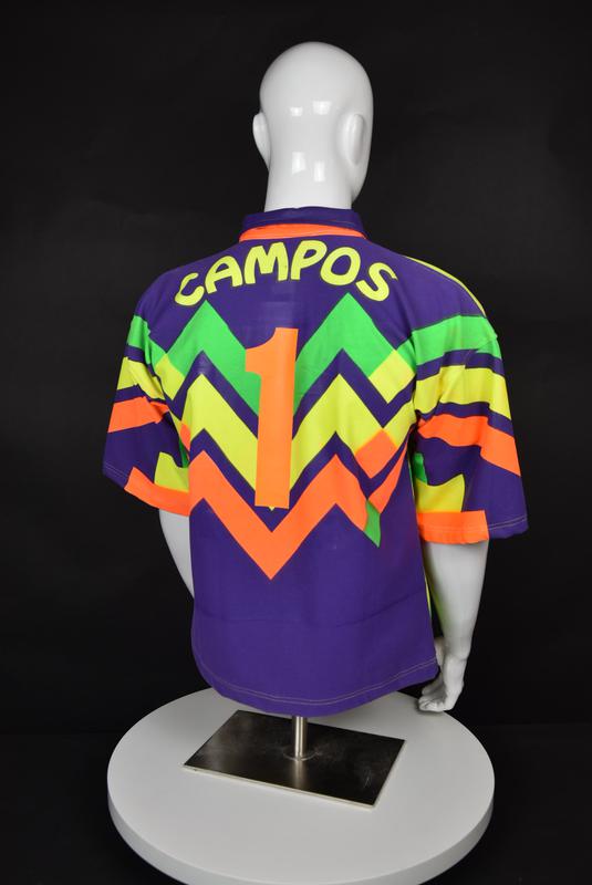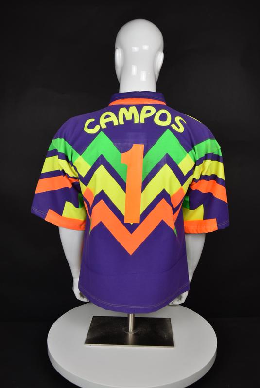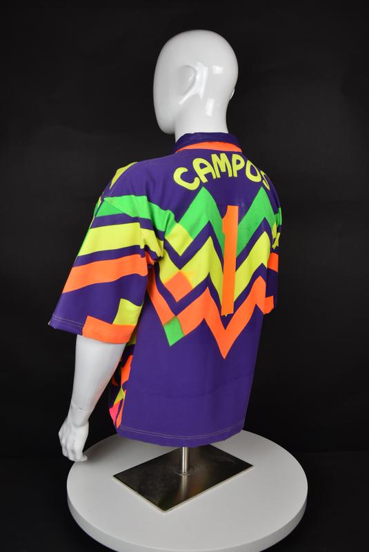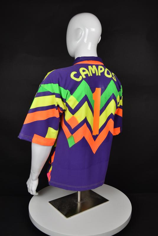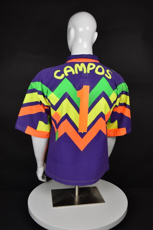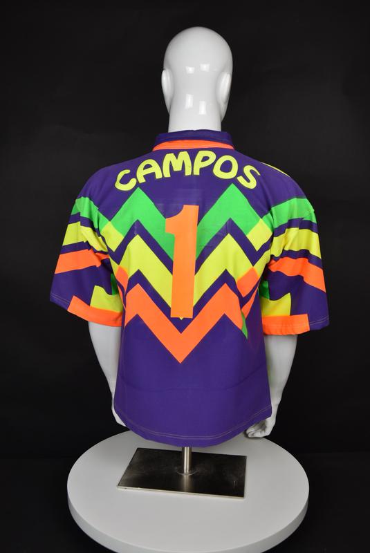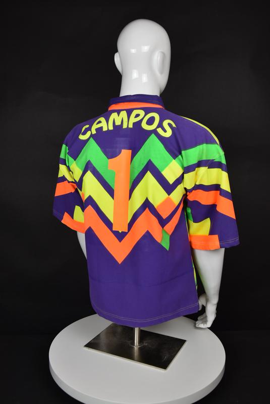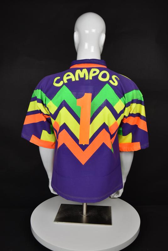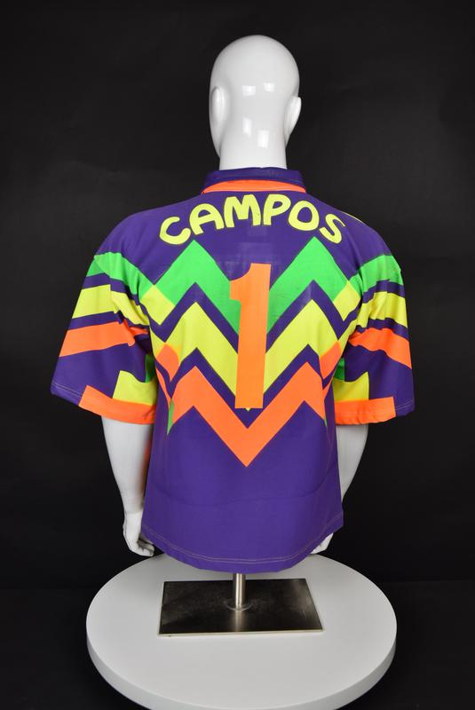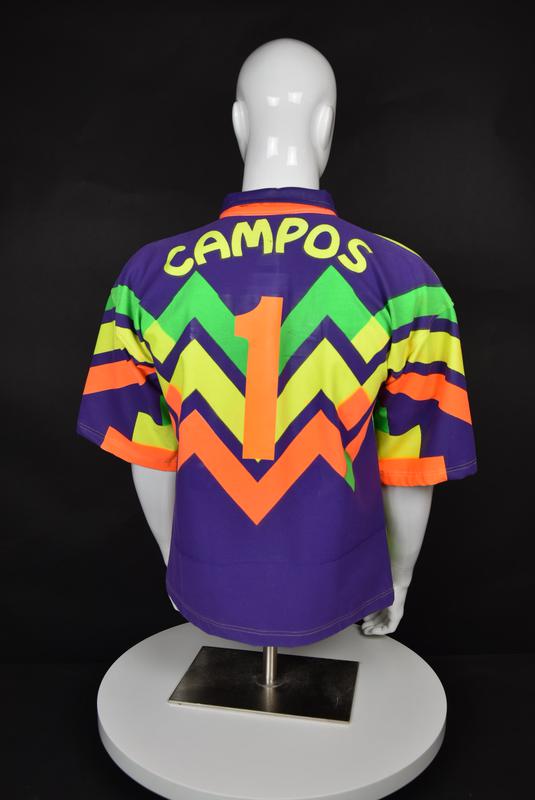 Подготвена за вратаря Хорхе Кампос фланелка на Мексико от Световното първенство САЩ 1994. Екипите от тази лимитирана серия (25 бройки) са по лична идея и изработка на ексцентричния вратар, който носи различен цветен дизайн във всеки двубой. Този е използван в двубоя срещу Норвегия от груповата фаза. Мексиканците отпадат на 1/8 финал от България след изпълнение на дузпи. Висок едва 168 см, Кампос се отличава с уникалния си стил на игра и акробатични спасявания. Шареният екип му спечелва прякора „Папагала“. Хорхе е участник на 3 световни първенства и има записани 130 двубоя с националната фланелка на Мексико.
