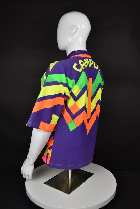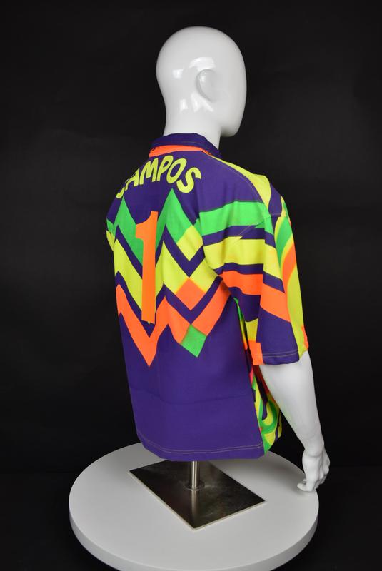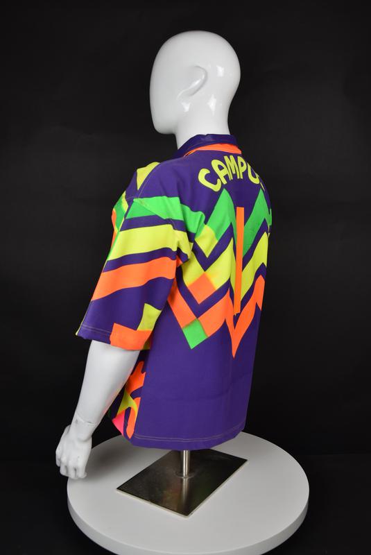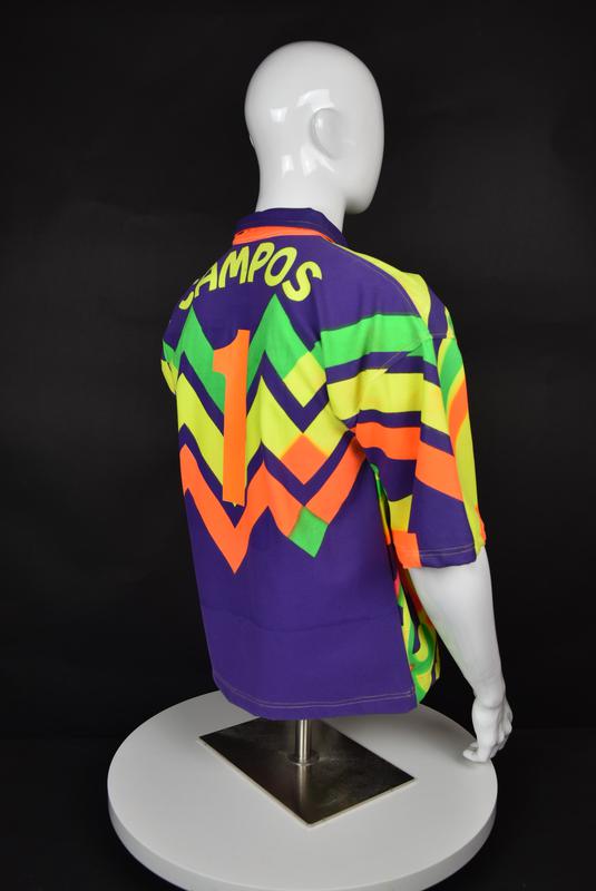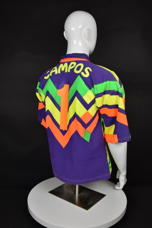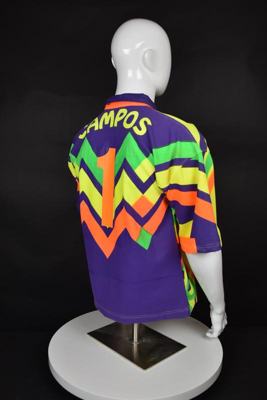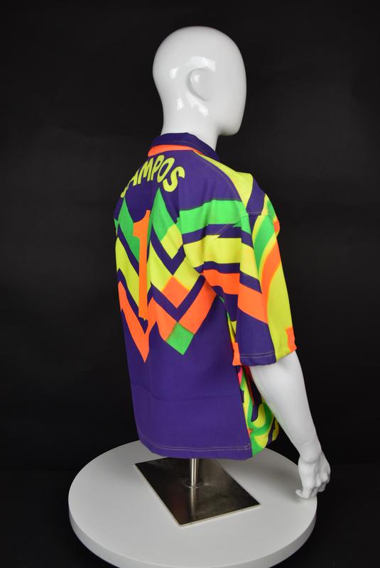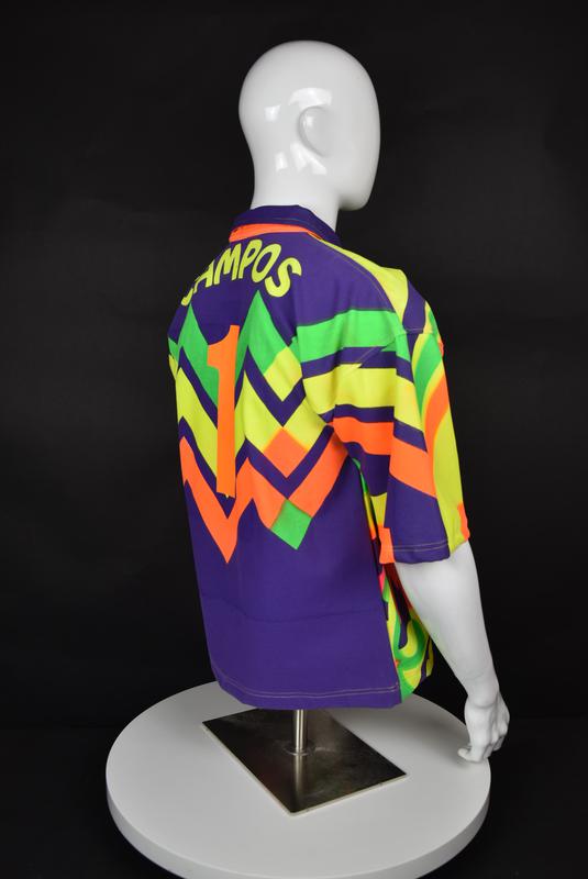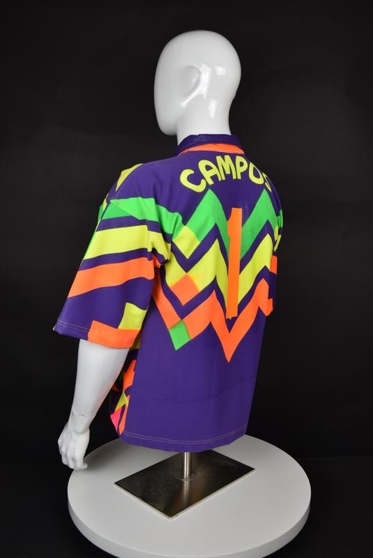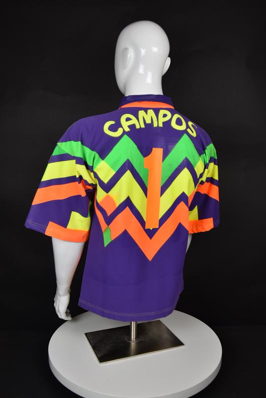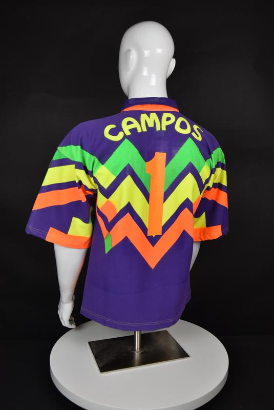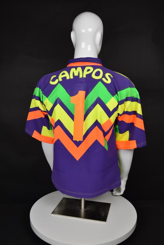 Подготвена за вратаря Хорхе Кампос фланелка на Мексико от Световното първенство САЩ 1994. Екипите от тази лимитирана серия (25 бройки) са по лична идея и изработка на ексцентричния вратар, който носи различен цветен дизайн във всеки двубой. Този е използван в двубоя срещу Норвегия от груповата фаза. Мексиканците отпадат на 1/8 финал от България след изпълнение на дузпи. Висок едва 168 см, Кампос се отличава с уникалния си стил на игра и акробатични спасявания. Шареният екип му спечелва прякора „Папагала“. Хорхе е участник на 3 световни първенства и има записани 130 двубоя с националната фланелка на Мексико.