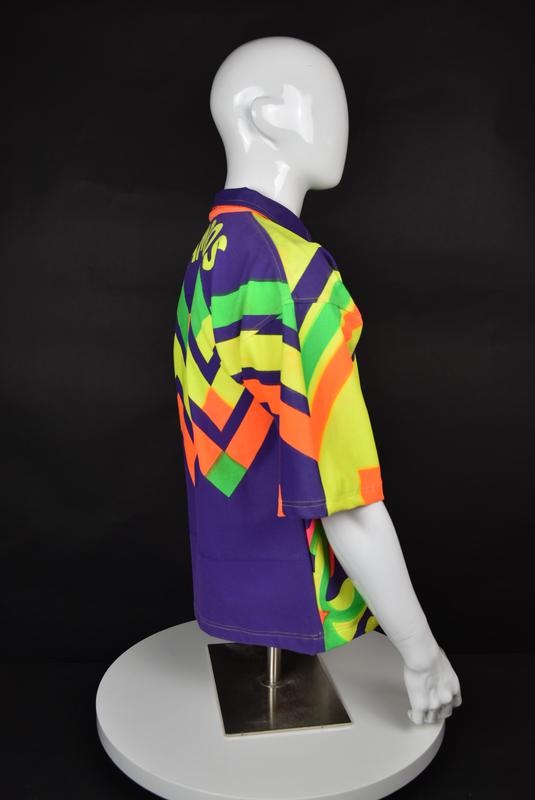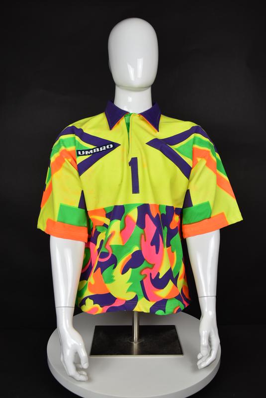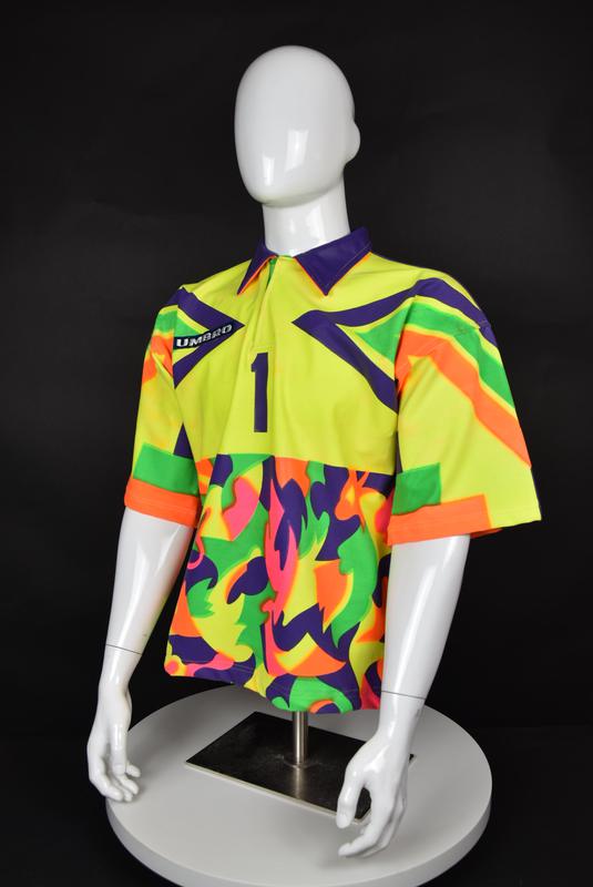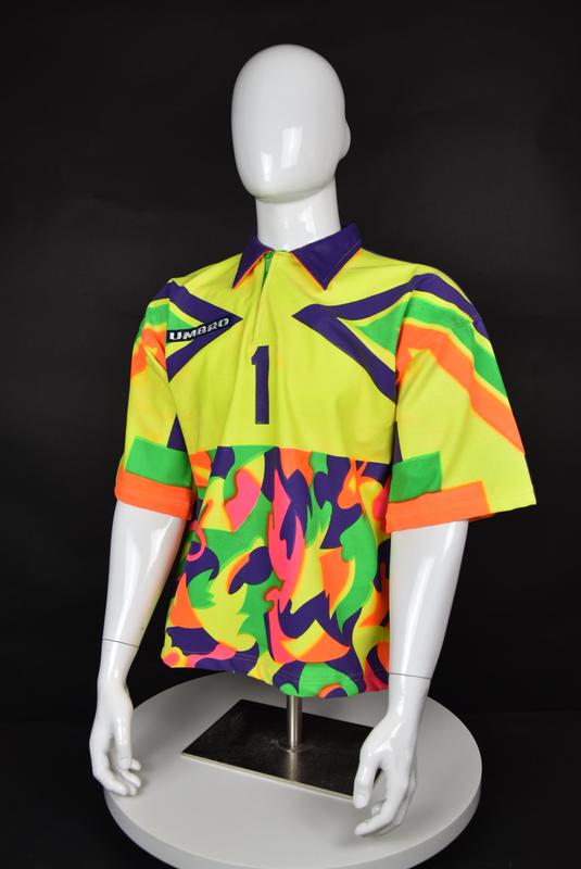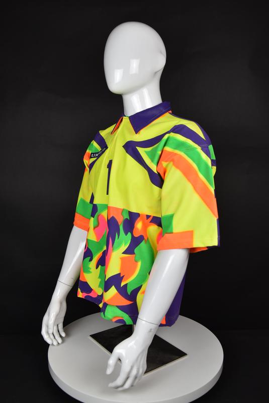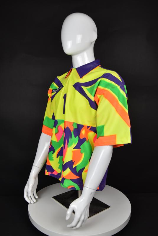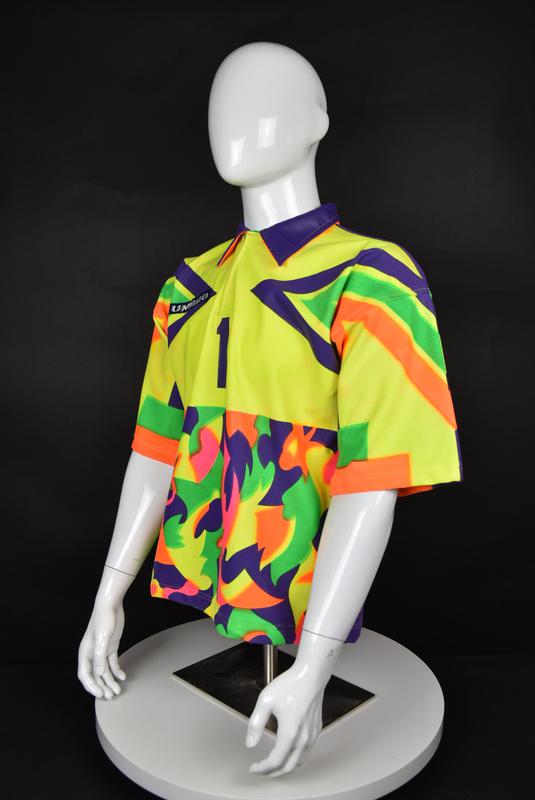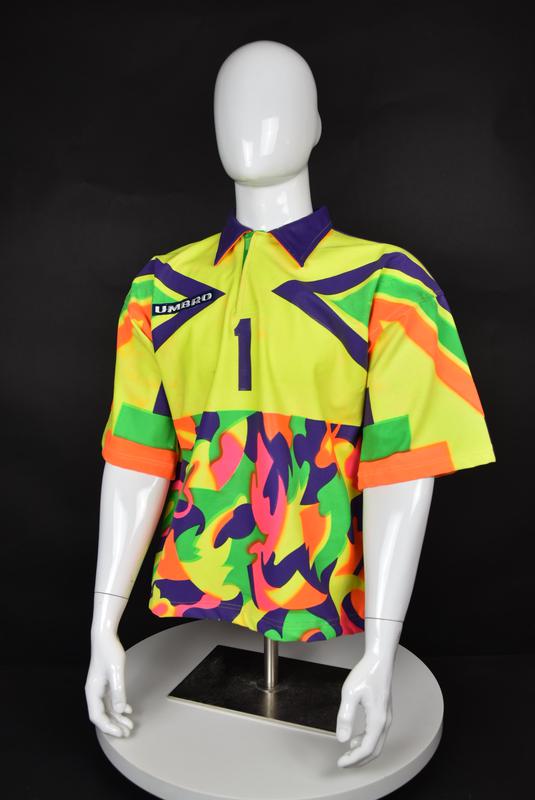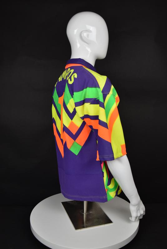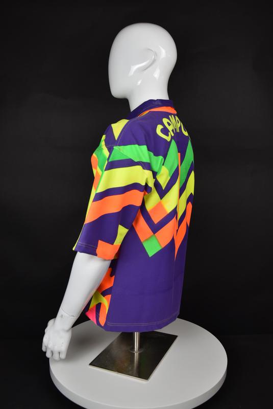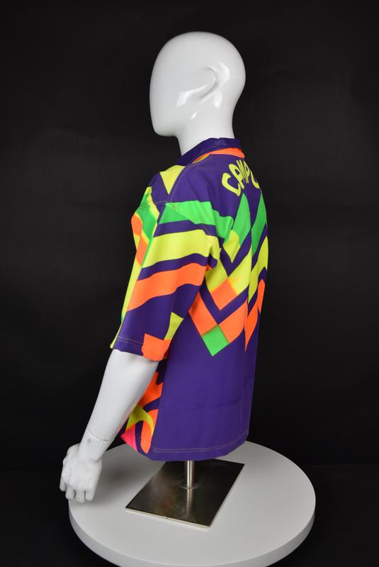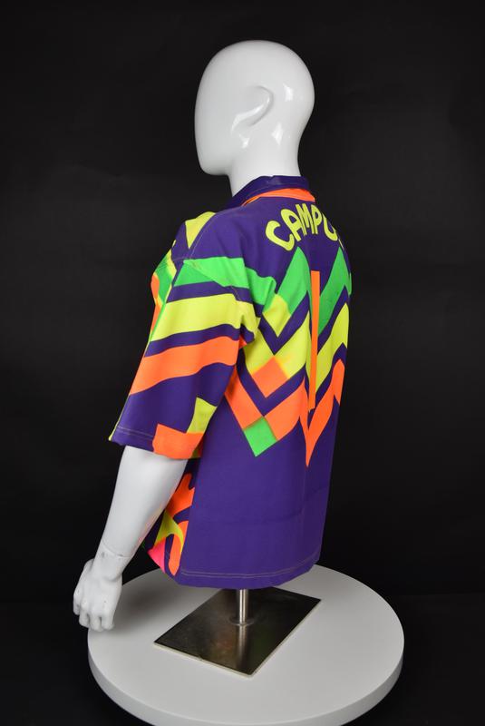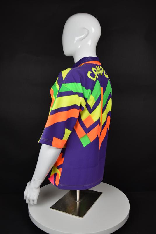 Подготвена за вратаря Хорхе Кампос фланелка на Мексико от Световното първенство САЩ 1994. Екипите от тази лимитирана серия (25 бройки) са по лична идея и изработка на ексцентричния вратар, който носи различен цветен дизайн във всеки двубой. Този е използван в двубоя срещу Норвегия от груповата фаза. Мексиканците отпадат на 1/8 финал от България след изпълнение на дузпи. Висок едва 168 см, Кампос се отличава с уникалния си стил на игра и акробатични спасявания. Шареният екип му спечелва прякора „Папагала“. Хорхе е участник на 3 световни първенства и има записани 130 двубоя с националната фланелка на Мексико.