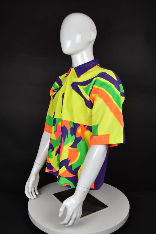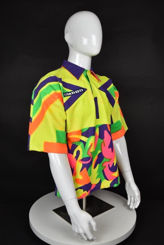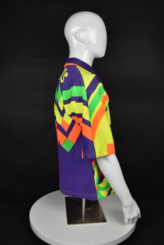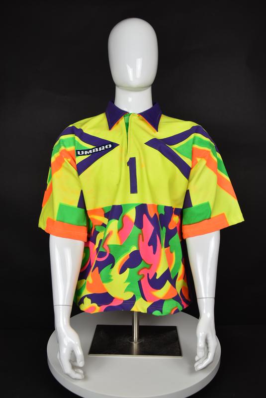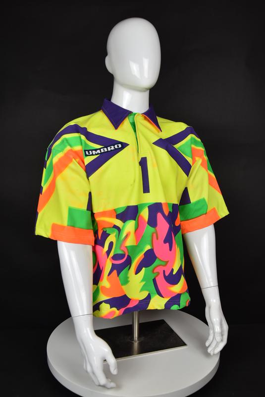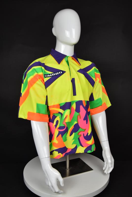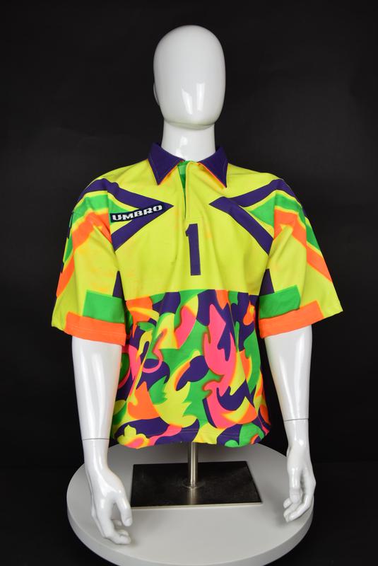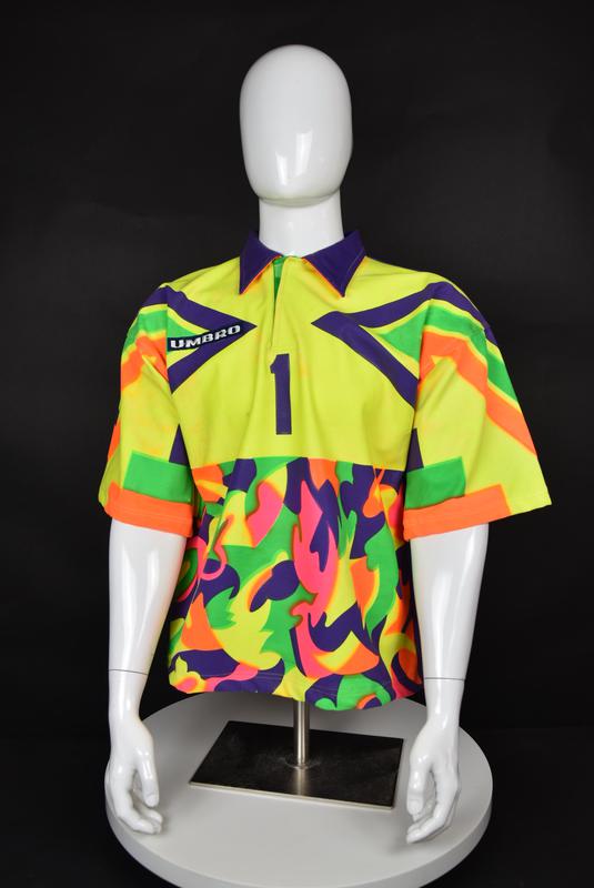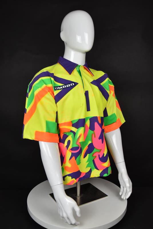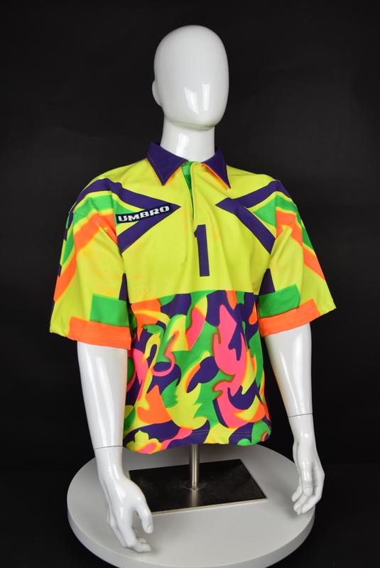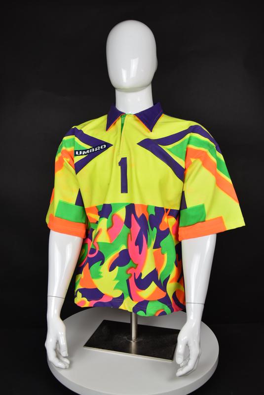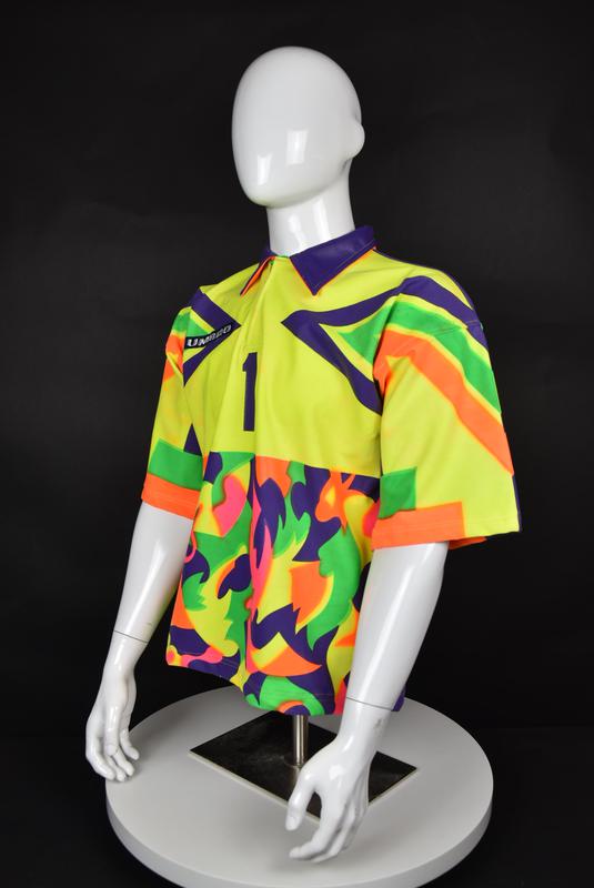Подготвена за вратаря Хорхе Кампос фланелка на Мексико от Световното първенство САЩ 1994. Екипите от тази лимитирана серия (25 бройки) са по лична идея и изработка на ексцентричния вратар, който носи различен цветен дизайн във всеки двубой. Този е използван в двубоя срещу Норвегия от груповата фаза. Мексиканците отпадат на 1/8 финал от България след изпълнение на дузпи. Висок едва 168 см, Кампос се отличава с уникалния си стил на игра и акробатични спасявания. Шареният екип му спечелва прякора „Папагала“. Хорхе е участник на 3 световни първенства и има записани 130 двубоя с националната фланелка на Мексико.