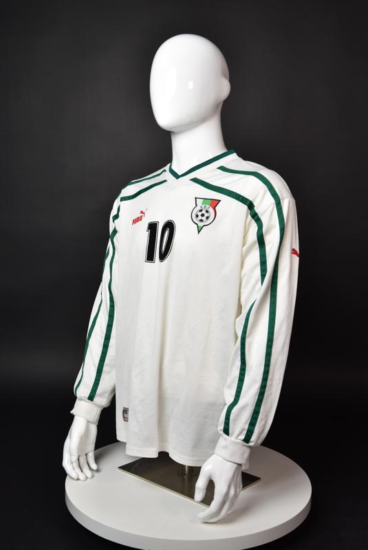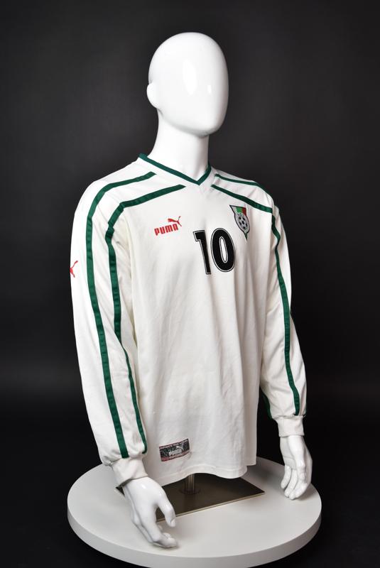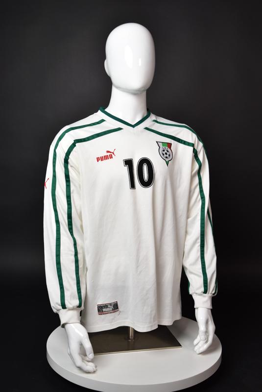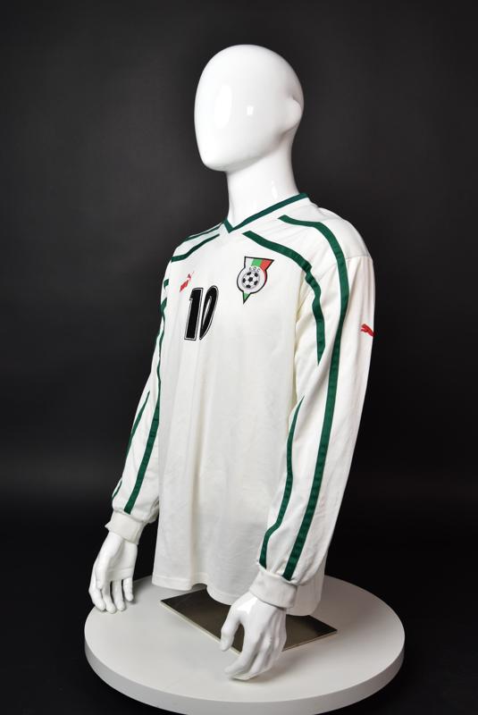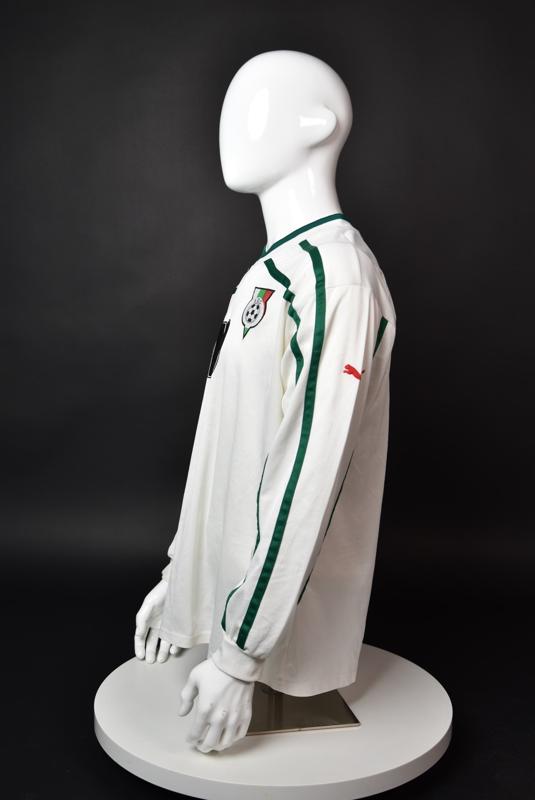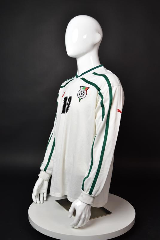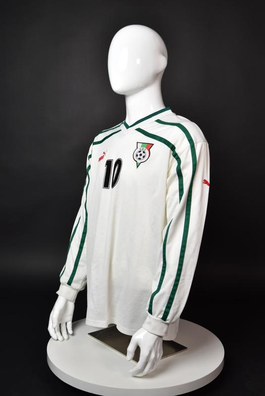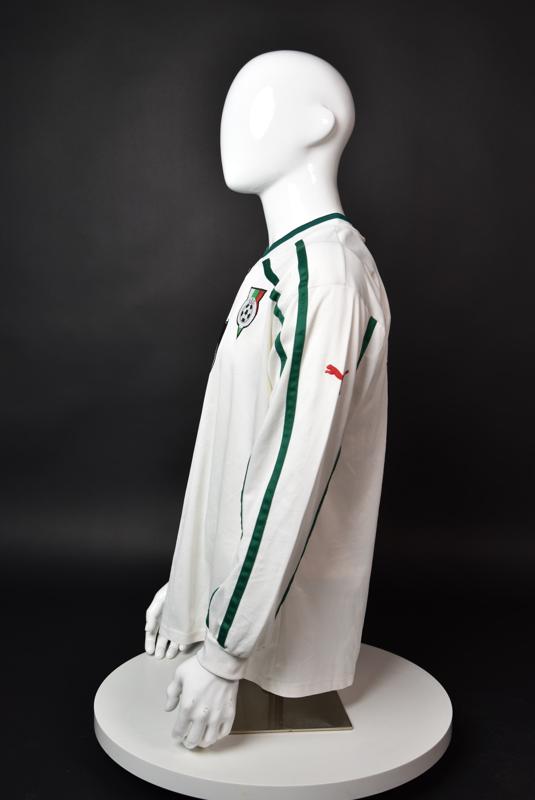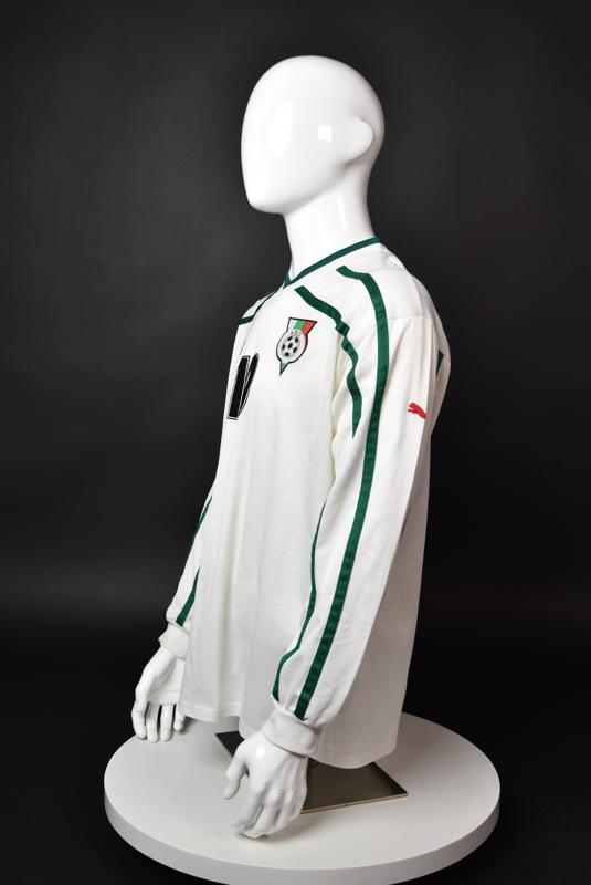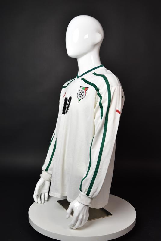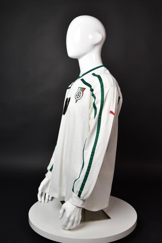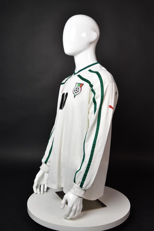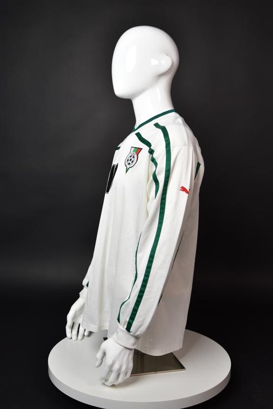 Bulgaria shirt issued to Krasimir Balakov for the 2002 FIFA World Cup Qualifiers. This is a special shirt as Bulgaria only wore black coloured printings in the last three games of the qualifying group - away games at Malta and Czechia and the home match against Denmark. Balakov, however, wore short sleeve shirts in these games. For the rest of the games the colour of the shirt number printings is red. The former attacking midfilder made 92 appearances for the national team between 1988 and 2003 (one of the best totals in national history) and scored 16 goals. He is a bronze medalist from the 1994 FIFA World Cup and was voted to the World Cup All-Star team.