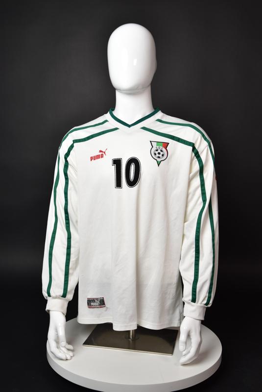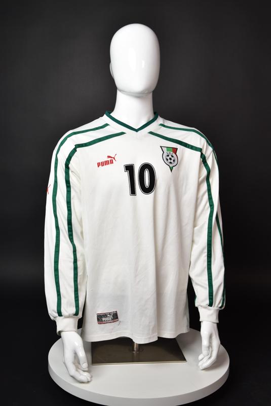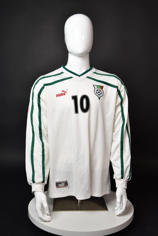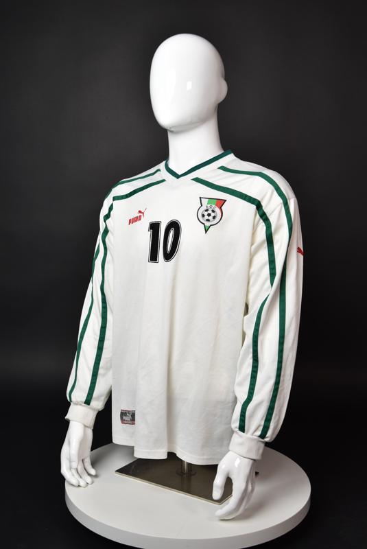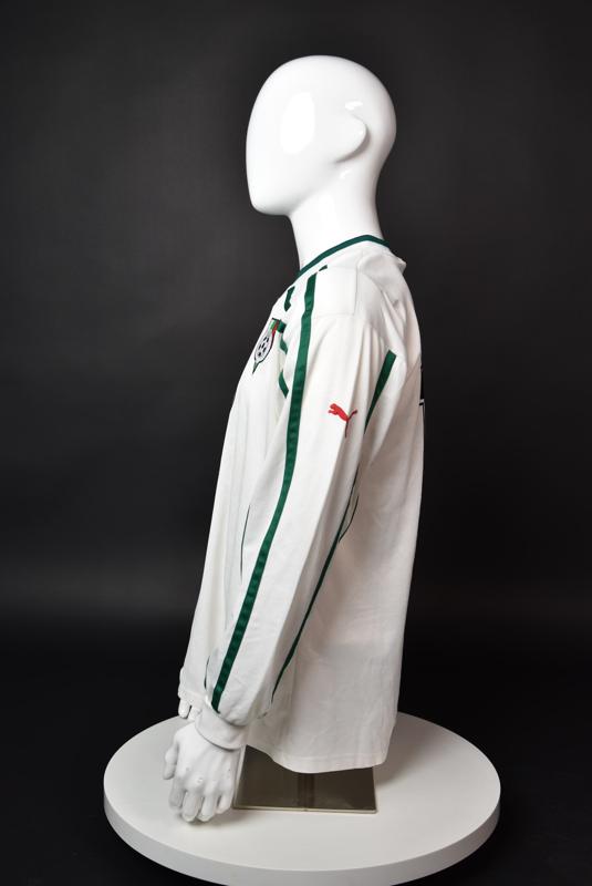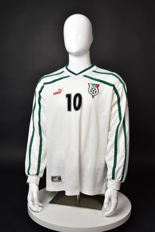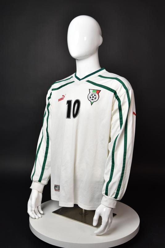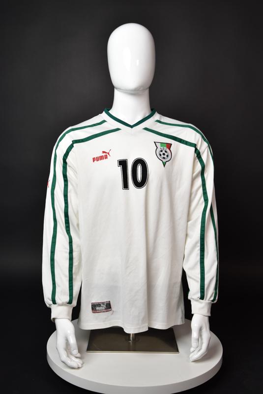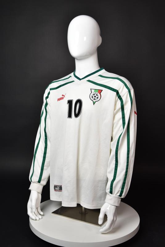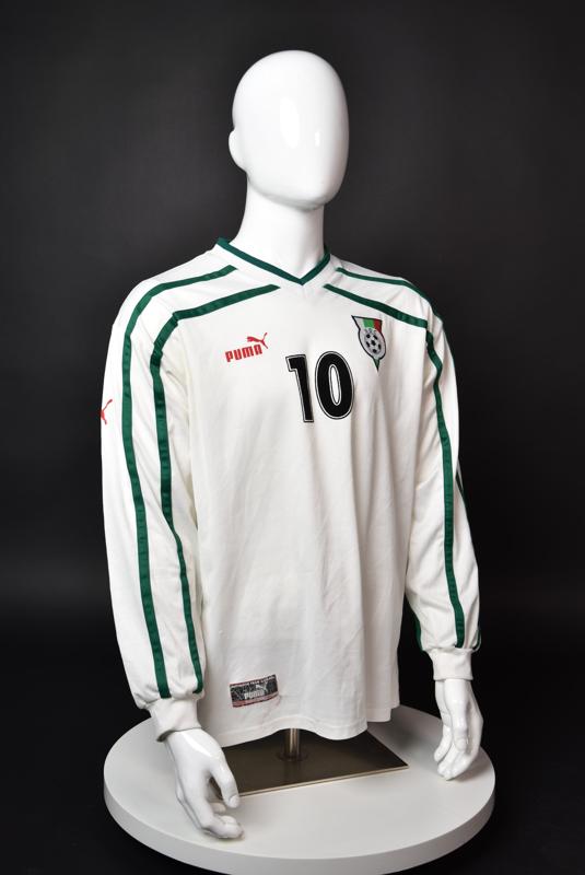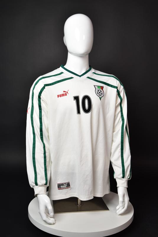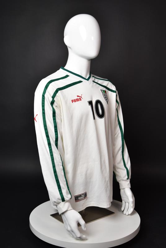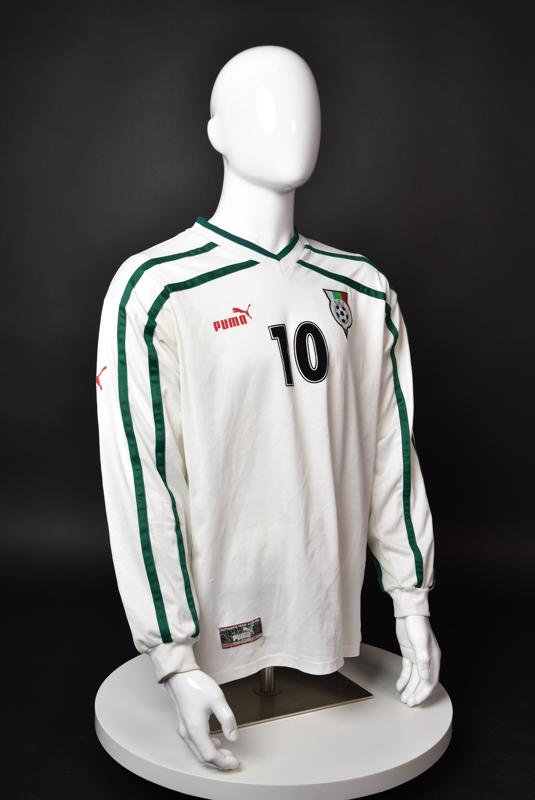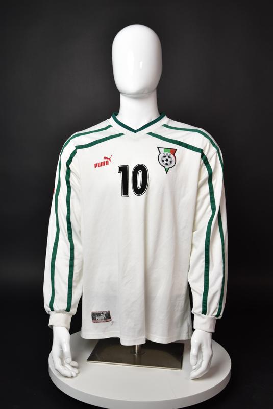 Bulgaria shirt issued to Krasimir Balakov for the 2002 FIFA World Cup Qualifiers. This is a special shirt as Bulgaria only wore black coloured printings in the last three games of the qualifying group - away games at Malta and Czechia and the home match against Denmark. Balakov, however, wore short sleeve shirts in these games. For the rest of the games the colour of the shirt number printings is red. The former attacking midfilder made 92 appearances for the national team between 1988 and 2003 (one of the best totals in national history) and scored 16 goals. He is a bronze medalist from the 1994 FIFA World Cup and was voted to the World Cup All-Star team.