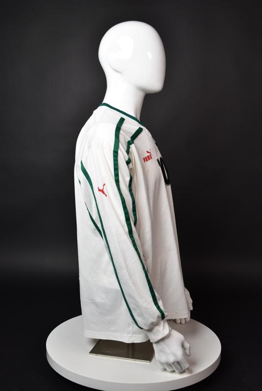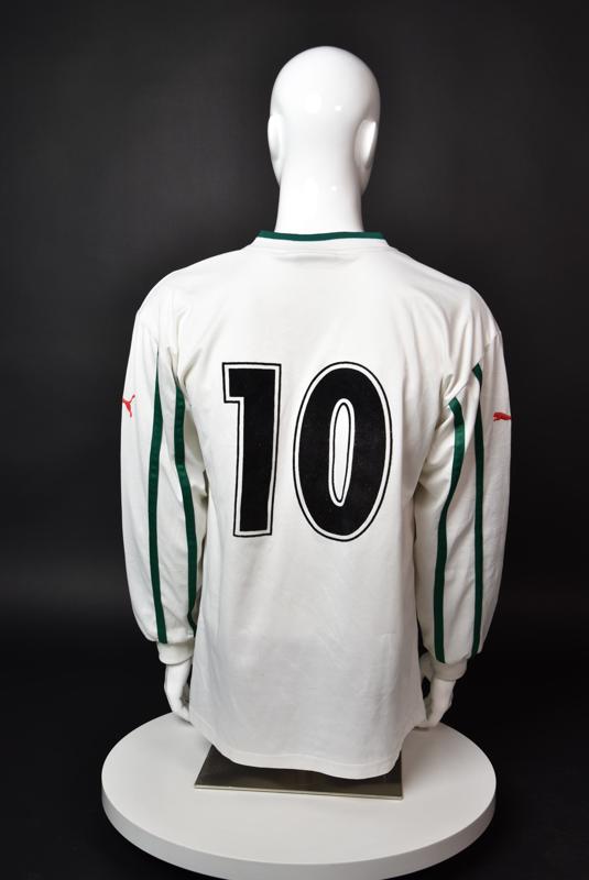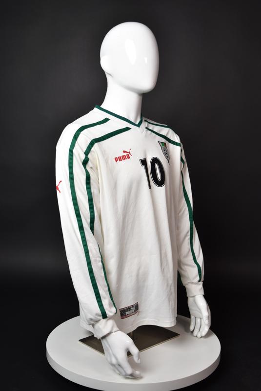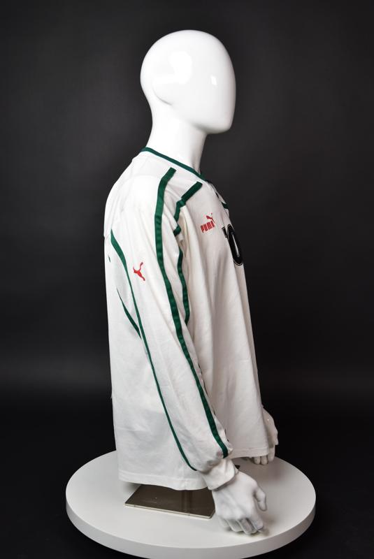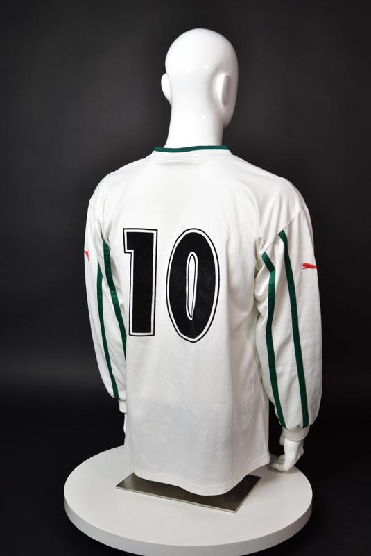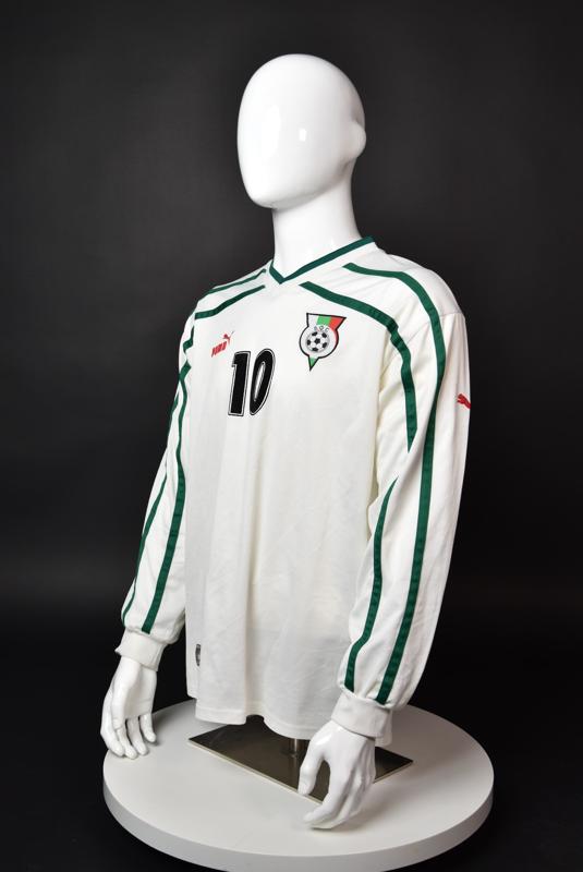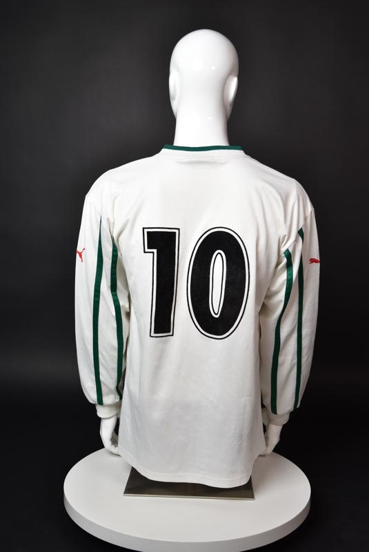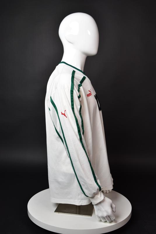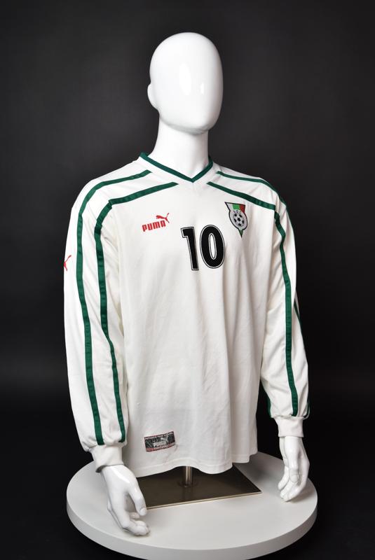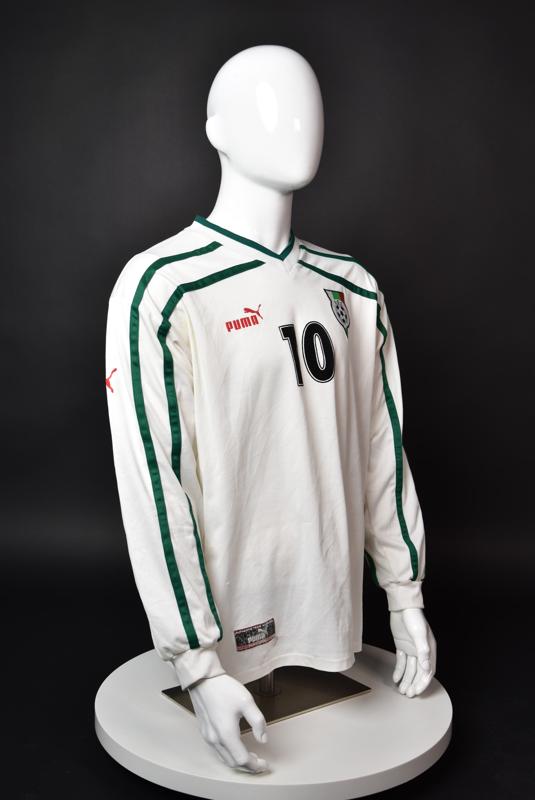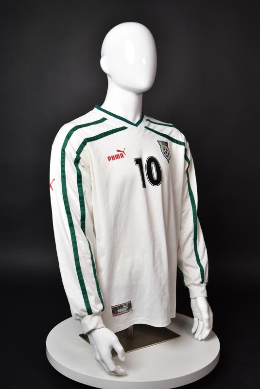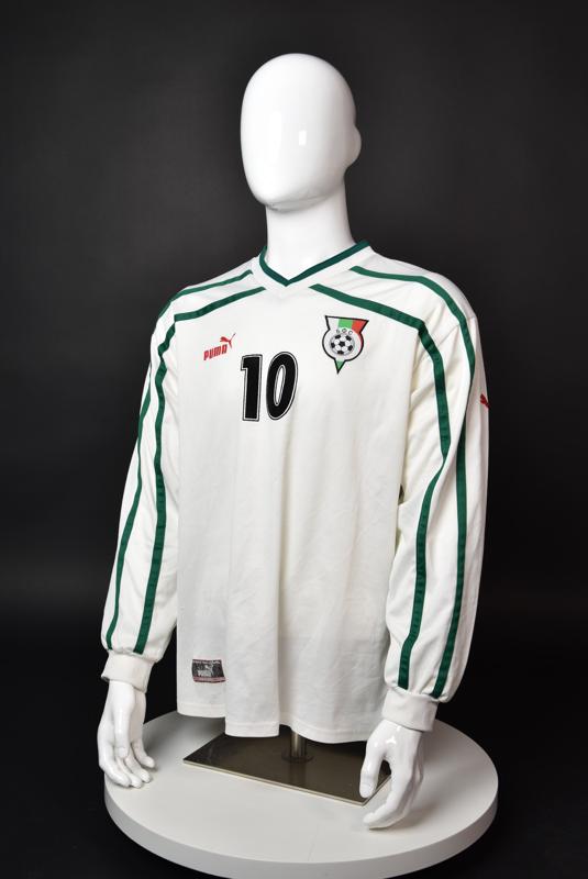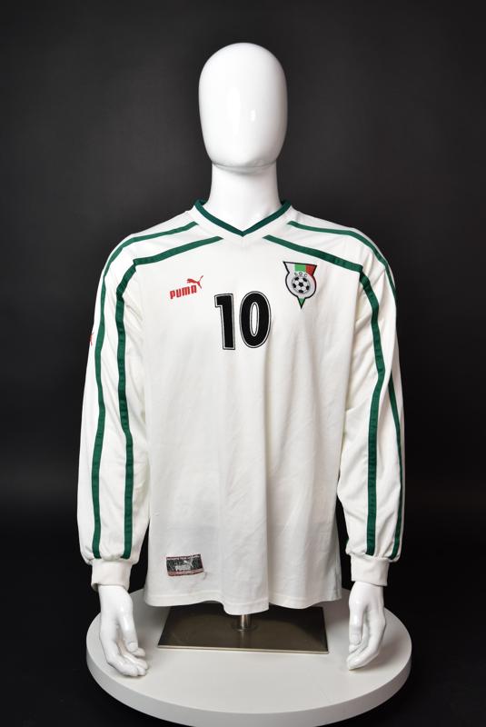 Bulgaria shirt issued to Krasimir Balakov for the 2002 FIFA World Cup Qualifiers. This is a special shirt as Bulgaria only wore black coloured printings in the last three games of the qualifying group - away games at Malta and Czechia and the home match against Denmark. Balakov, however, wore short sleeve shirts in these games. For the rest of the games the colour of the shirt number printings is red. The former attacking midfilder made 92 appearances for the national team between 1988 and 2003 (one of the best totals in national history) and scored 16 goals. He is a bronze medalist from the 1994 FIFA World Cup and was voted to the World Cup All-Star team.