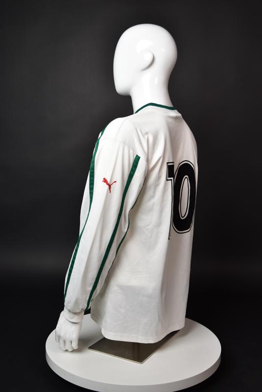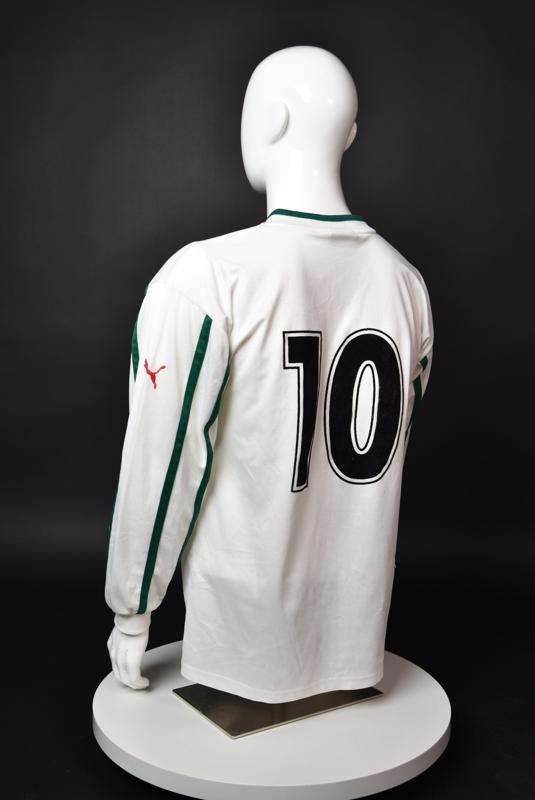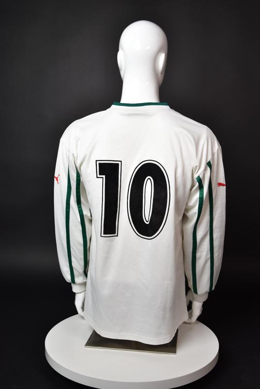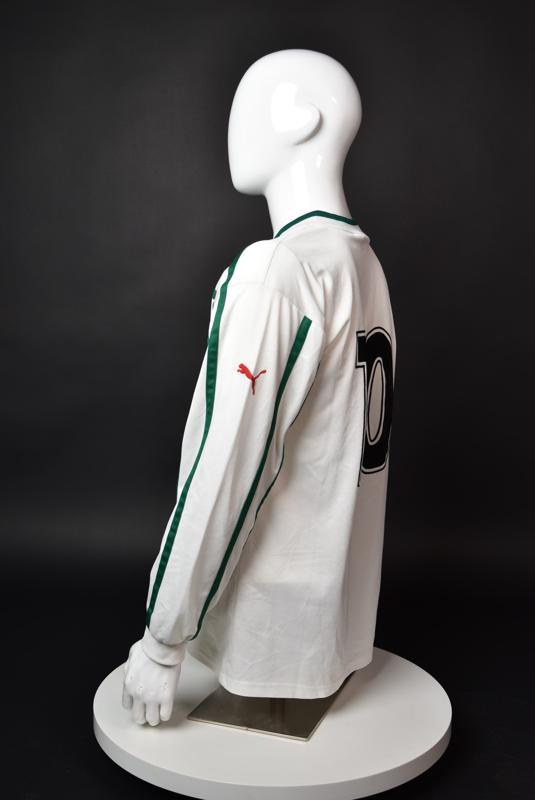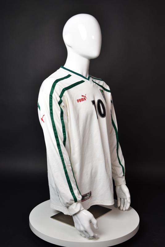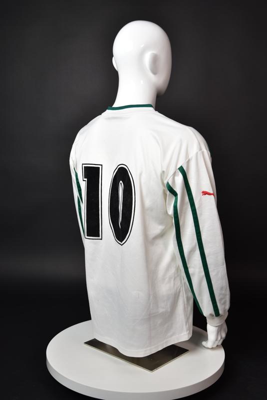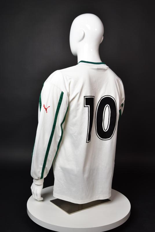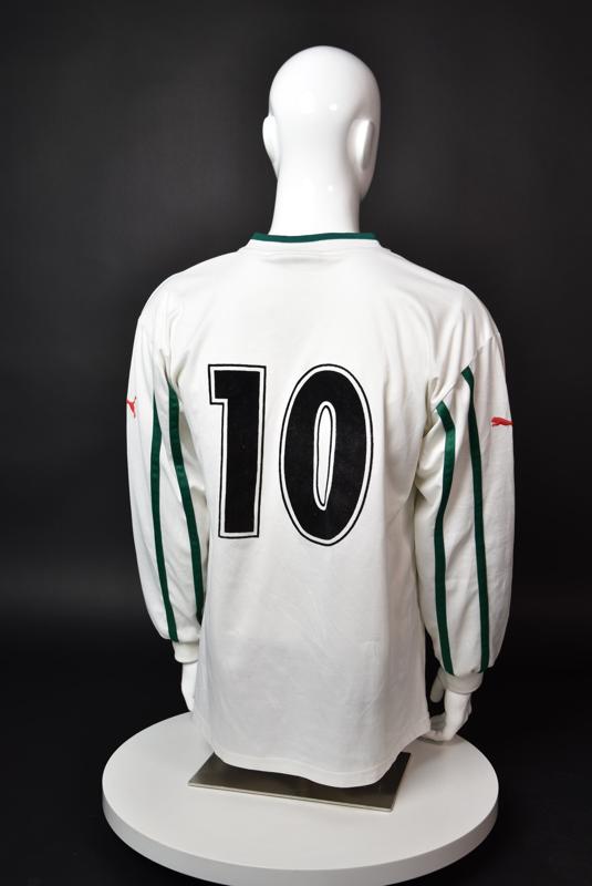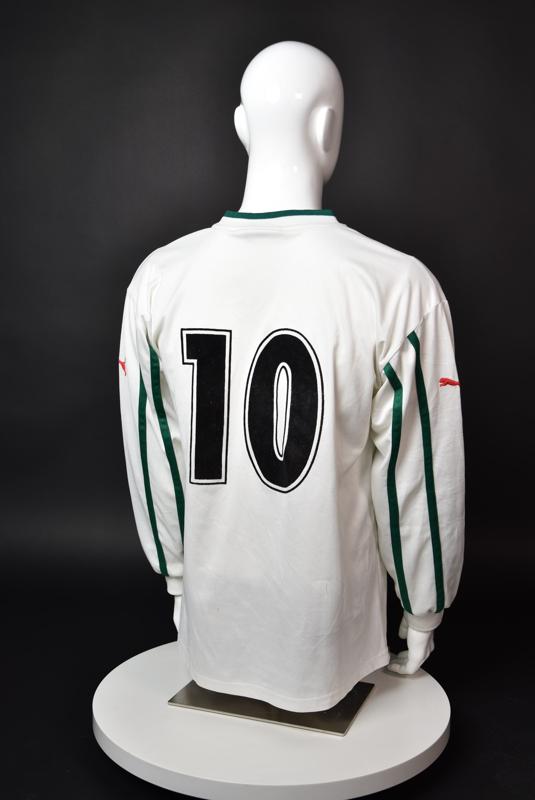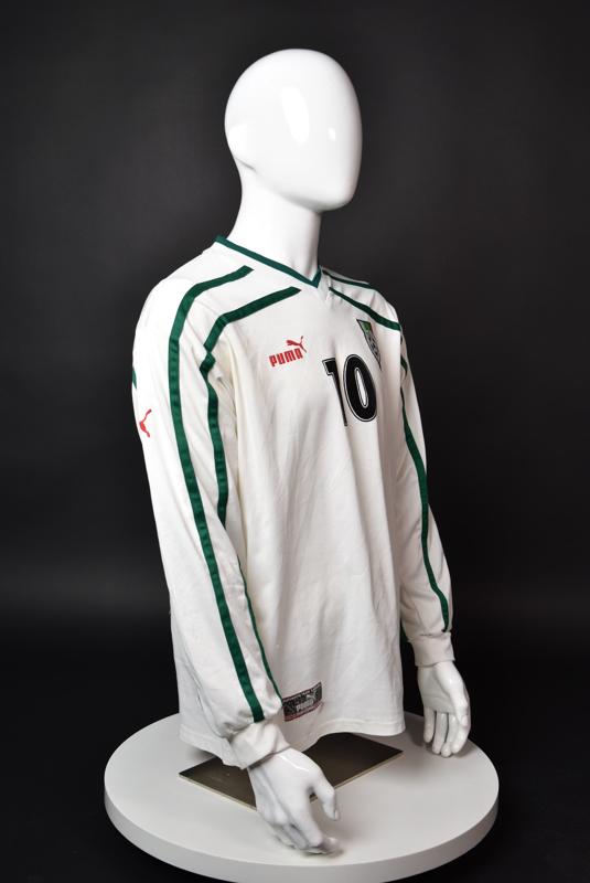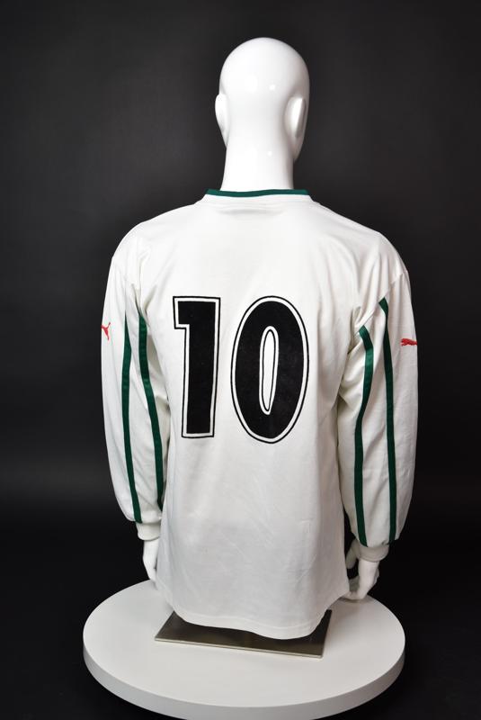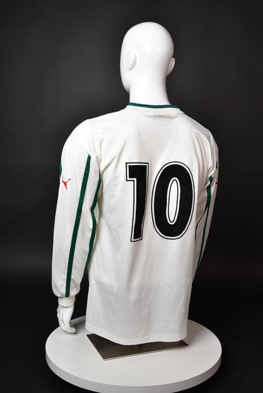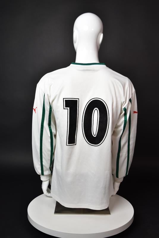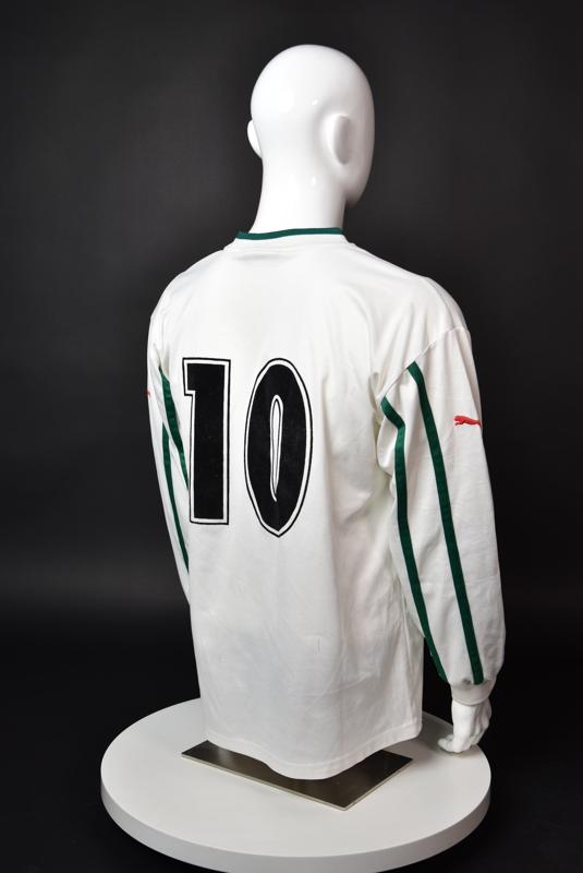 Bulgaria shirt issued to Krasimir Balakov for the 2002 FIFA World Cup Qualifiers. This is a special shirt as Bulgaria only wore black coloured printings in the last three games of the qualifying group - away games at Malta and Czechia and the home match against Denmark. Balakov, however, wore short sleeve shirts in these games. For the rest of the games the colour of the shirt number printings is red. The former attacking midfilder made 92 appearances for the national team between 1988 and 2003 (one of the best totals in national history) and scored 16 goals. He is a bronze medalist from the 1994 FIFA World Cup and was voted to the World Cup All-Star team.