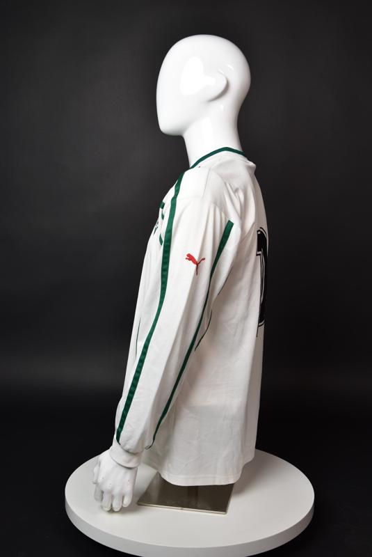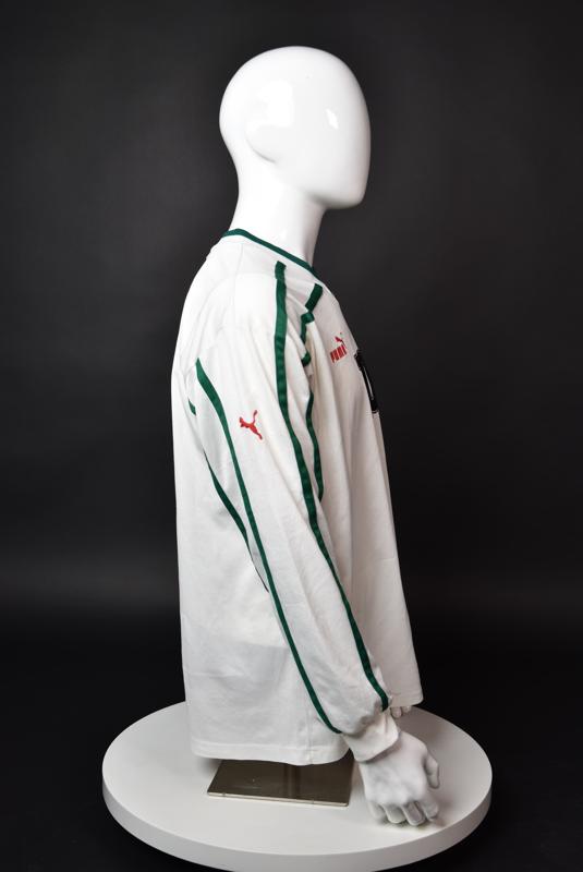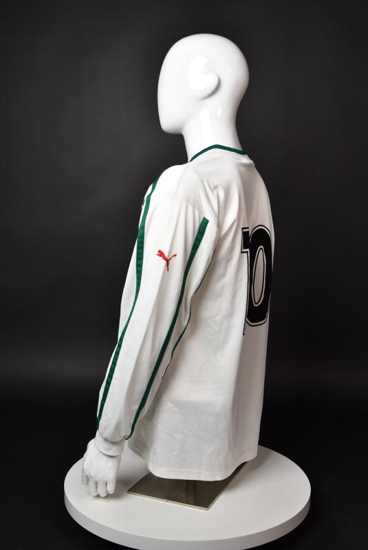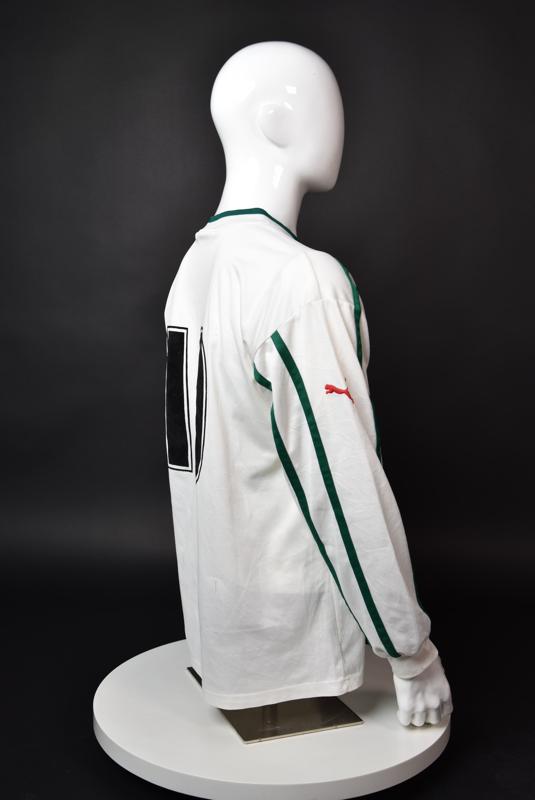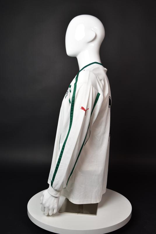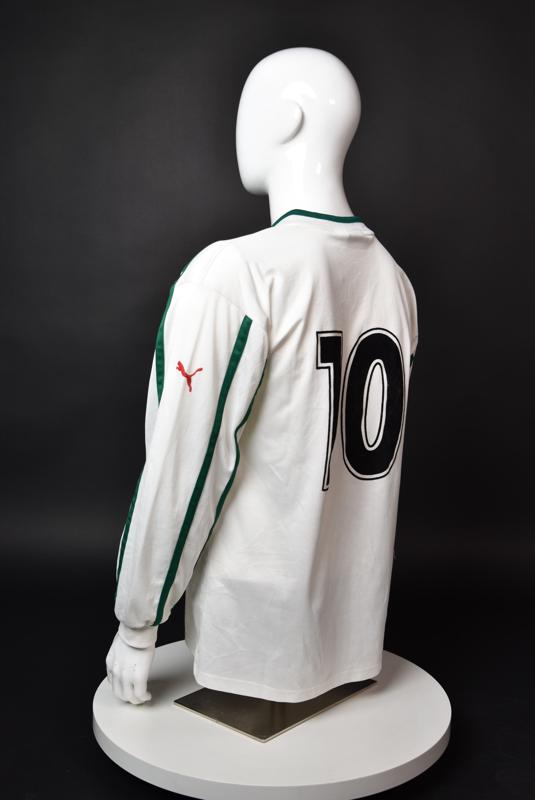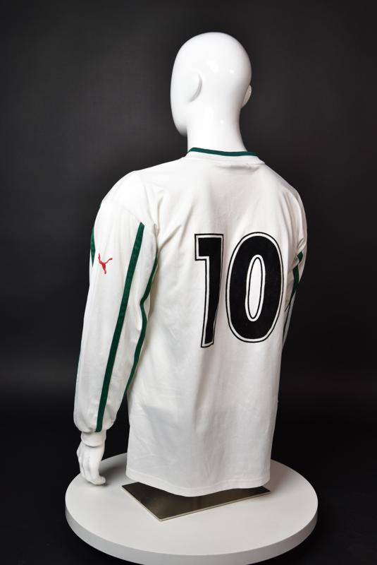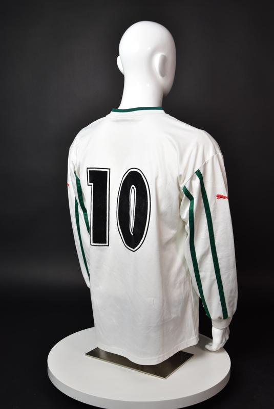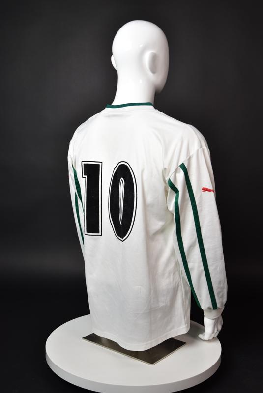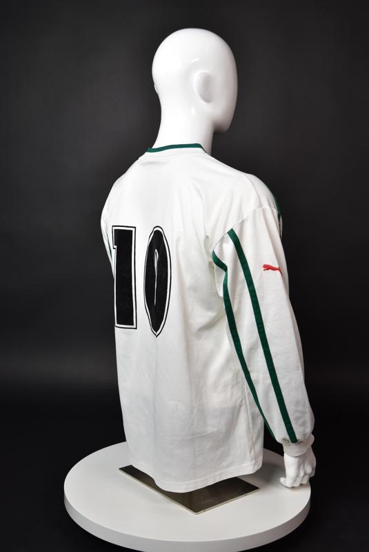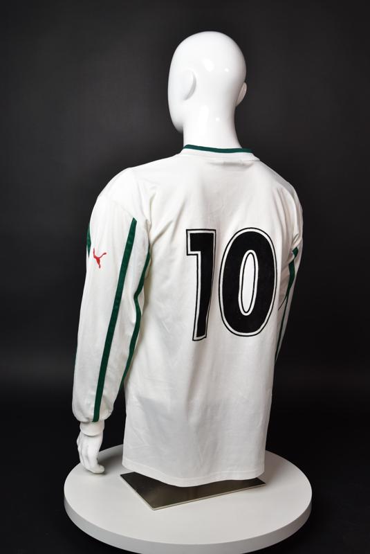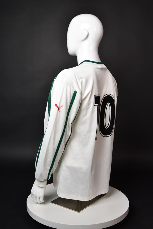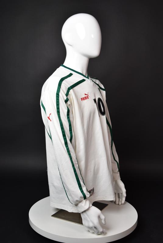 Bulgaria shirt issued to Krasimir Balakov for the 2002 FIFA World Cup Qualifiers. This is a special shirt as Bulgaria only wore black coloured printings in the last three games of the qualifying group - away games at Malta and Czechia and the home match against Denmark. Balakov, however, wore short sleeve shirts in these games. For the rest of the games the colour of the shirt number printings is red. The former attacking midfilder made 92 appearances for the national team between 1988 and 2003 (one of the best totals in national history) and scored 16 goals. He is a bronze medalist from the 1994 FIFA World Cup and was voted to the World Cup All-Star team.