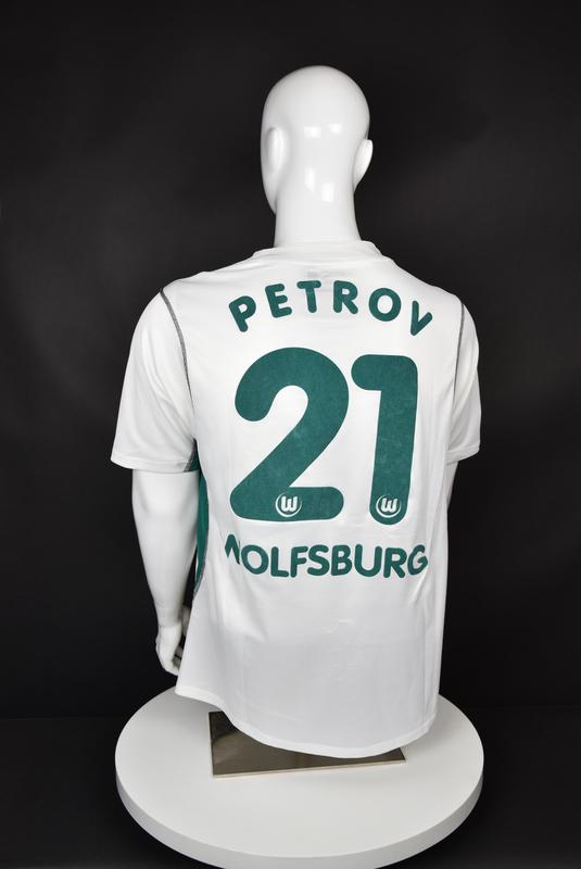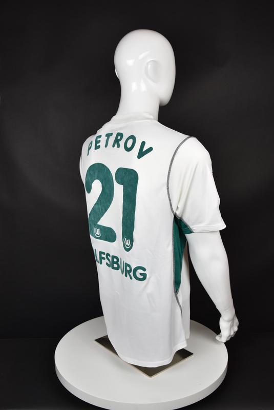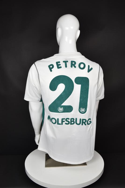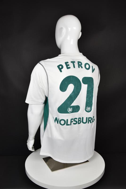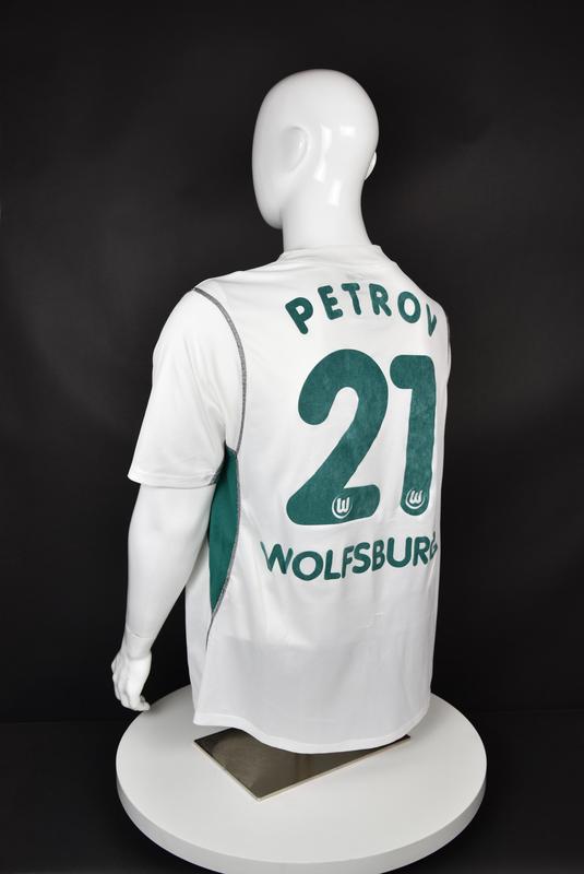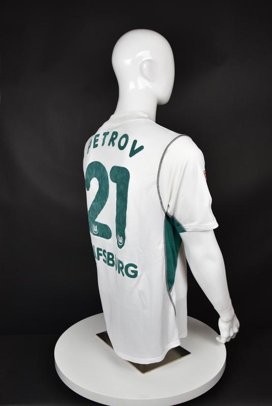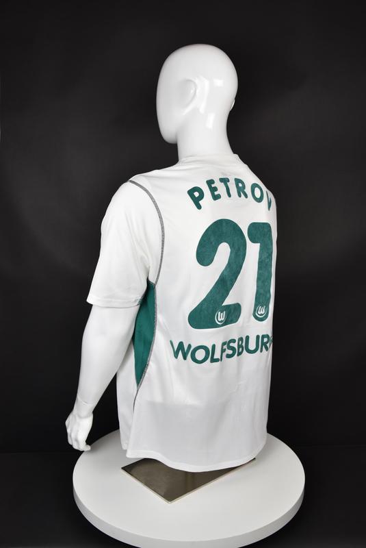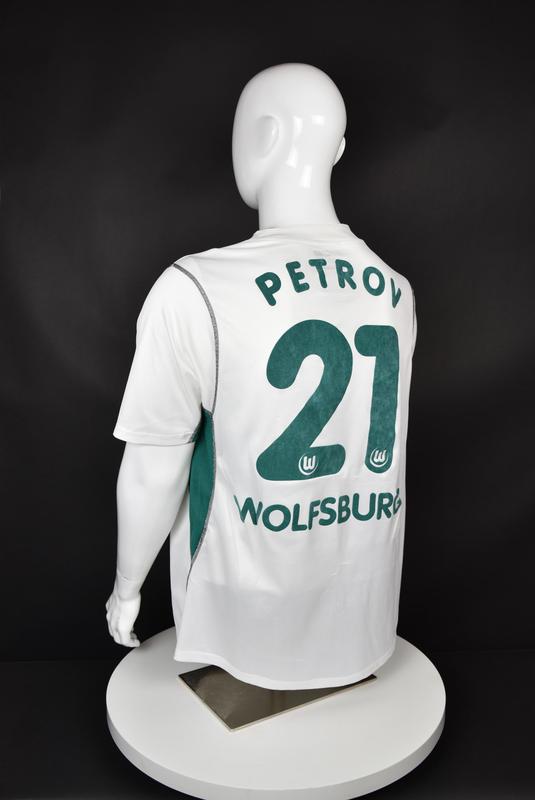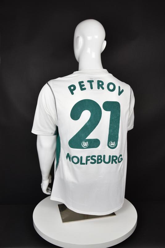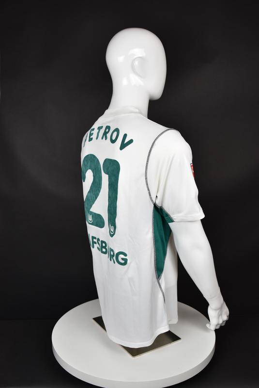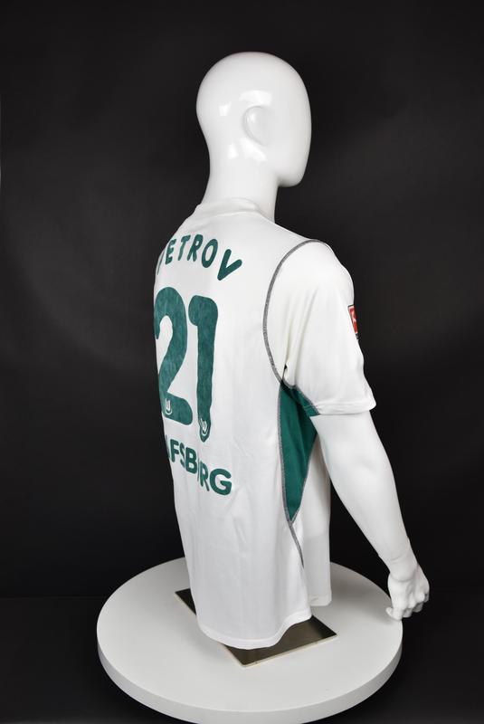 Wolfsburg shirt worn by Martin Petrov during the 2002/2003 season. The former Bulgarian International winger went on to make 137 appearances for the Bundesliga side in the period 2001-2005, scoring 40 goals. Petrov earned 90 caps for the national team, scoring 19 goals. He was part of the squad at the 2004 European Championship in Portugal, excelling in all three games and scoring Bulgaria's only goal at the finals - a penalty against Italy in the 1:2 loss. Petrov has won the League title and the League cup of both Bulgarian and Swiss championships, with CSKA Sofia and Servette Geneva, respectively. In 2006, he was voted the Bulgarian Footballer of the Year award.