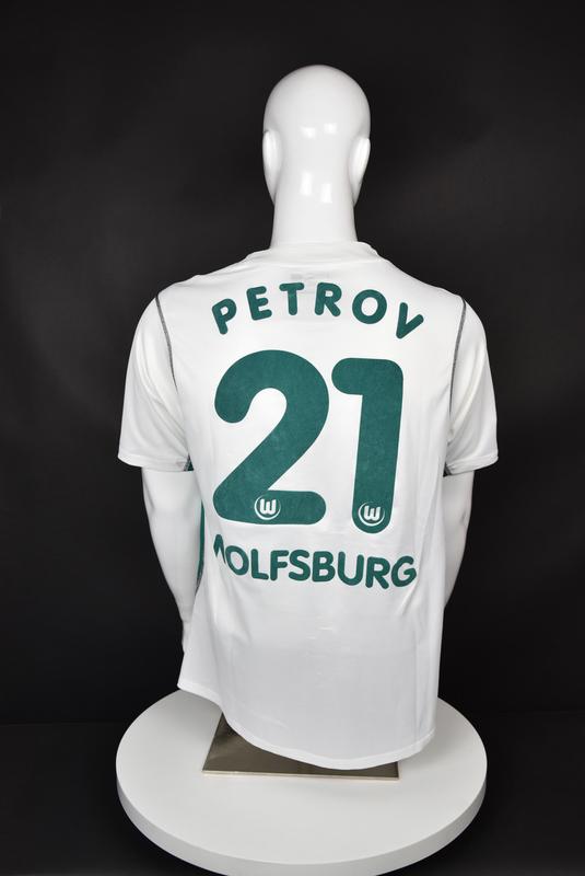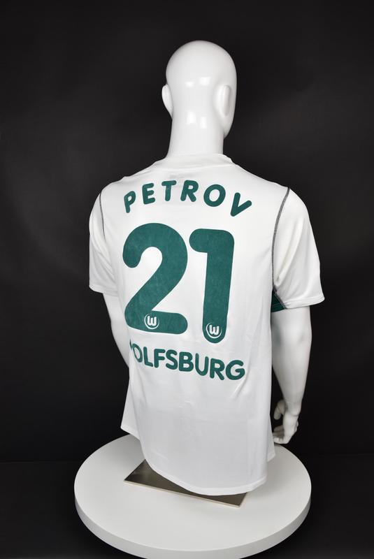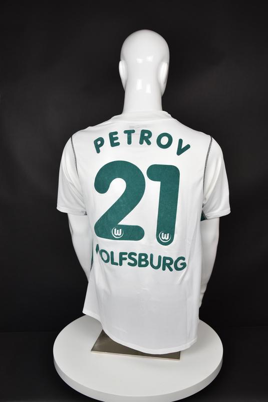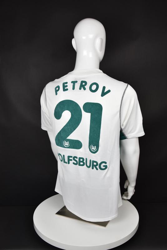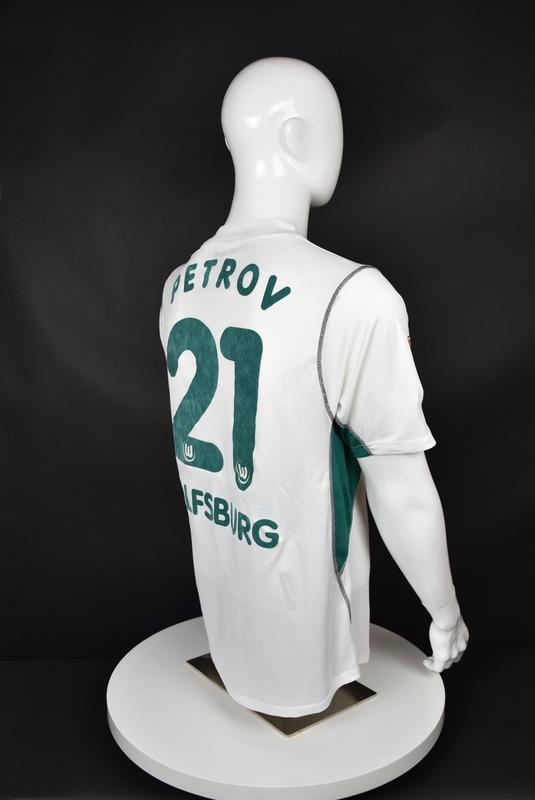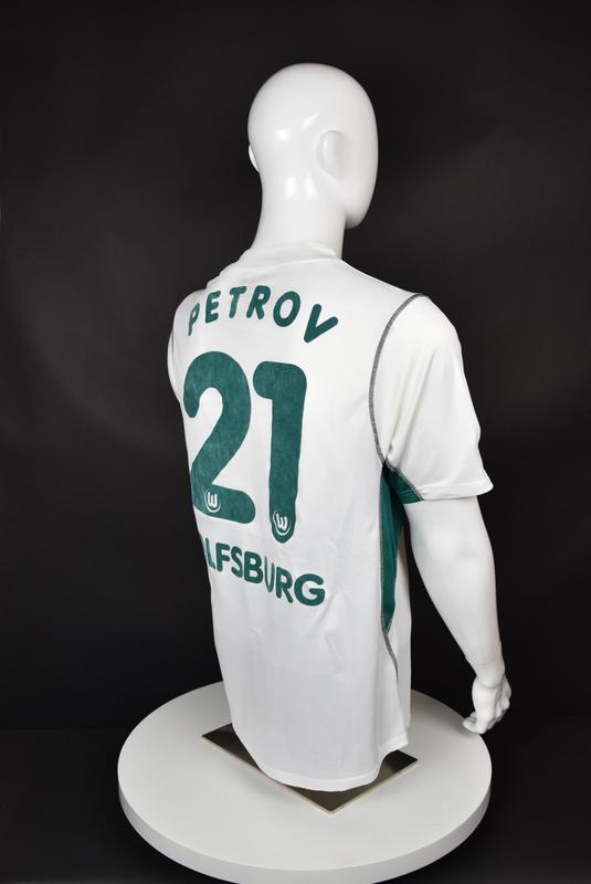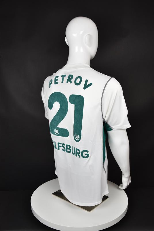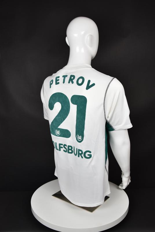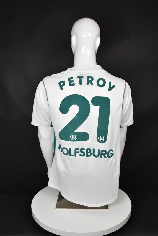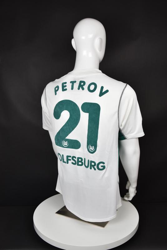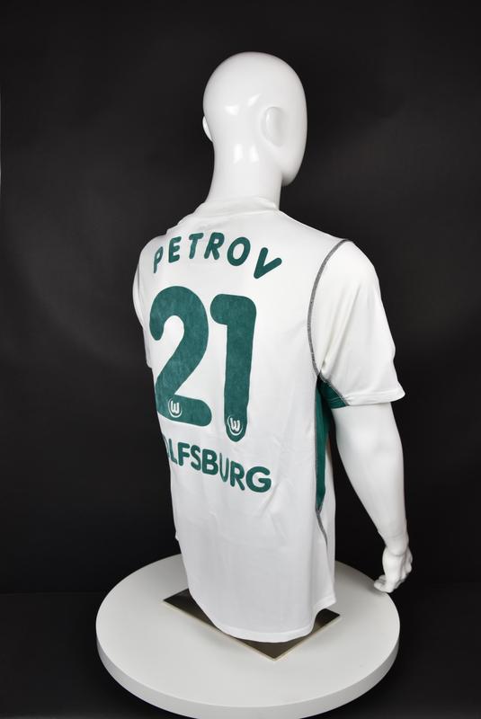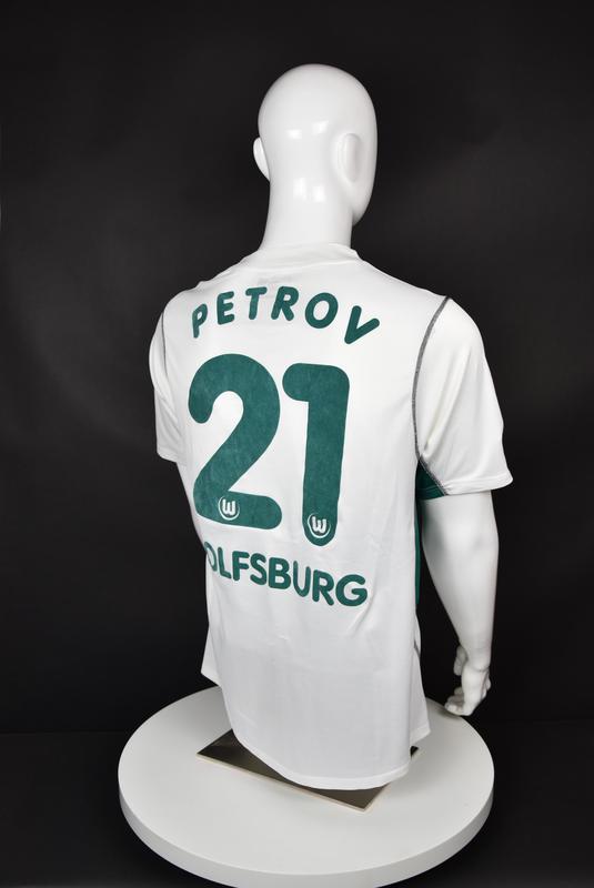 Wolfsburg shirt worn by Martin Petrov during the 2002/2003 season. The former Bulgarian International winger went on to make 137 appearances for the Bundesliga side in the period 2001-2005, scoring 40 goals. Petrov earned 90 caps for the national team, scoring 19 goals. He was part of the squad at the 2004 European Championship in Portugal, excelling in all three games and scoring Bulgaria's only goal at the finals - a penalty against Italy in the 1:2 loss. Petrov has won the League title and the League cup of both Bulgarian and Swiss championships, with CSKA Sofia and Servette Geneva, respectively. In 2006, he was voted the Bulgarian Footballer of the Year award.
