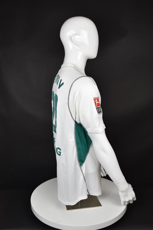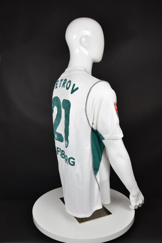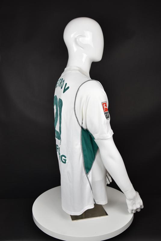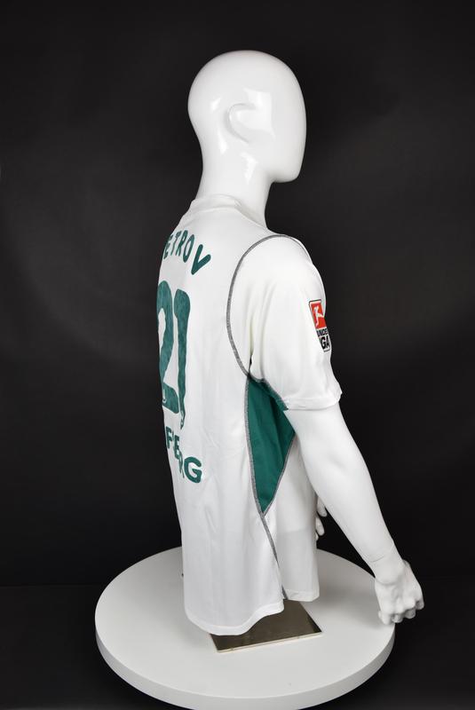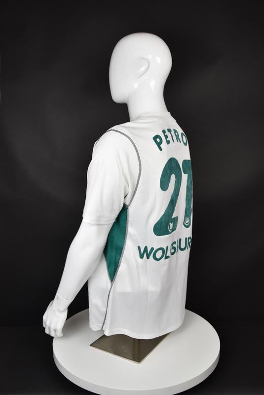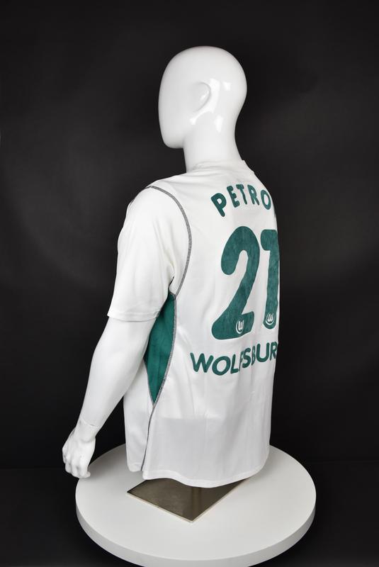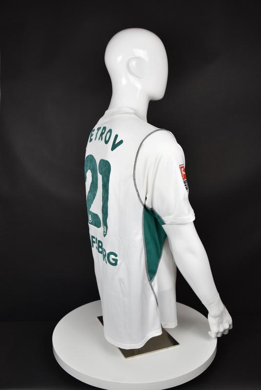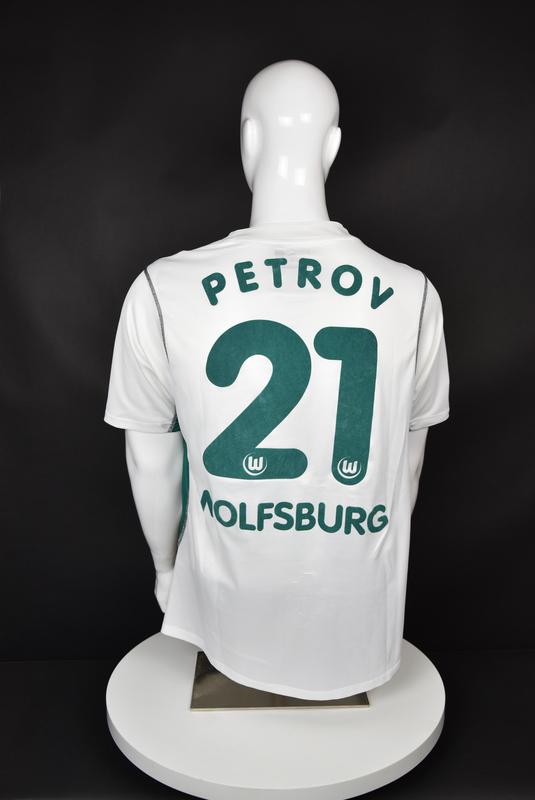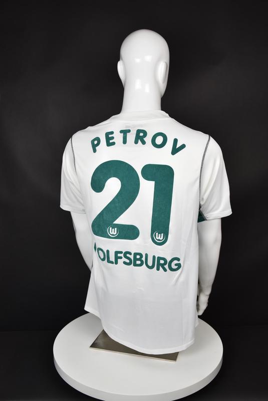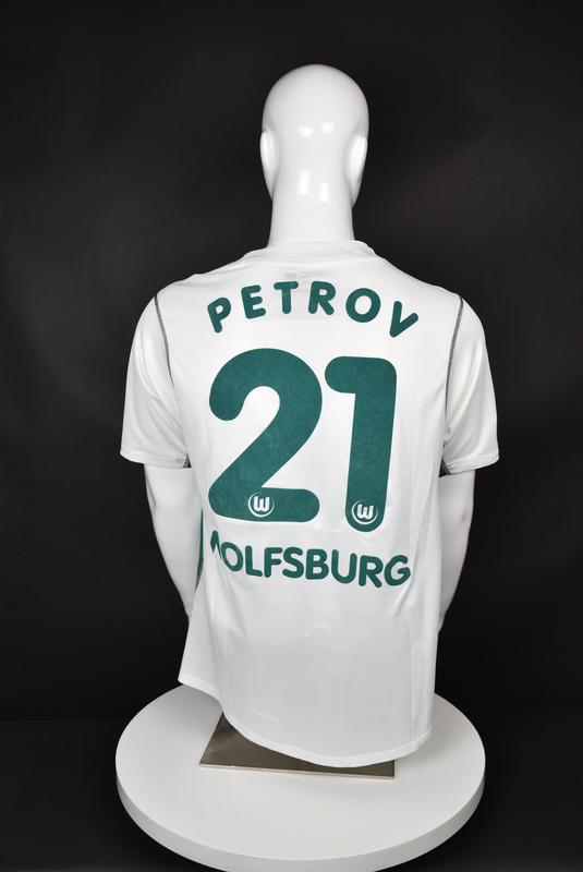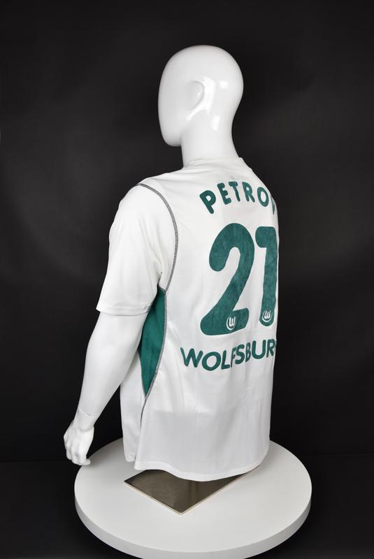 Wolfsburg shirt worn by Martin Petrov during the 2002/2003 season. The former Bulgarian International winger went on to make 137 appearances for the Bundesliga side in the period 2001-2005, scoring 40 goals. Petrov earned 90 caps for the national team, scoring 19 goals. He was part of the squad at the 2004 European Championship in Portugal, excelling in all three games and scoring Bulgaria's only goal at the finals - a penalty against Italy in the 1:2 loss. Petrov has won the League title and the League cup of both Bulgarian and Swiss championships, with CSKA Sofia and Servette Geneva, respectively. In 2006, he was voted the Bulgarian Footballer of the Year award.