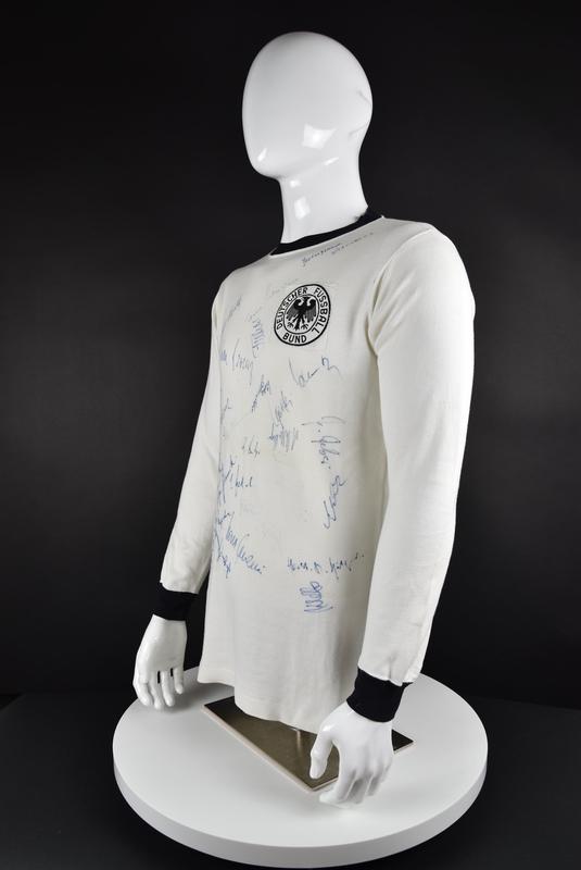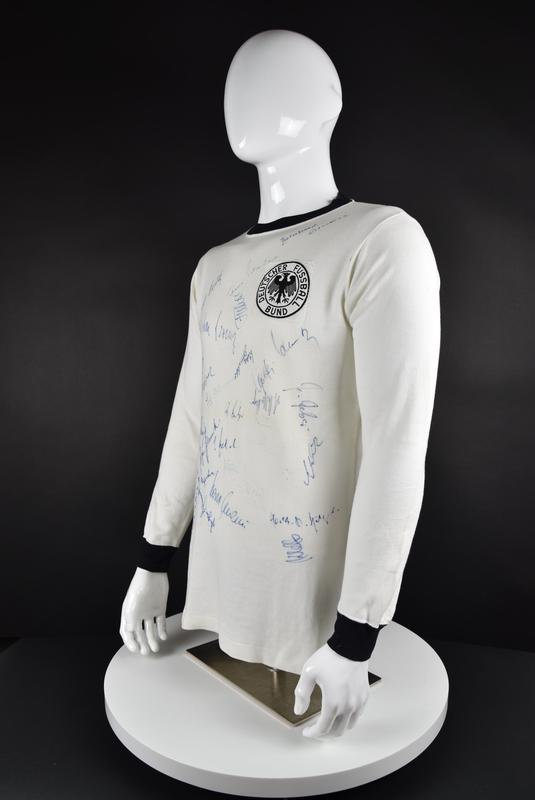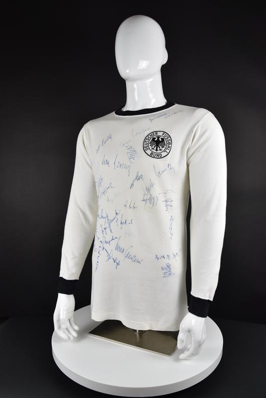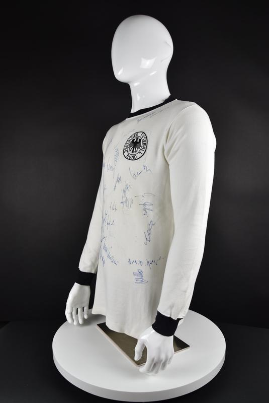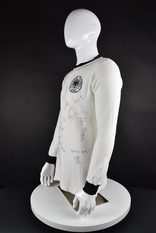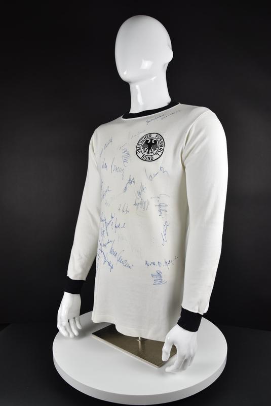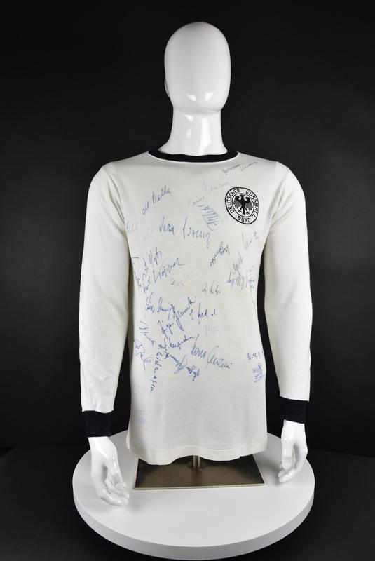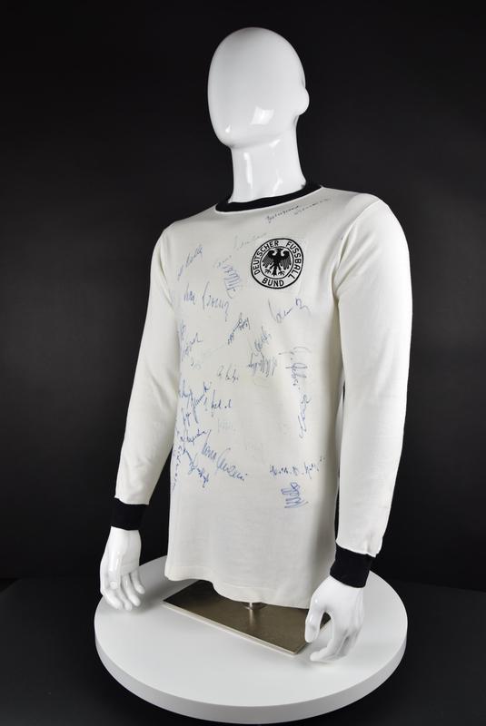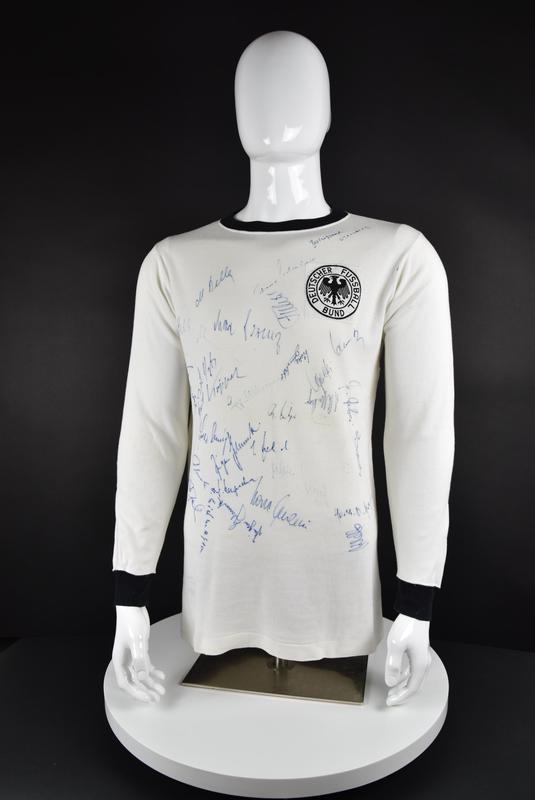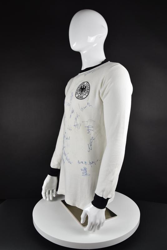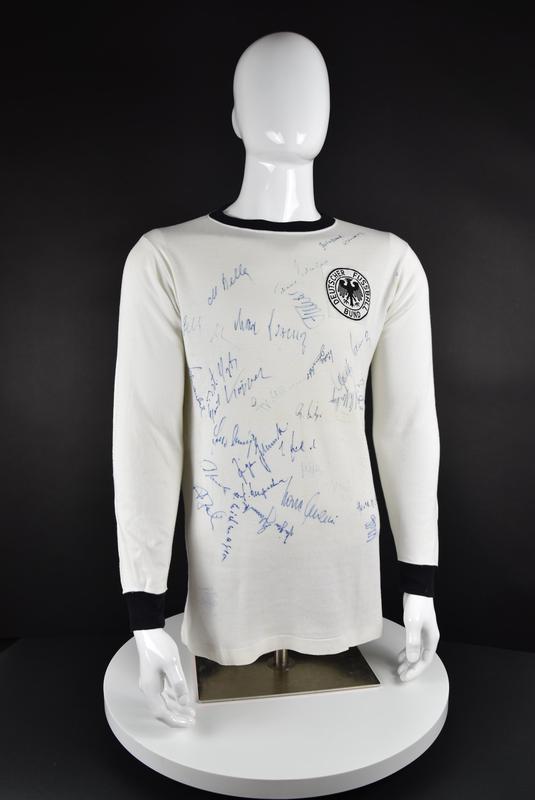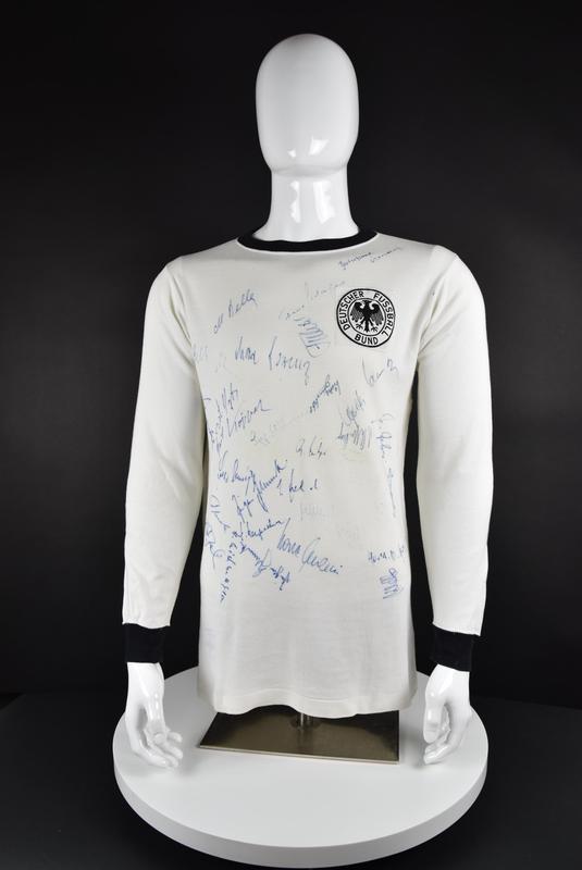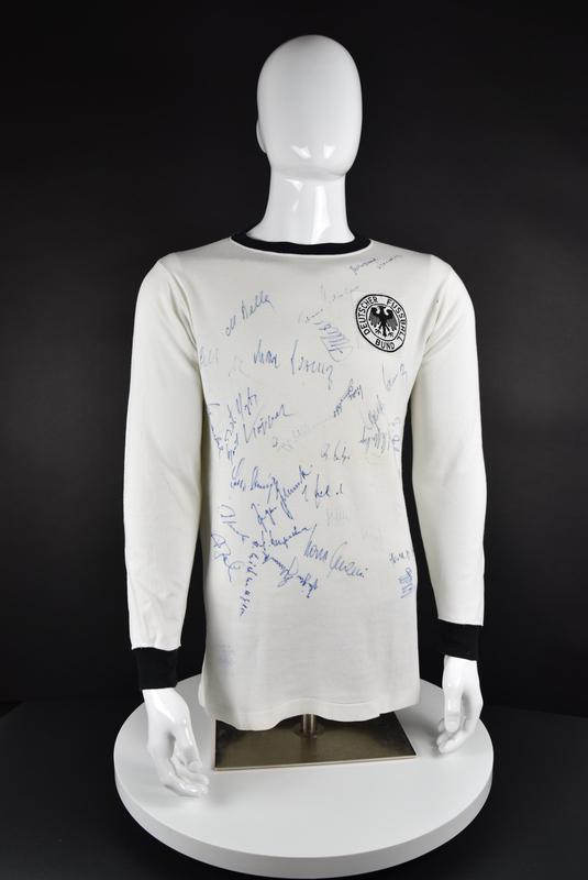 Germany (BRD) shirt believed to have been worn by Gerd Muller in an International friendly match against the USSR (4:1). Game played at the official opening of "Olympiastadion" in Munich on May 26, 1972. "Der Bomber" scored all 4 goals against the Soviets. Shirt is signed by the entire 1972 squad and is gifted by Franz Beckenbauer to a Bayern Munich team's doctor. At International level with West Germany, Muller scored the incredible 68 goals in 62 appearances, and at club level, in 15 years with Bayern Munich, he scored 398 goals. "Der Bomber" is World (1974) and European (1972) champion with West Germany. He won "Ballon d'Or" in 1970 when he scored ten goals at the 1970 FIFA World Cup in Mexico. He won three European Cups in a row with Bayern Munich (1974, 1975, 1976).