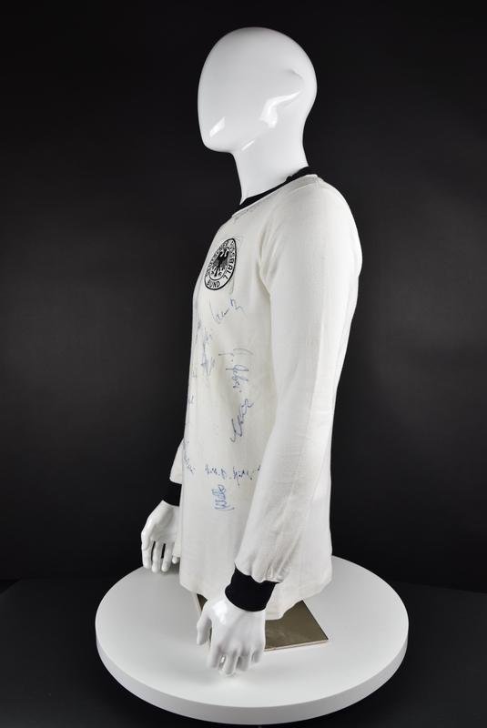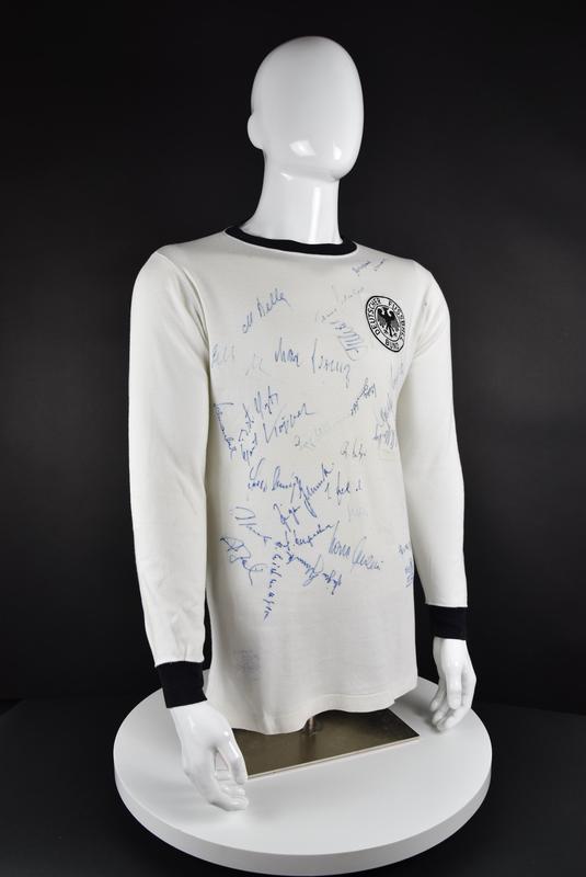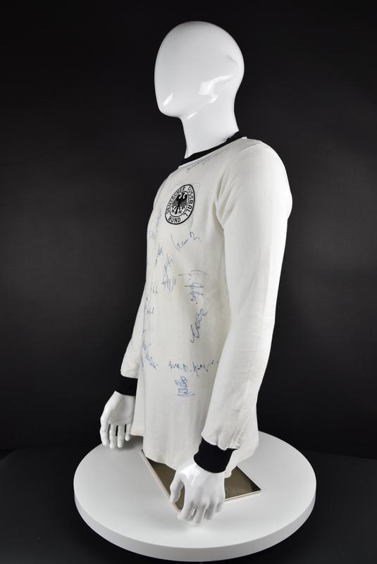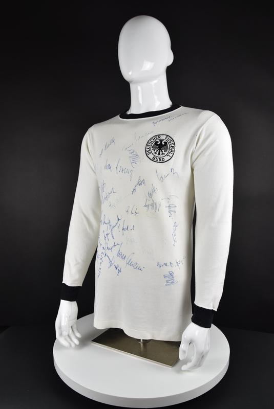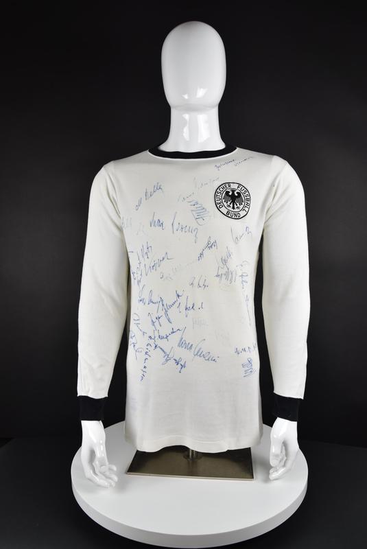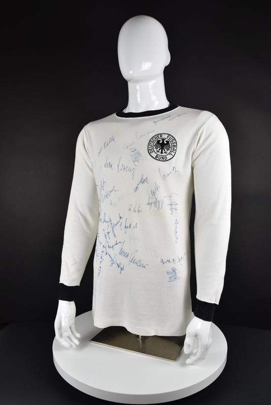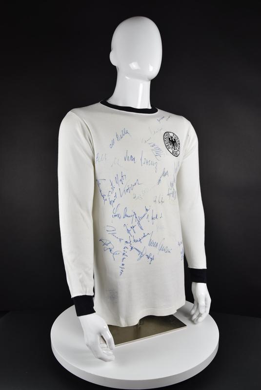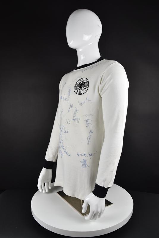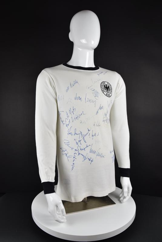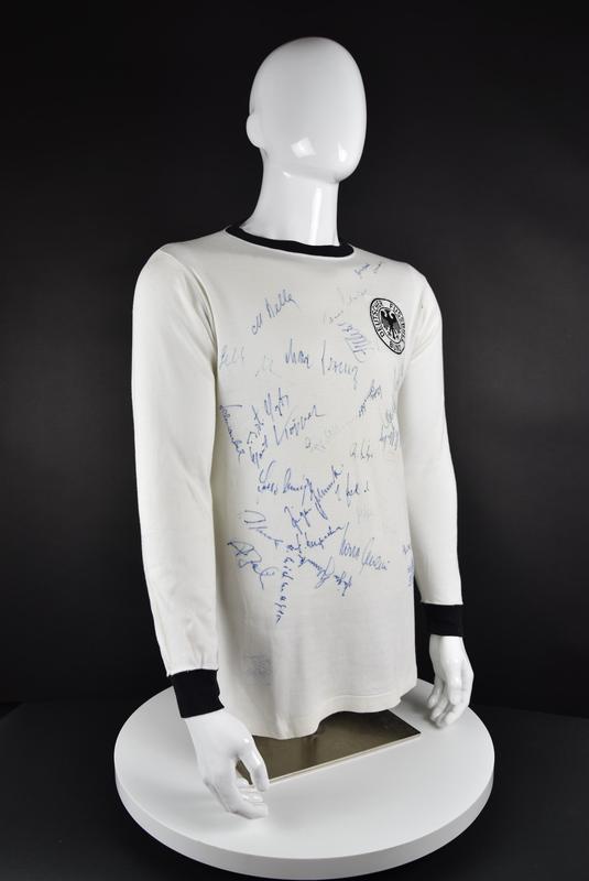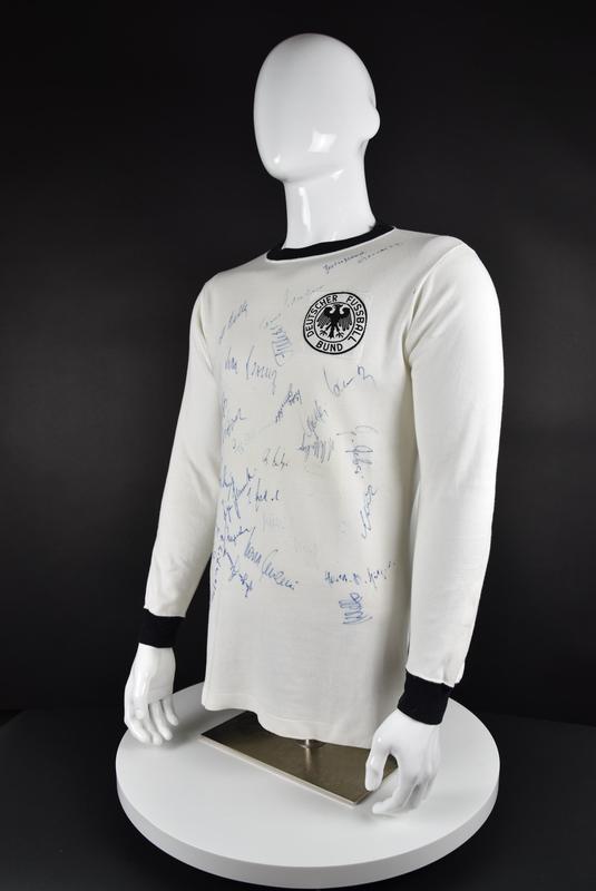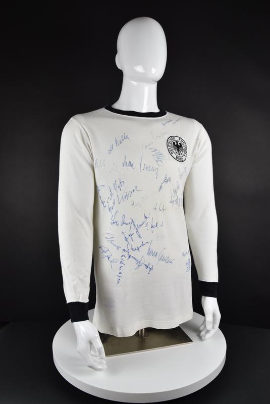 Germany (BRD) shirt believed to have been worn by Gerd Muller in an International friendly match against the USSR (4:1). Game played at the official opening of "Olympiastadion" in Munich on May 26, 1972. "Der Bomber" scored all 4 goals against the Soviets. Shirt is signed by the entire 1972 squad and is gifted by Franz Beckenbauer to a Bayern Munich team's doctor. At International level with West Germany, Muller scored the incredible 68 goals in 62 appearances, and at club level, in 15 years with Bayern Munich, he scored 398 goals. "Der Bomber" is World (1974) and European (1972) champion with West Germany. He won "Ballon d'Or" in 1970 when he scored ten goals at the 1970 FIFA World Cup in Mexico. He won three European Cups in a row with Bayern Munich (1974, 1975, 1976).