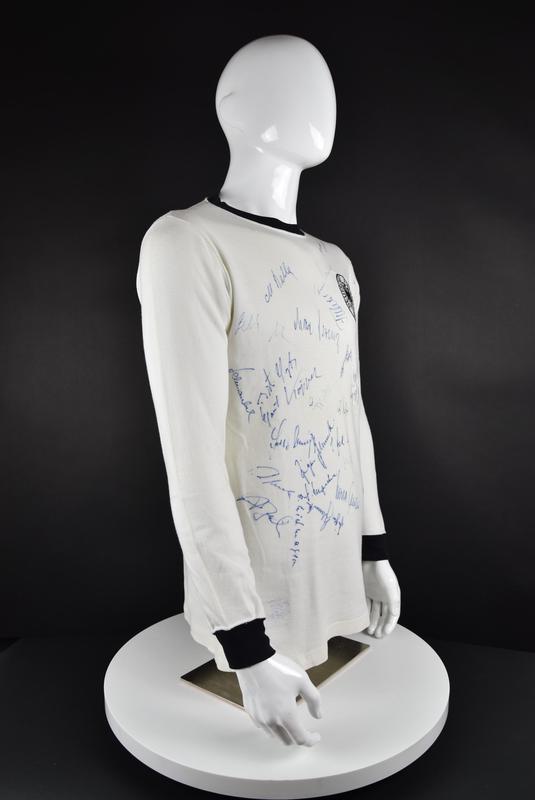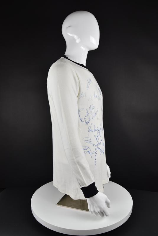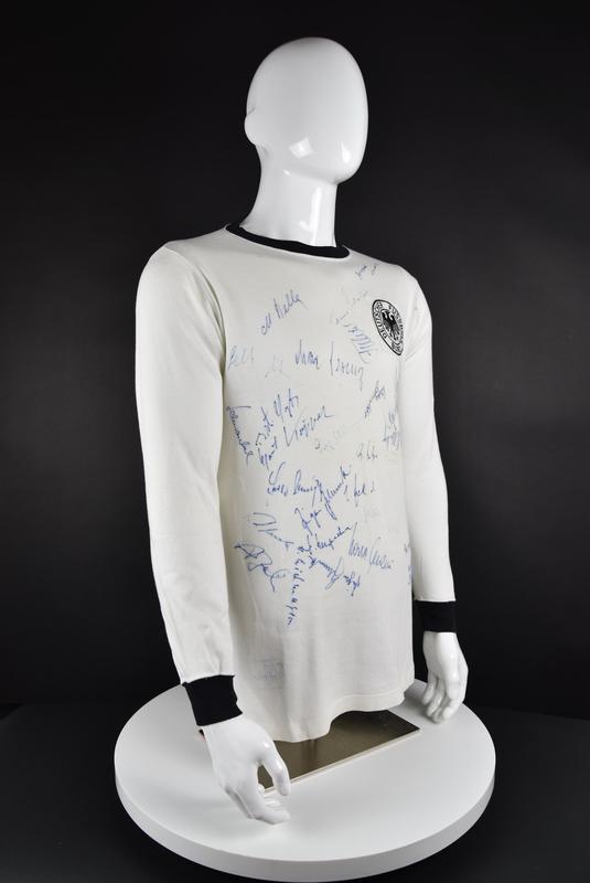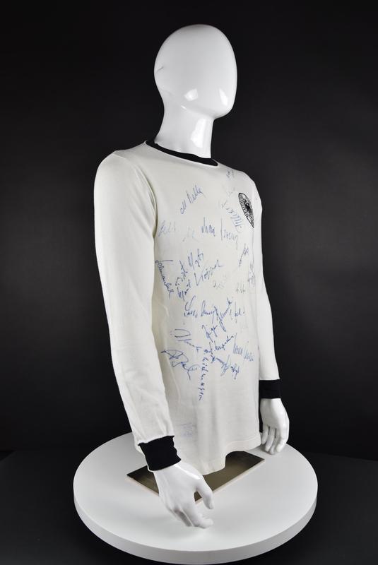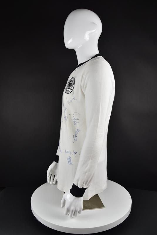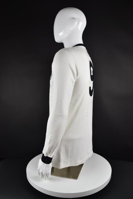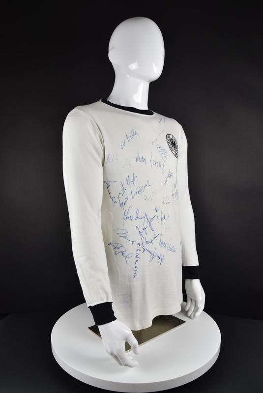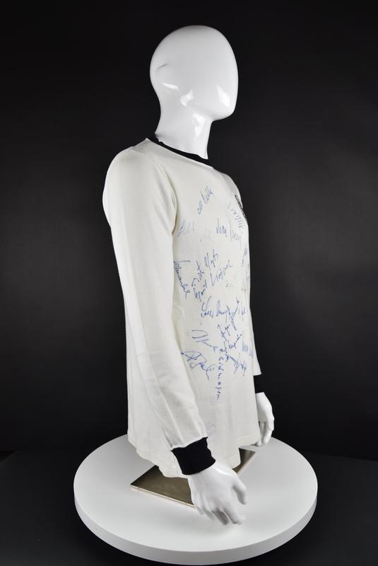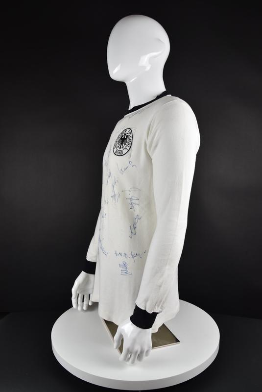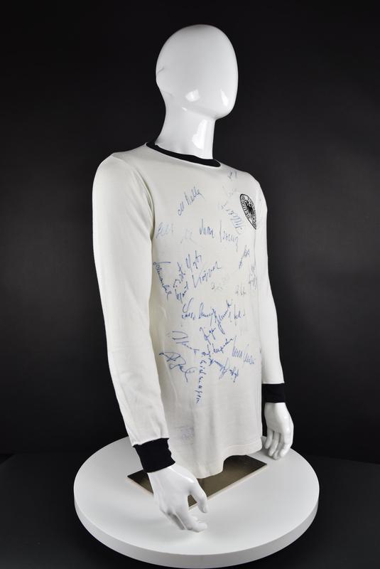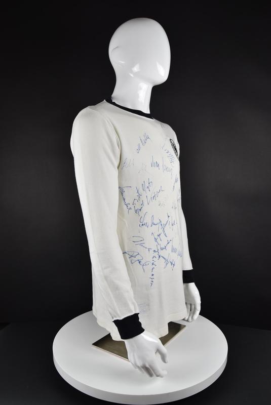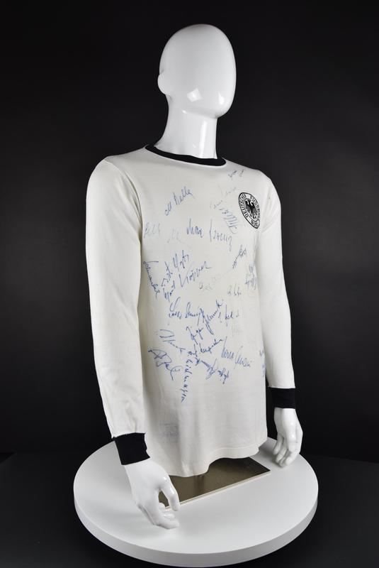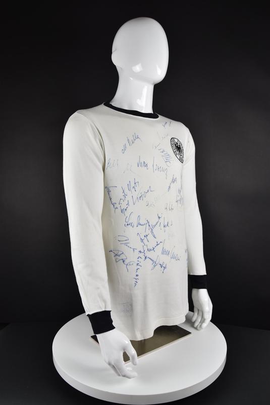 Germany (BRD) shirt believed to have been worn by Gerd Muller in an International friendly match against the USSR (4:1). Game played at the official opening of "Olympiastadion" in Munich on May 26, 1972. "Der Bomber" scored all 4 goals against the Soviets. Shirt is signed by the entire 1972 squad and is gifted by Franz Beckenbauer to a Bayern Munich team's doctor. At International level with West Germany, Muller scored the incredible 68 goals in 62 appearances, and at club level, in 15 years with Bayern Munich, he scored 398 goals. "Der Bomber" is World (1974) and European (1972) champion with West Germany. He won "Ballon d'Or" in 1970 when he scored ten goals at the 1970 FIFA World Cup in Mexico. He won three European Cups in a row with Bayern Munich (1974, 1975, 1976).