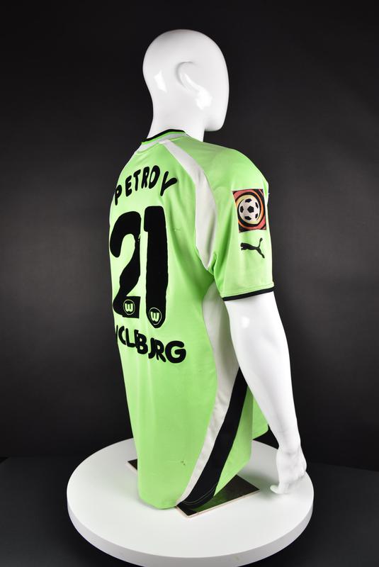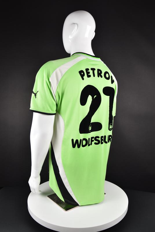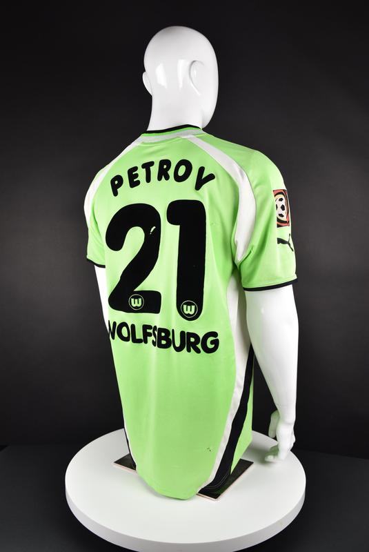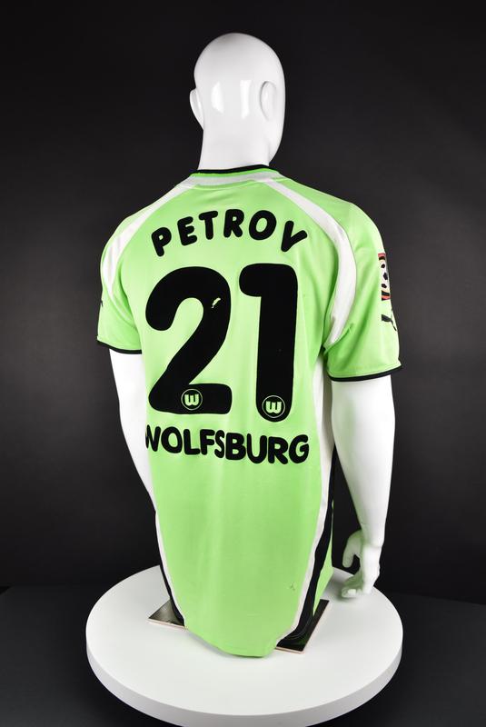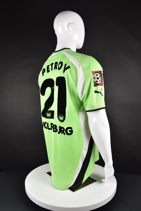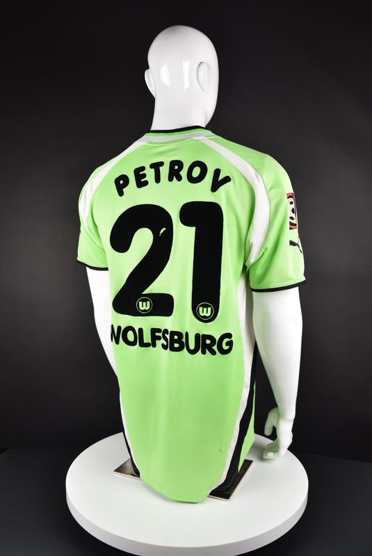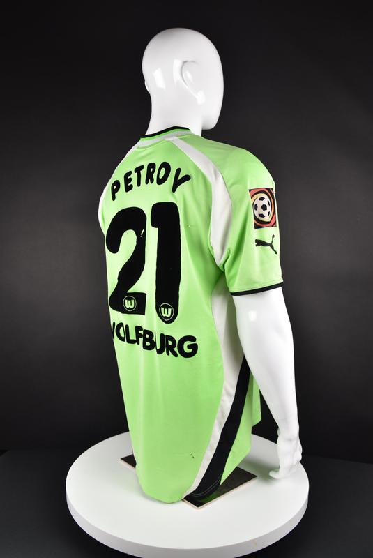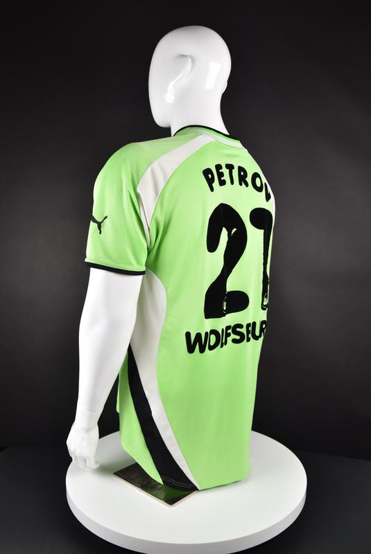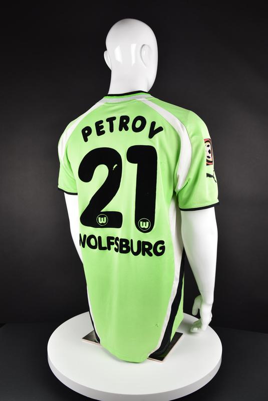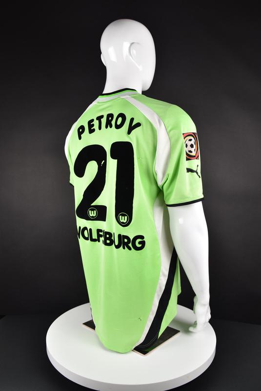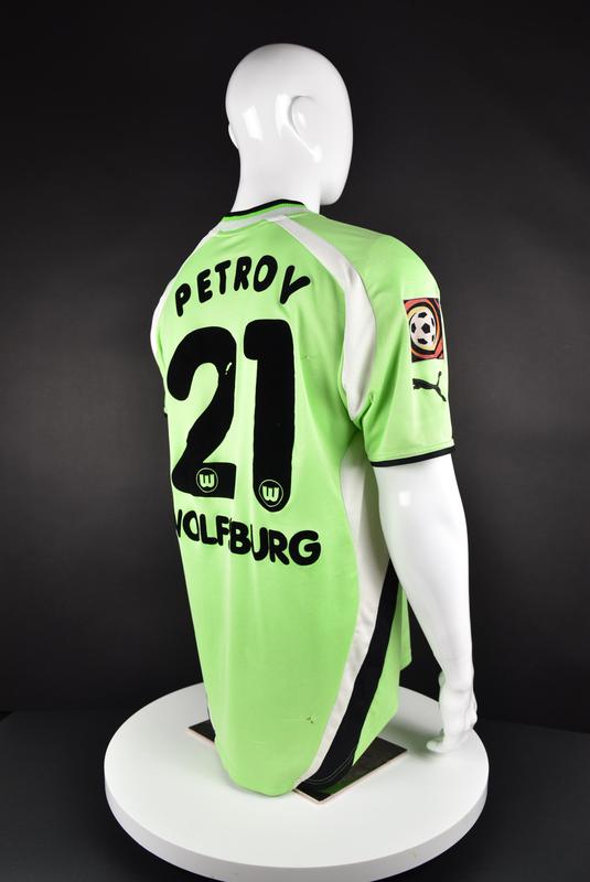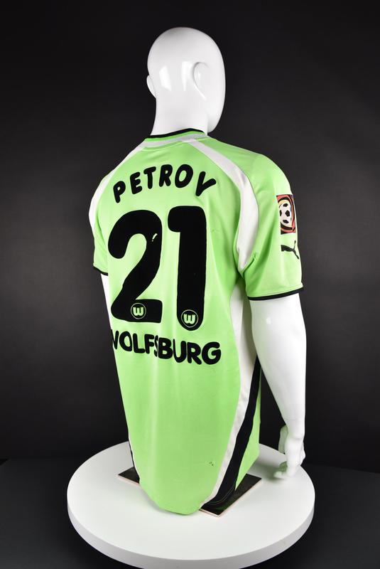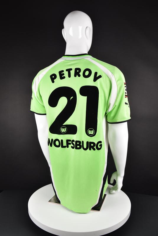 Wolfsburg shirt worn by Martin Petrov during the 2001/2002 season. The former Bulgarian International winger went on to make 137 appearances for the Bundesliga side in the period 2001-2005, scoring 40 goals. Shirt is gifted by the player. Petrov earned 90 caps for the national team, scoring 19 goals. He was part of the squad at the 2004 European Championship in Portugal, excelling in all three games and scoring Bulgaria's only goal at the finals - a penalty against Italy in the 1:2 loss. Petrov has won the League title and the League cup of both Bulgarian and Swiss championships, with CSKA Sofia and Servette Geneva, respectively. In 2006, he was voted the Bulgarian Footballer of the Year award.