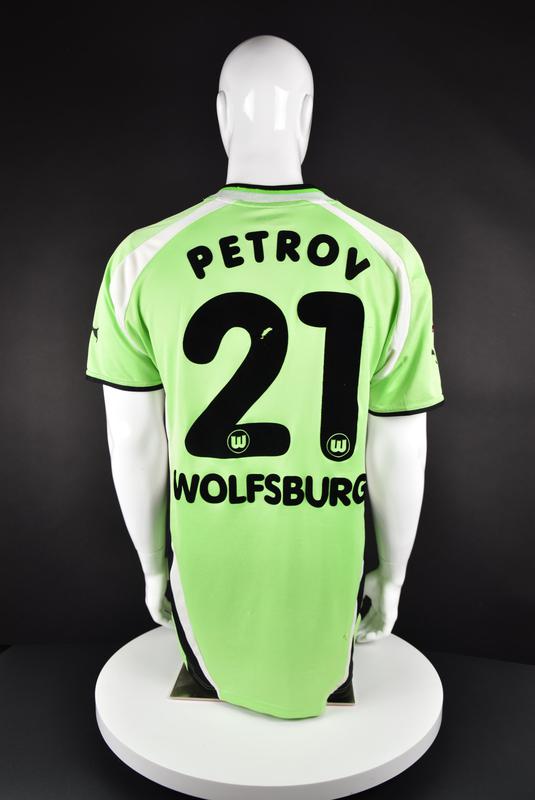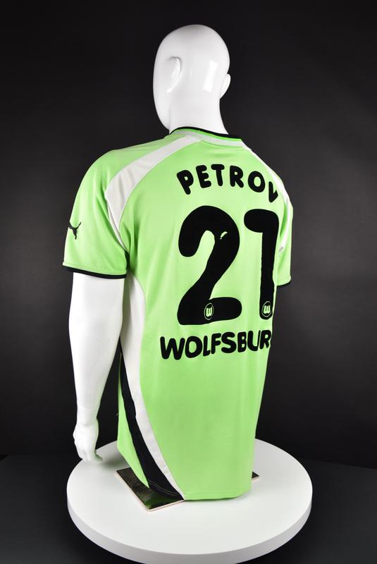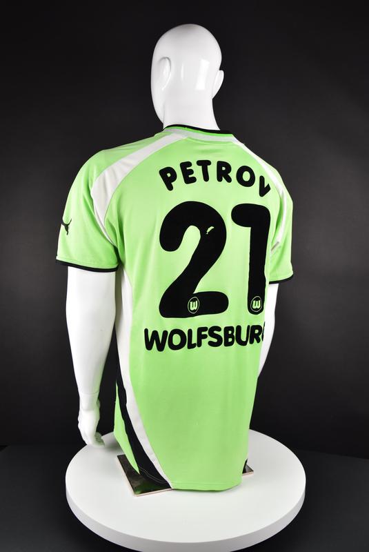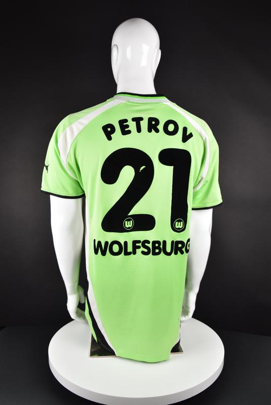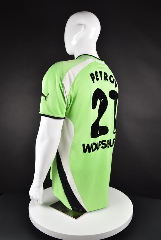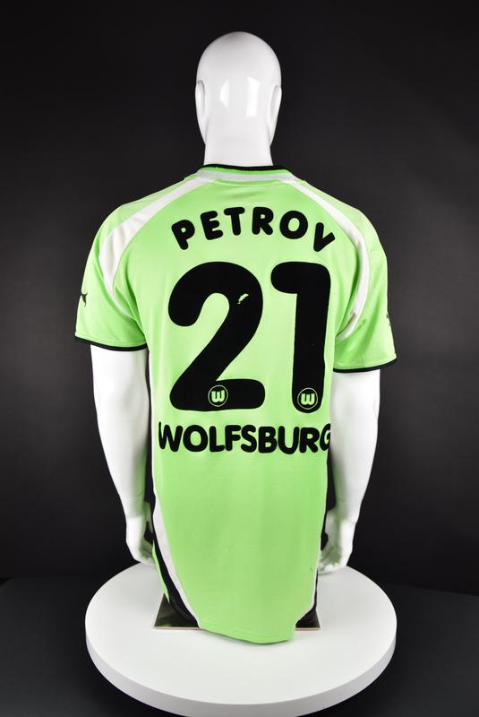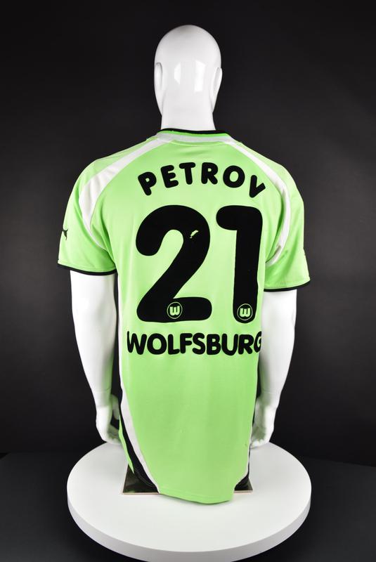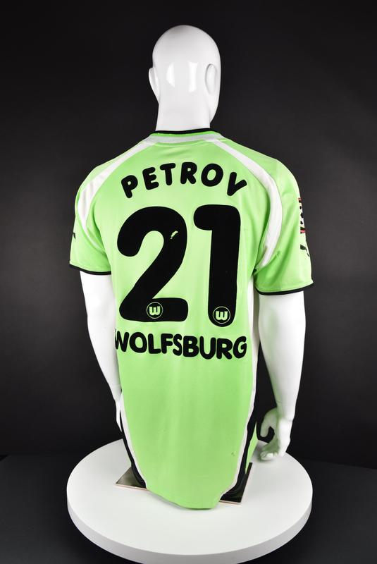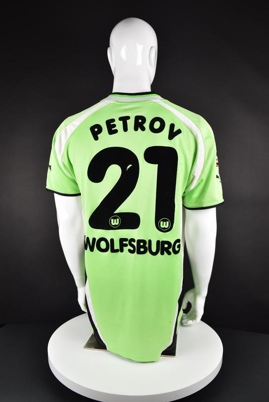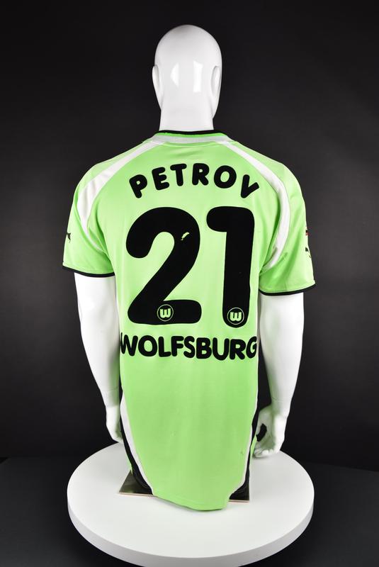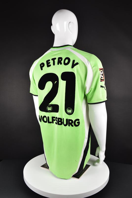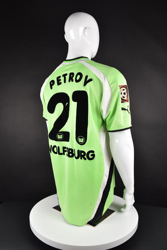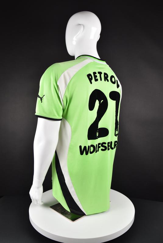 Wolfsburg shirt worn by Martin Petrov during the 2001/2002 season. The former Bulgarian International winger went on to make 137 appearances for the Bundesliga side in the period 2001-2005, scoring 40 goals. Shirt is gifted by the player. Petrov earned 90 caps for the national team, scoring 19 goals. He was part of the squad at the 2004 European Championship in Portugal, excelling in all three games and scoring Bulgaria's only goal at the finals - a penalty against Italy in the 1:2 loss. Petrov has won the League title and the League cup of both Bulgarian and Swiss championships, with CSKA Sofia and Servette Geneva, respectively. In 2006, he was voted the Bulgarian Footballer of the Year award.