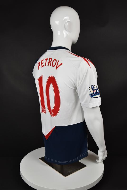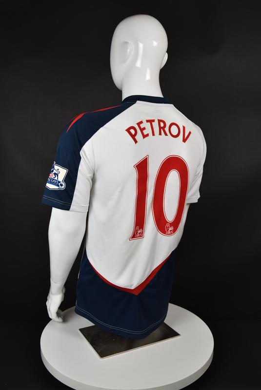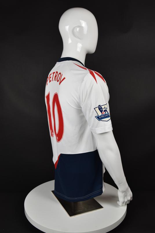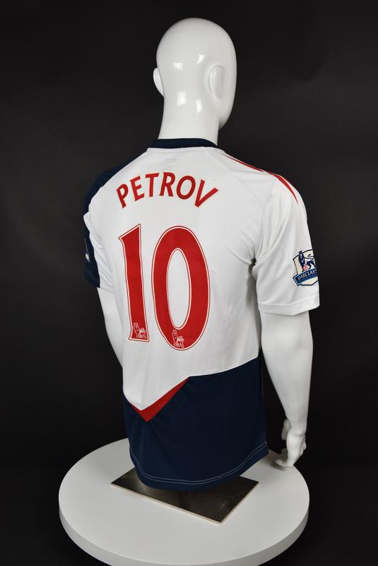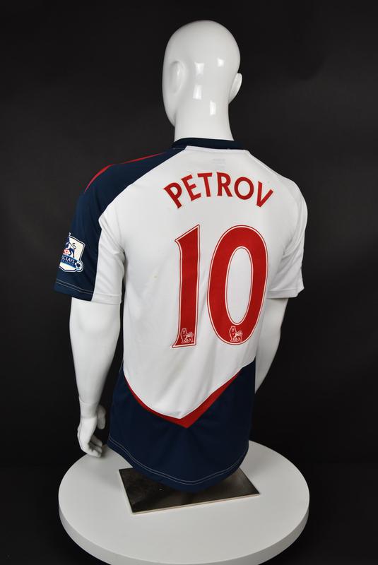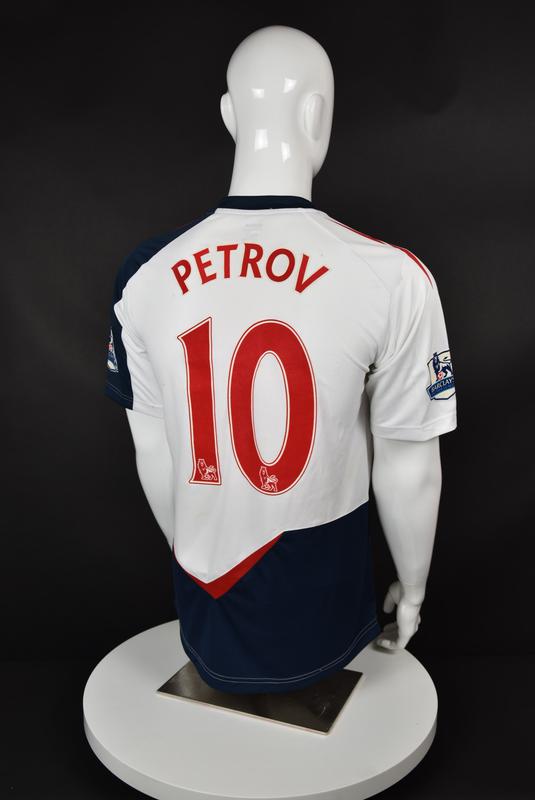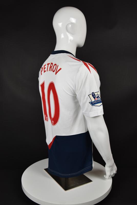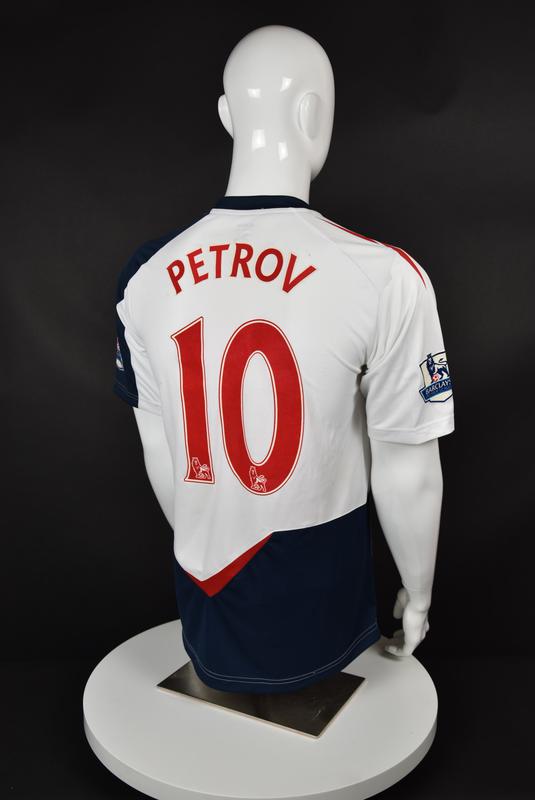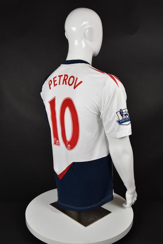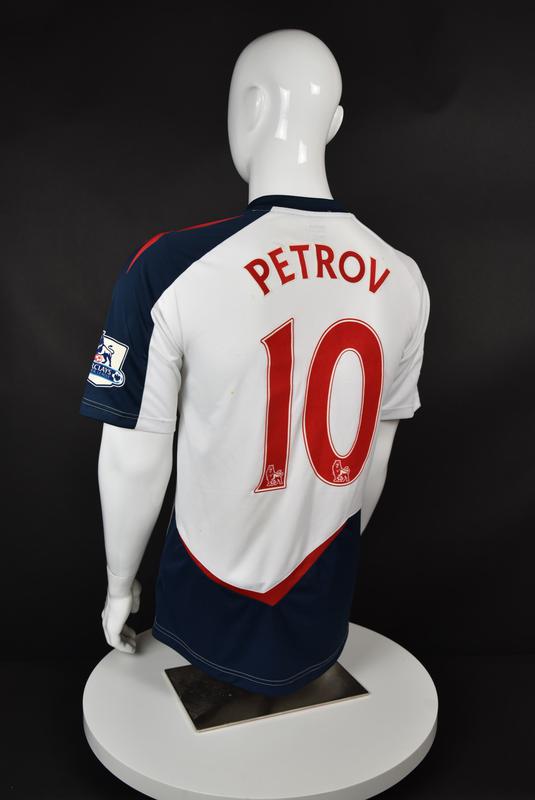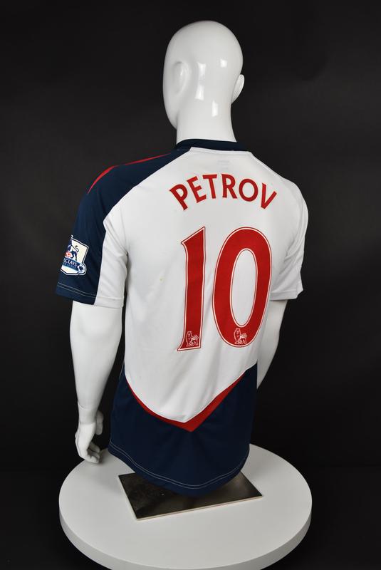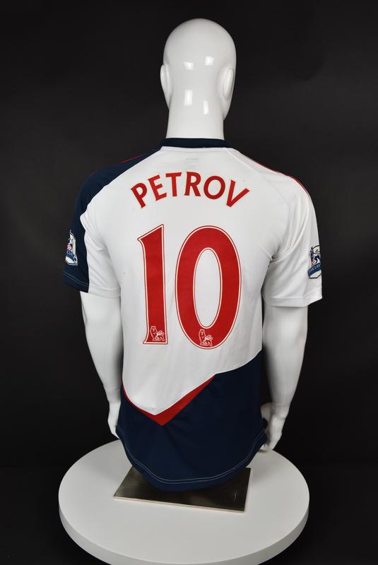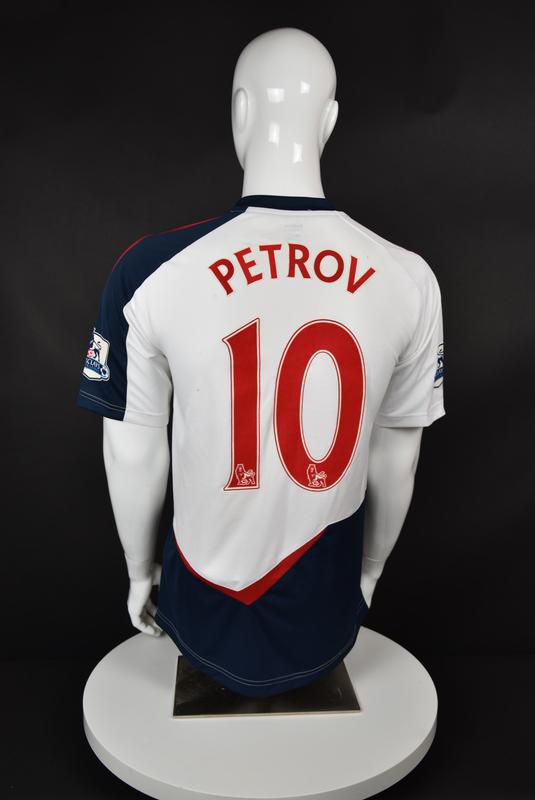 Bolton Wanderers shirt worn by Martin Petrov in the Premier League clash against Aston Villa (1:2). Game played at Villa Park on April 24, 2012. The former Bulgarian International winger went on to score the equalizer. Interesting fact is that all three goals were scored within 3 minutes time. Warnock gave Villa the lead in the 61 minute with Petrov and N'Gog netting the ball in the '62 and '63. Petrov went on to score 12 goals in 86 games for the club over 2,5 years. Shirt was gifted by the player after the match. Petrov earned 90 caps for the national team, scoring 19 goals. He was part of the squad at the 2004 European Championship in Portugal, excelling in all three games and scoring Bulgaria's only goal at the finals - a penalty against Italy in the 1:2 loss. Petrov has won the League title and the League cup of both Bulgarian and Swiss championships, with CSKA Sofia and Servette Geneva, respectively. In 2006, he was voted the Bulgarian Footballer of the Year award.