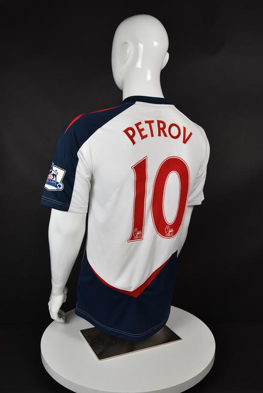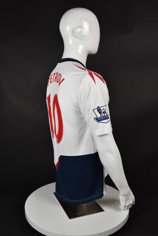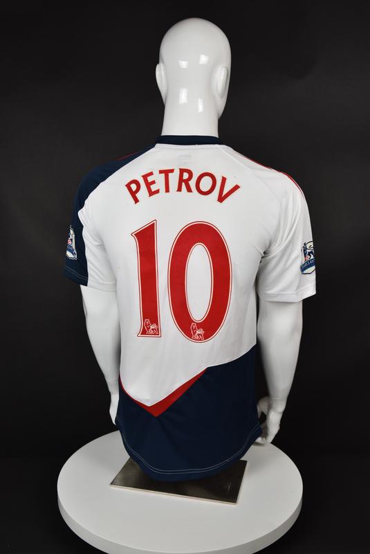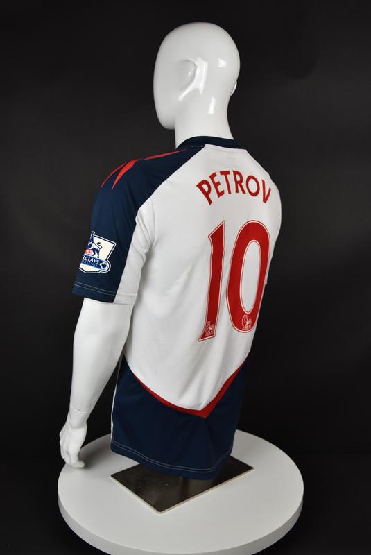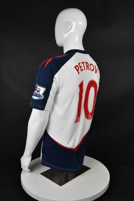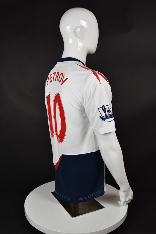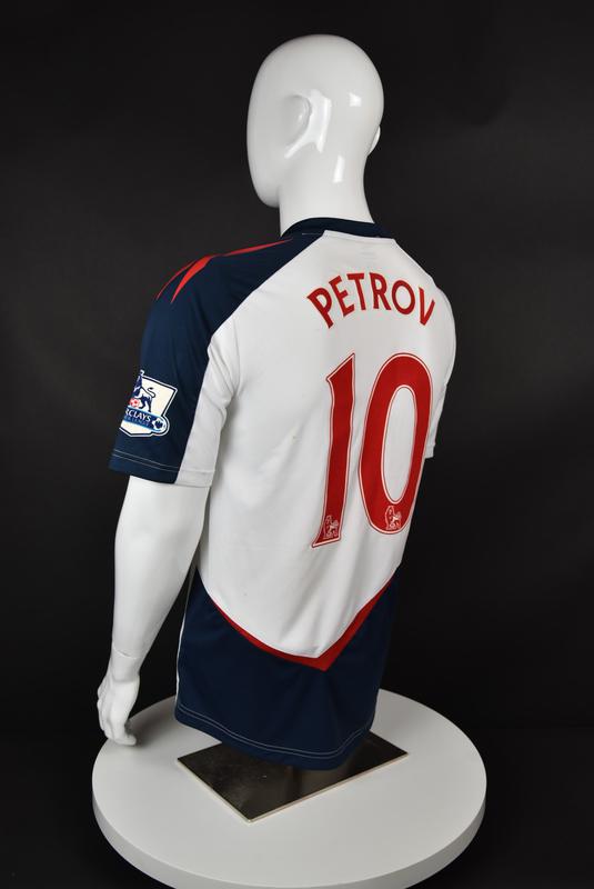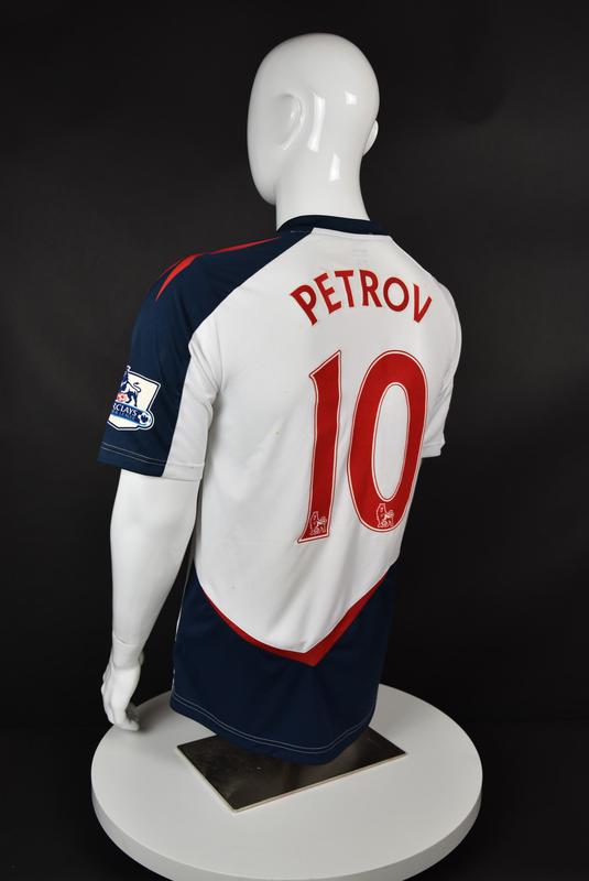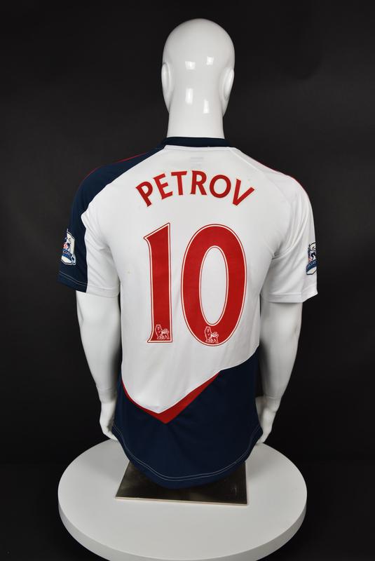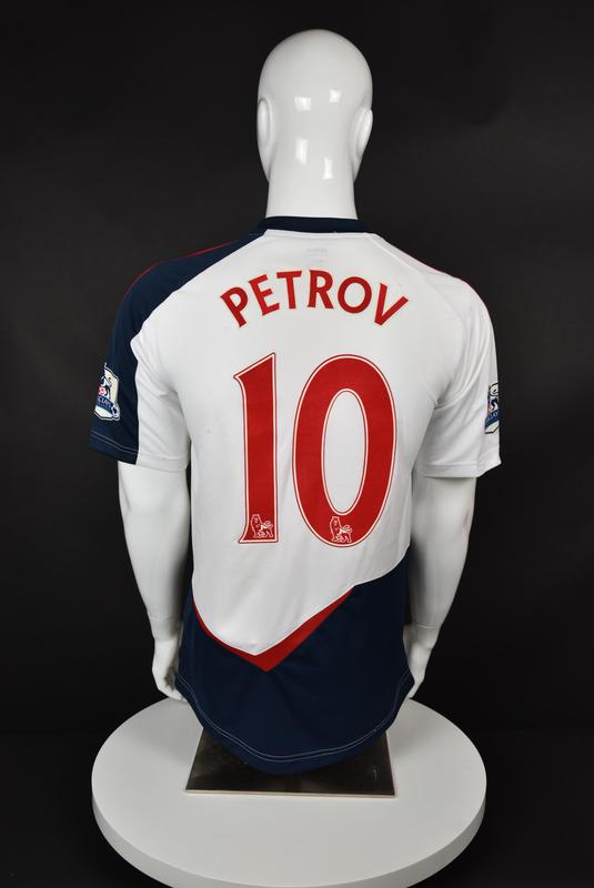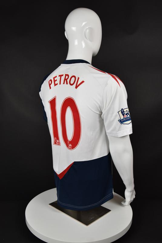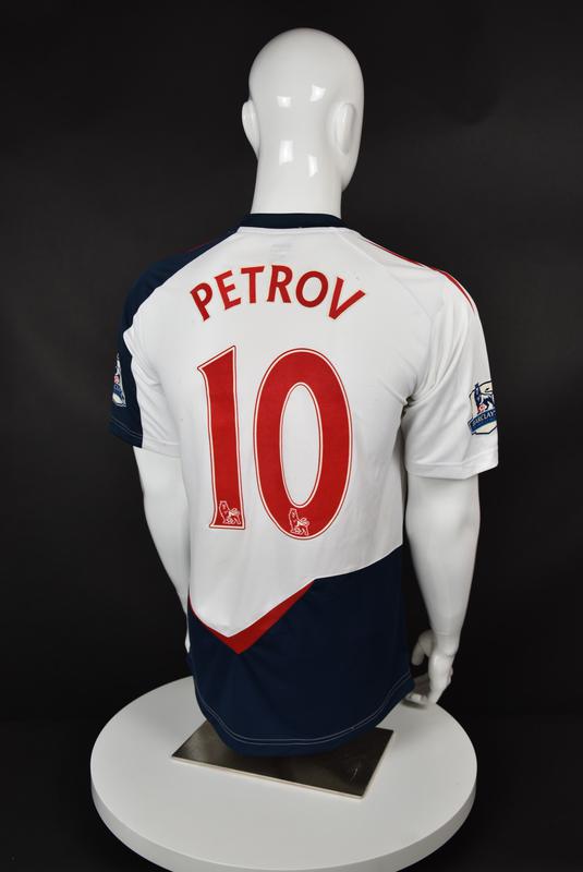 Bolton Wanderers shirt worn by Martin Petrov in the Premier League clash against Aston Villa (1:2). Game played at Villa Park on April 24, 2012. The former Bulgarian International winger went on to score the equalizer. Interesting fact is that all three goals were scored within 3 minutes time. Warnock gave Villa the lead in the 61 minute with Petrov and N'Gog netting the ball in the '62 and '63. Petrov went on to score 12 goals in 86 games for the club over 2,5 years. Shirt was gifted by the player after the match. Petrov earned 90 caps for the national team, scoring 19 goals. He was part of the squad at the 2004 European Championship in Portugal, excelling in all three games and scoring Bulgaria's only goal at the finals - a penalty against Italy in the 1:2 loss. Petrov has won the League title and the League cup of both Bulgarian and Swiss championships, with CSKA Sofia and Servette Geneva, respectively. In 2006, he was voted the Bulgarian Footballer of the Year award.