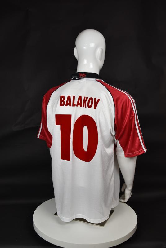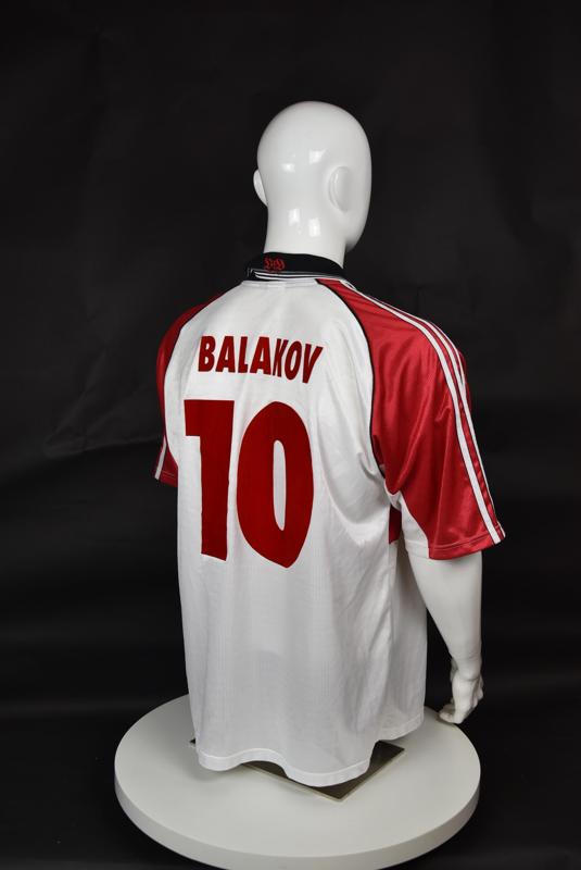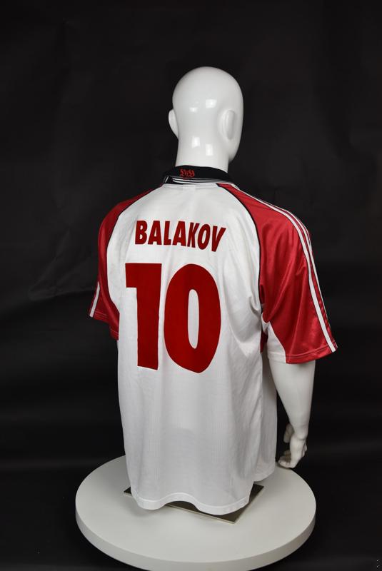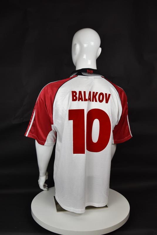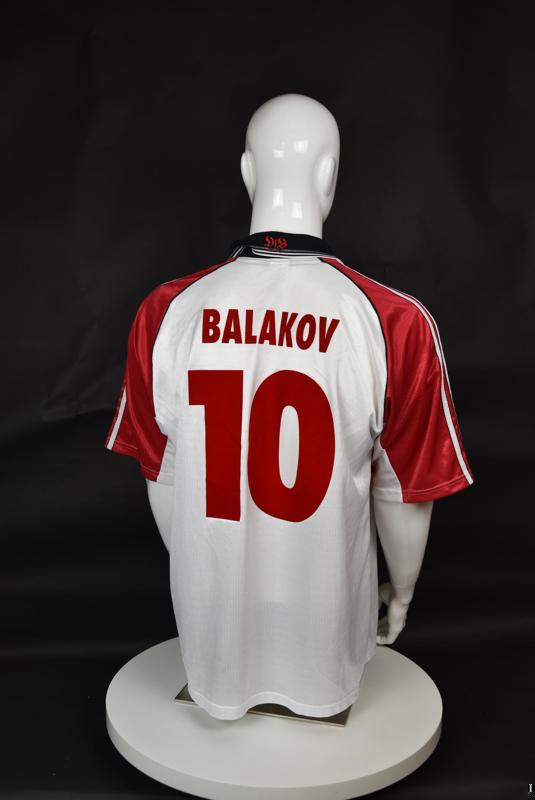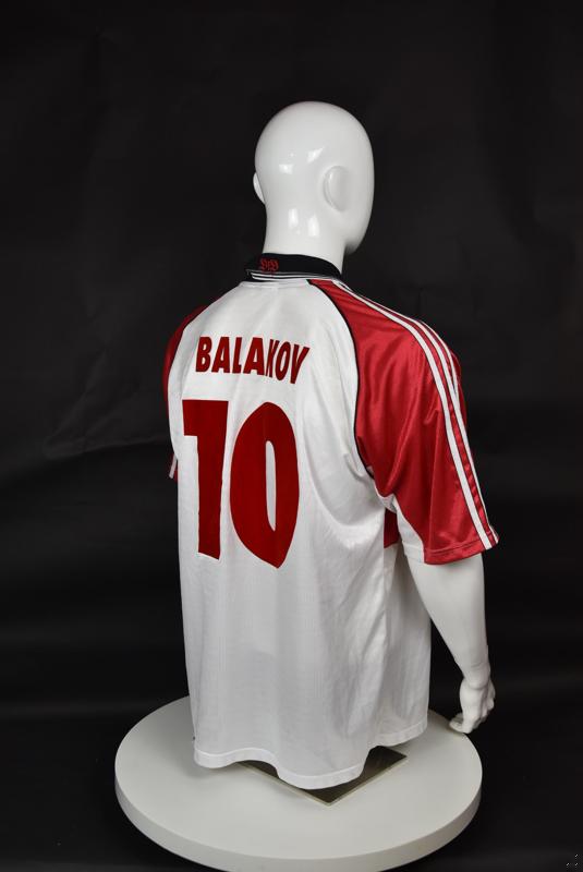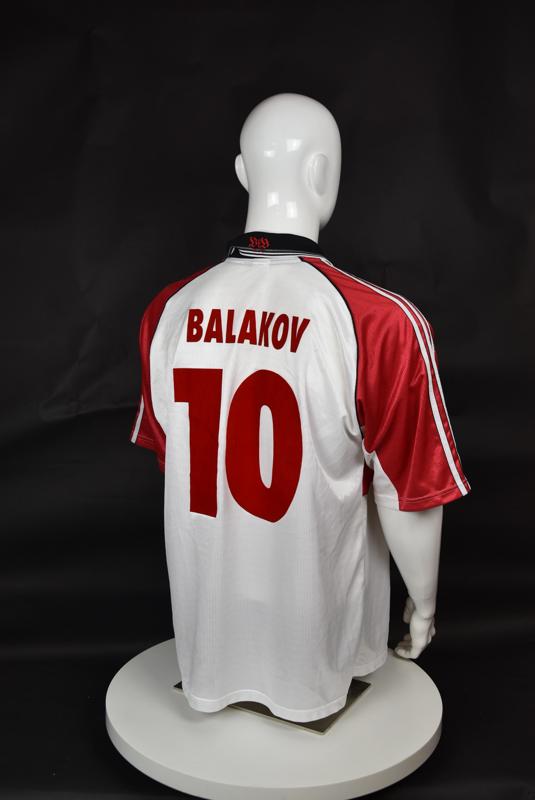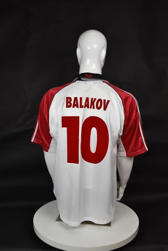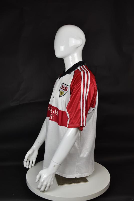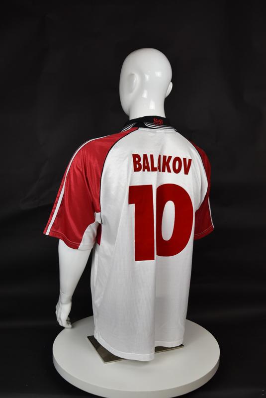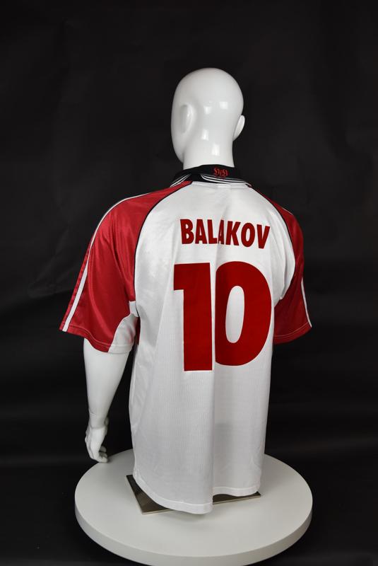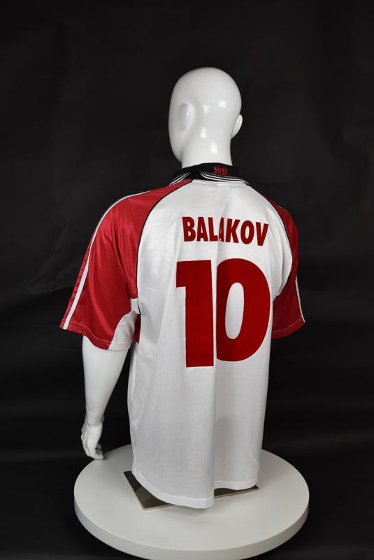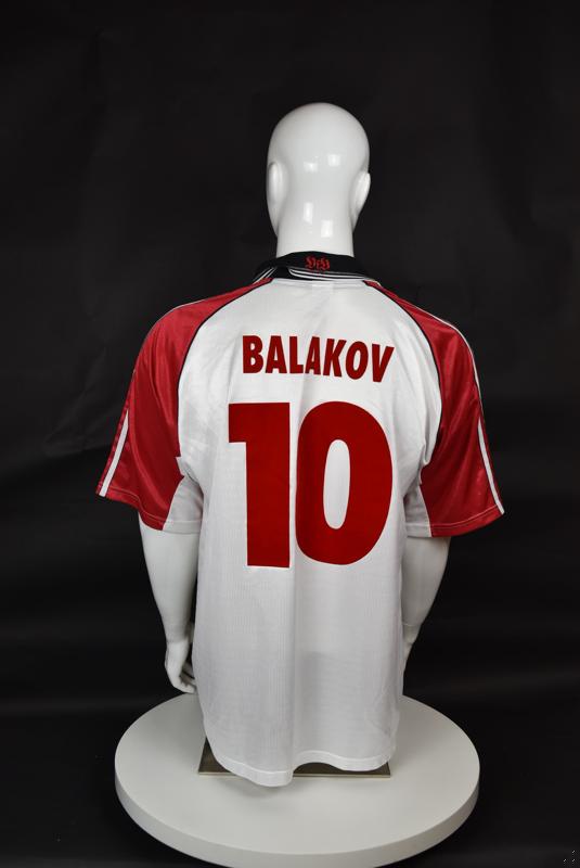 Stuttgart shirt worn by Krasimir Balakov against Feyenord during the 1998/1998 UEFA Cup First Round first leg clash (1:3). Game played at "Gottlieb-Daimler-Stadion" on September 15, 1998. Balakov played full 90 minutes and swapped shirts with Feyenord's captain Jean-Paul van Gastel after the game. The Germans completed a memorable come back in the second leg, beating the Rotterdamers 3:0 to advance to the next stage. Balakov scored the first goal in the 35th minute. However, Stuttgart were not so lucky in the Second round and were kicked out of the tournament by Clube Brugge after 4:3 on aggregate. The former Bulgarian International attacking midfielder spent 8 seasons at "Gottlieb-Daimler-Stadion" and went on to make 298 appearances for the club, scoring 73 goals. Balakov won the DFB Pokal in 1997, reached the final of Cup Winners' Cup in 1998 and said farewell to his career at Stuttgart as Bundesliga runner-up (2003). He made 92 appearances for Bulgaria between 1988 and 2003 (one of the best totals in national history) and scored 16 goals. Balakov is a bronze medalist from the 1994 FIFA World Cup and was voted to the World Cup All-Star team.