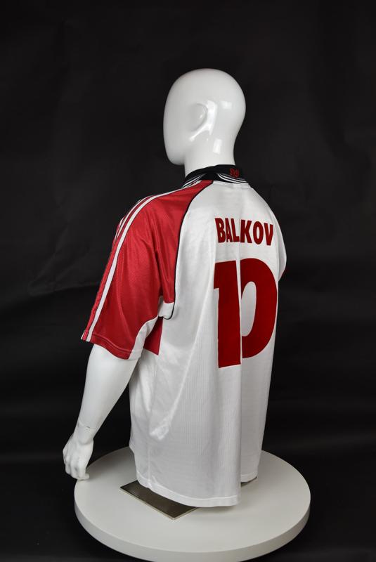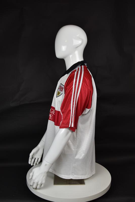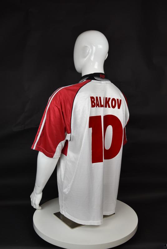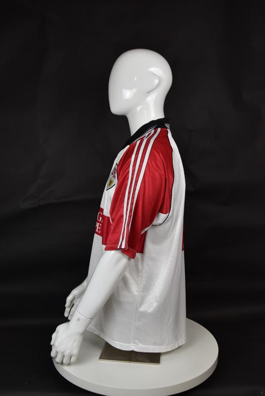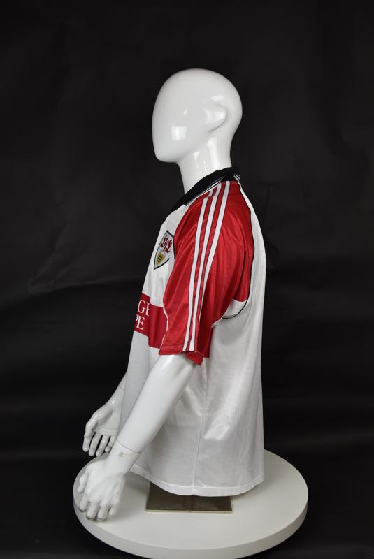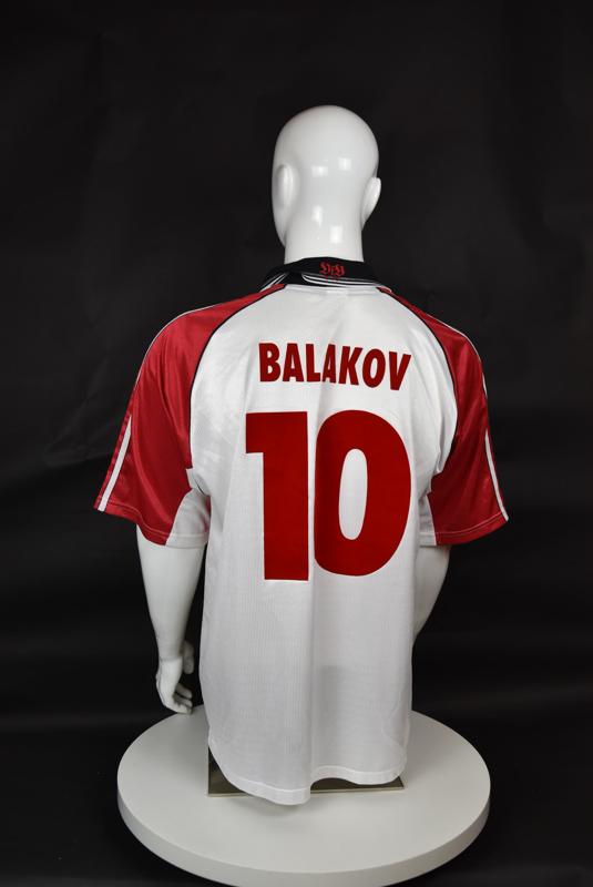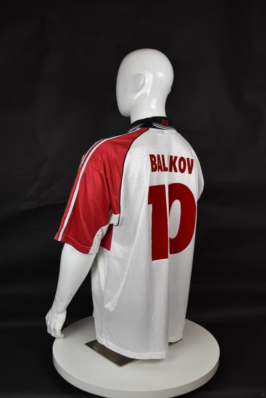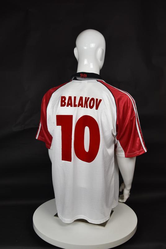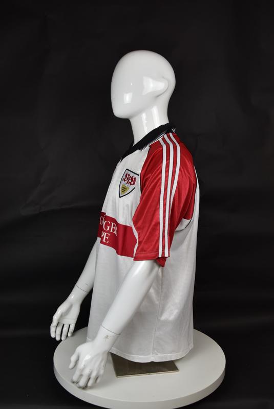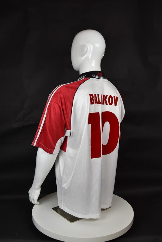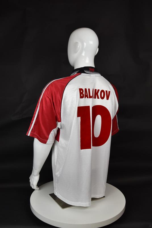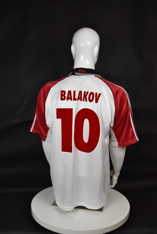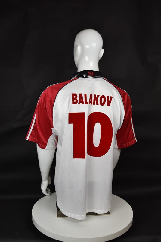 Stuttgart shirt worn by Krasimir Balakov against Feyenord during the 1998/1998 UEFA Cup First Round first leg clash (1:3). Game played at "Gottlieb-Daimler-Stadion" on September 15, 1998. Balakov played full 90 minutes and swapped shirts with Feyenord's captain Jean-Paul van Gastel after the game. The Germans completed a memorable come back in the second leg, beating the Rotterdamers 3:0 to advance to the next stage. Balakov scored the first goal in the 35th minute. However, Stuttgart were not so lucky in the Second round and were kicked out of the tournament by Clube Brugge after 4:3 on aggregate. The former Bulgarian International attacking midfielder spent 8 seasons at "Gottlieb-Daimler-Stadion" and went on to make 298 appearances for the club, scoring 73 goals. Balakov won the DFB Pokal in 1997, reached the final of Cup Winners' Cup in 1998 and said farewell to his career at Stuttgart as Bundesliga runner-up (2003). He made 92 appearances for Bulgaria between 1988 and 2003 (one of the best totals in national history) and scored 16 goals. Balakov is a bronze medalist from the 1994 FIFA World Cup and was voted to the World Cup All-Star team.