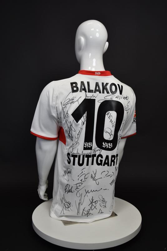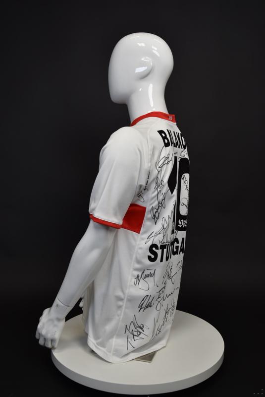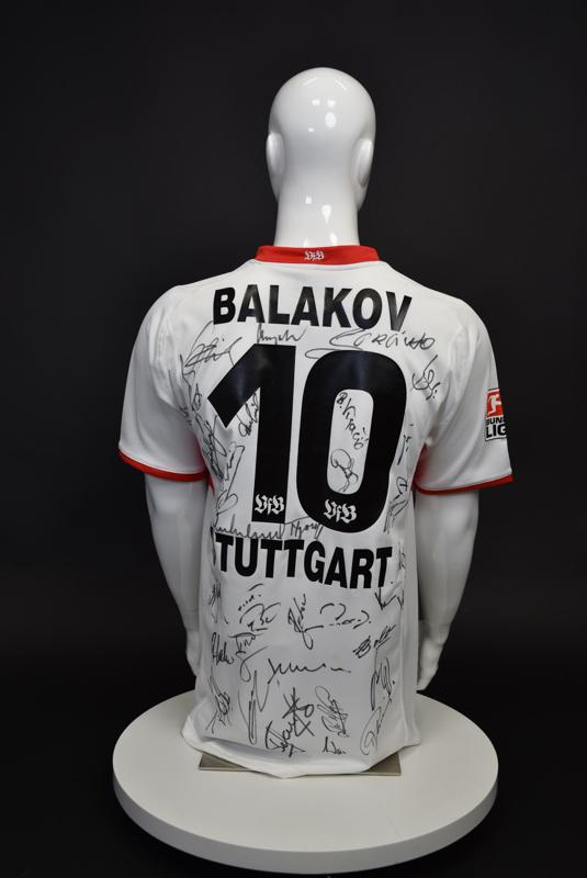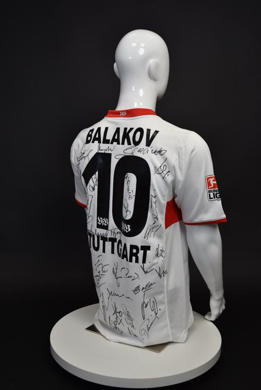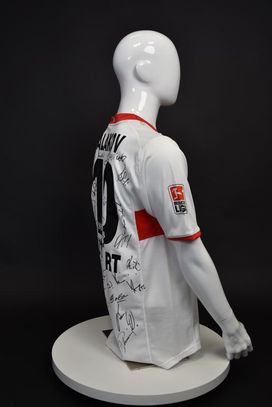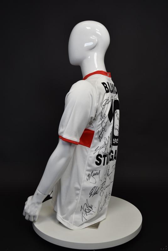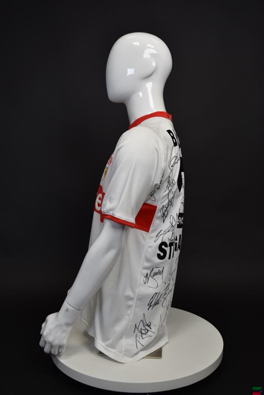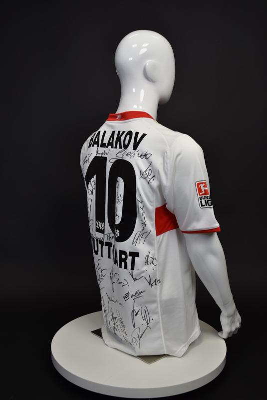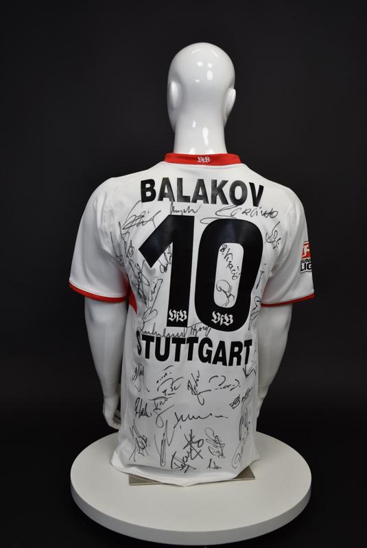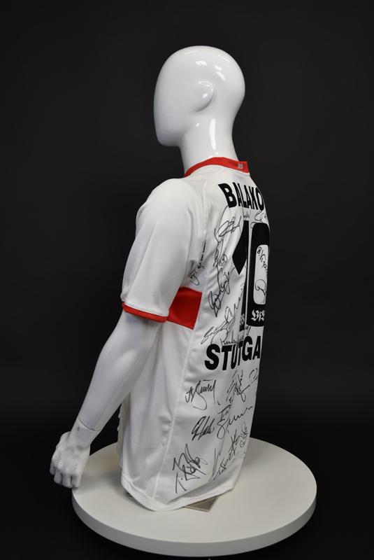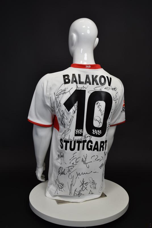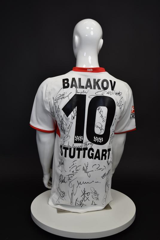 Stuttgart shirt worn by Krasimir Balakov against Wolfsburg in his last match as a professional footballer in the Bundesliga. The kit was signed by the entire team and was donated by Bala for an auction organized by the renowned local magazine Sport Bild. Years later, Bulgarian Football Shirts contacted the person who acquired it to buy it back and return it to Bulgaria. The last match of the great Bulgarian midfielder took place on May 24, 2003 at the Gottlieb-Daimler Stadium. The match ended in a 2:0 victory for the VfB, with Balakov receiving the honor of scoring from a penalty in his last match for the Die Schwaben. Stuttgart finished second in the Bundesliga and claimed a spot in the UEFA Champions League group stage. This kit is of exceptional historical and collector's value for the Bulgarian football, and the symbolism on it is far from only in the traces of use that still remain. Mud and blood, which are an excellent metaphor for the incredible perseverance, work ethics and attitude that one of the greatest Bulgarian football players has put in throughout his career. The Puma jersey, with Balakov's name on the back, was made in Bulgaria. The last match against Wolfsburg took place on the most beloved and revered Bulgarian holiday - that of our alphabet and letters - the Day of the Holy Brothers Cyril and Methodius, of the Bulgarian alphabet, education and culture and of the Slavonic literature. The jersey itself is also remarkable by the four stars placed right above the crest, which go the four titles won by the Die Schwaben (Note: In 2007, VfB lifted their last Bundesliga title to date). What makes the shirt of this model unique is that the match against Wolfsburg and Krasimir Balakov's farewell game four days later are the only time in which Stuttgart puts four stars above the crest. In addition to that, having the shirt signed by the entire squad, staff and management makes it a unqiue piece of memorabilia not only for Bulgaria but of course also for VfB Stuttgart. The former Bulgarian International attacking midfielder spent 8 seasons at "Gottlieb-Daimler-Stadion" and went on to make 298 appearances for the club, scoring 73 goals. Balakov won the DFB Pokal in 1997, reached the final of Cup Winners' Cup in 1998 and said farewell to his career at Stuttgart as Bundesliga runner-up (2003). He made 92 appearances for Bulgaria between 1988 and 2003 (one of the best totals in national history) and scored 16 goals. Balakov is a bronze medalist from the 1994 FIFA World Cup and was voted to the World Cup All-Star team.