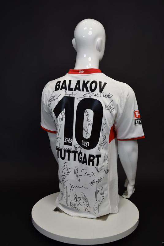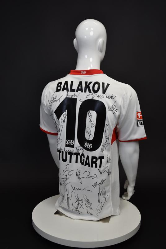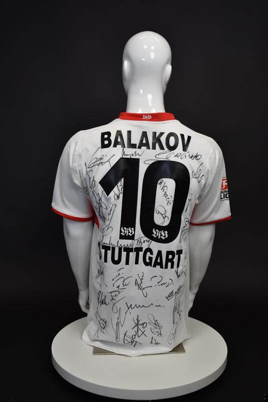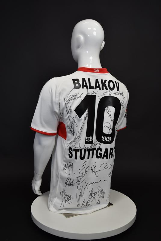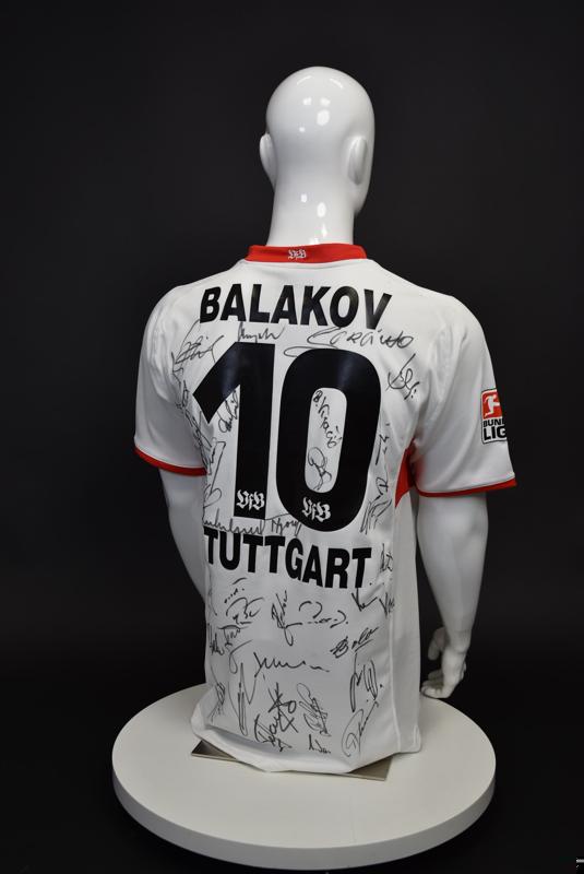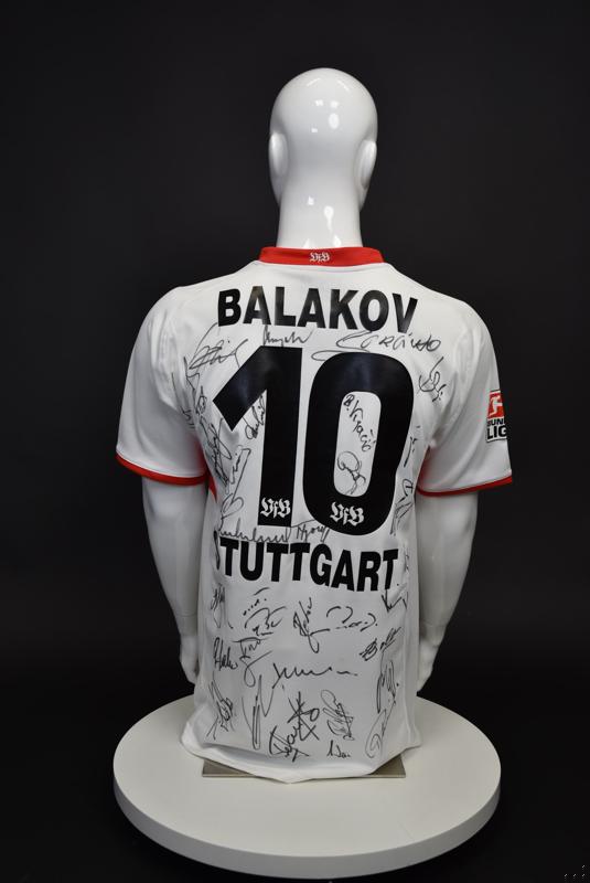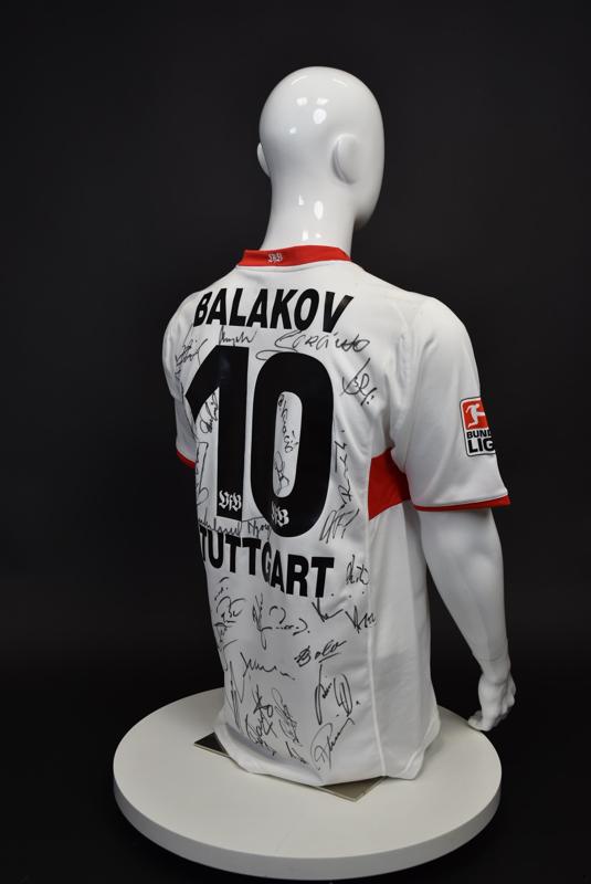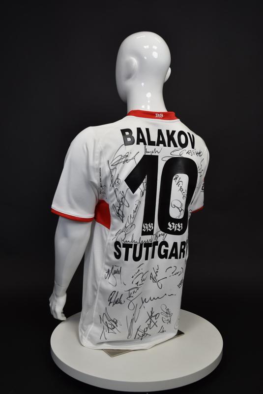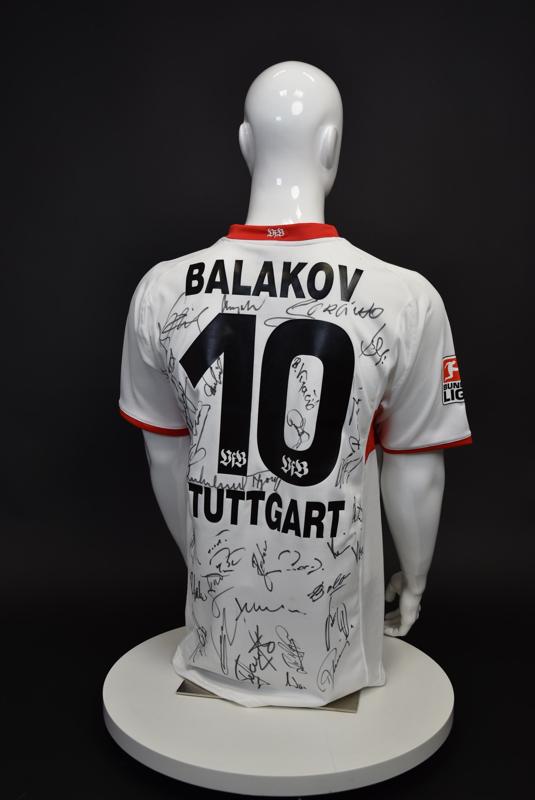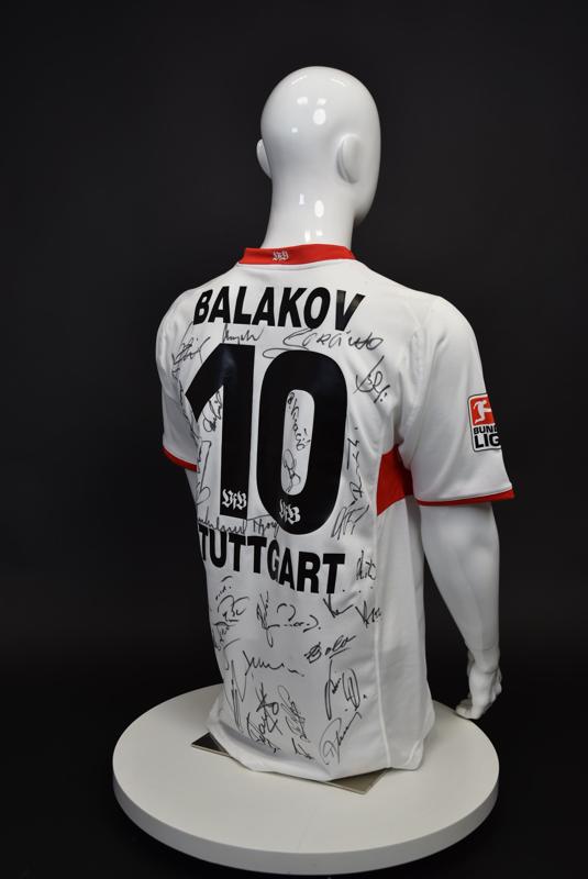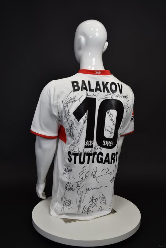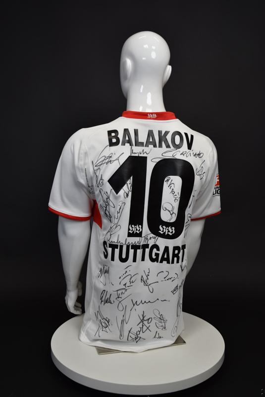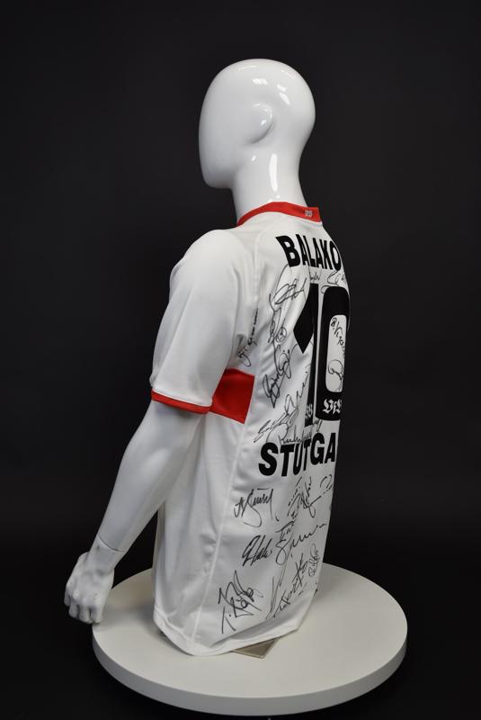 Stuttgart shirt worn by Krasimir Balakov against Wolfsburg in his last match as a professional footballer in the Bundesliga. The kit was signed by the entire team and was donated by Bala for an auction organized by the renowned local magazine Sport Bild. Years later, Bulgarian Football Shirts contacted the person who acquired it to buy it back and return it to Bulgaria. The last match of the great Bulgarian midfielder took place on May 24, 2003 at the Gottlieb-Daimler Stadium. The match ended in a 2:0 victory for the VfB, with Balakov receiving the honor of scoring from a penalty in his last match for the Die Schwaben. Stuttgart finished second in the Bundesliga and claimed a spot in the UEFA Champions League group stage. This kit is of exceptional historical and collector's value for the Bulgarian football, and the symbolism on it is far from only in the traces of use that still remain. Mud and blood, which are an excellent metaphor for the incredible perseverance, work ethics and attitude that one of the greatest Bulgarian football players has put in throughout his career. The Puma jersey, with Balakov's name on the back, was made in Bulgaria. The last match against Wolfsburg took place on the most beloved and revered Bulgarian holiday - that of our alphabet and letters - the Day of the Holy Brothers Cyril and Methodius, of the Bulgarian alphabet, education and culture and of the Slavonic literature. The jersey itself is also remarkable by the four stars placed right above the crest, which go the four titles won by the Die Schwaben (Note: In 2007, VfB lifted their last Bundesliga title to date). What makes the shirt of this model unique is that the match against Wolfsburg and Krasimir Balakov's farewell game four days later are the only time in which Stuttgart puts four stars above the crest. In addition to that, having the shirt signed by the entire squad, staff and management makes it a unqiue piece of memorabilia not only for Bulgaria but of course also for VfB Stuttgart. The former Bulgarian International attacking midfielder spent 8 seasons at "Gottlieb-Daimler-Stadion" and went on to make 298 appearances for the club, scoring 73 goals. Balakov won the DFB Pokal in 1997, reached the final of Cup Winners' Cup in 1998 and said farewell to his career at Stuttgart as Bundesliga runner-up (2003). He made 92 appearances for Bulgaria between 1988 and 2003 (one of the best totals in national history) and scored 16 goals. Balakov is a bronze medalist from the 1994 FIFA World Cup and was voted to the World Cup All-Star team.