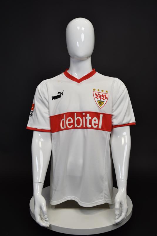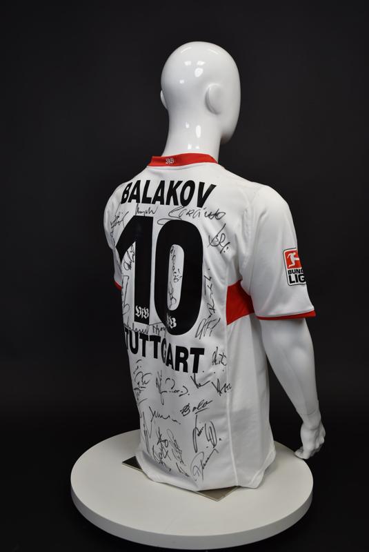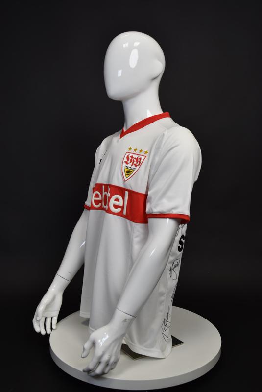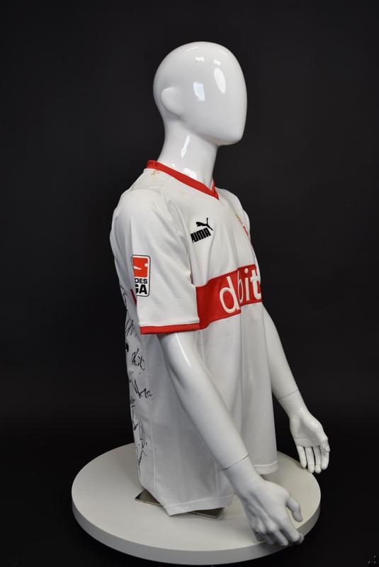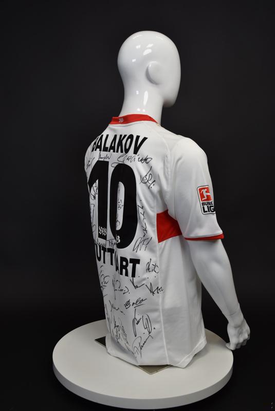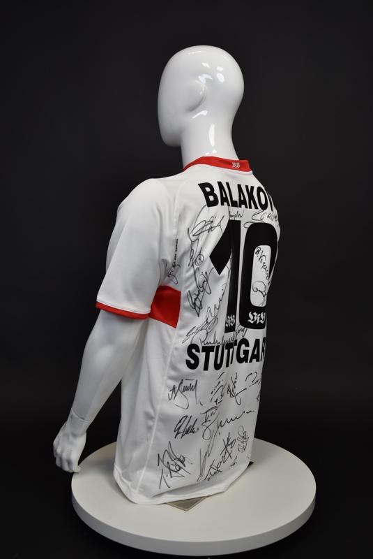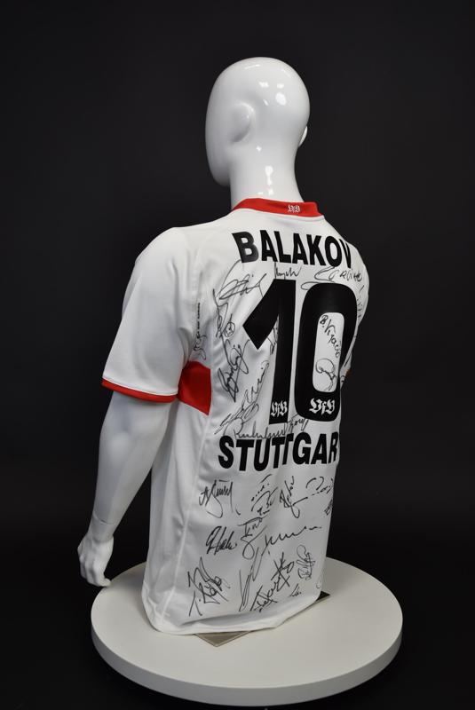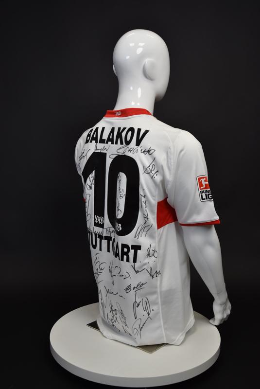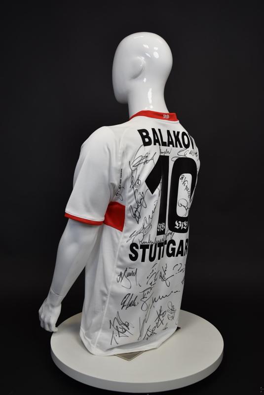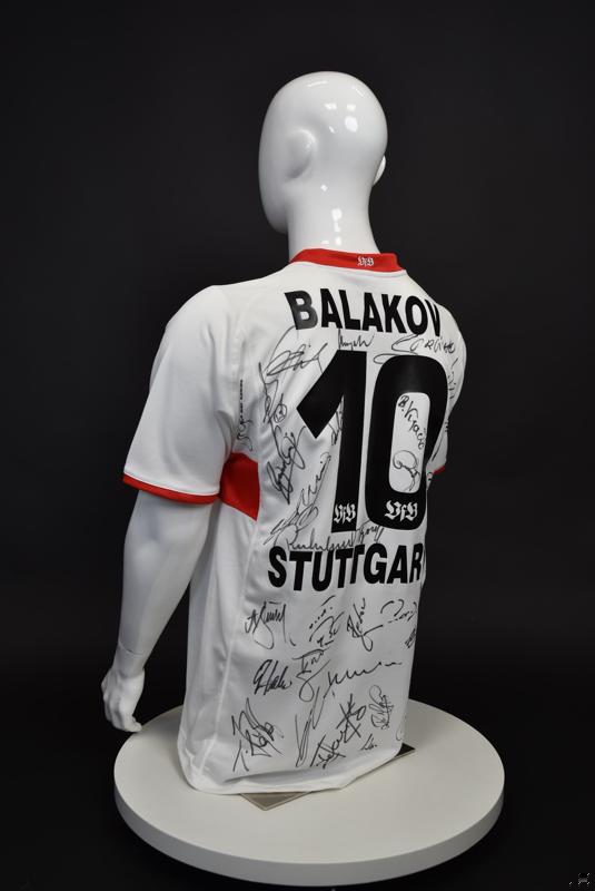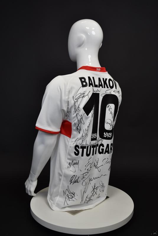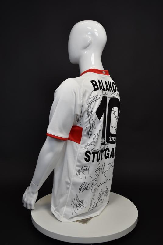Stuttgart shirt worn by Krasimir Balakov against Wolfsburg in his last match as a professional footballer in the Bundesliga. The kit was signed by the entire team and was donated by Bala for an auction organized by the renowned local magazine Sport Bild. Years later, Bulgarian Football Shirts contacted the person who acquired it to buy it back and return it to Bulgaria. The last match of the great Bulgarian midfielder took place on May 24, 2003 at the Gottlieb-Daimler Stadium. The match ended in a 2:0 victory for the VfB, with Balakov receiving the honor of scoring from a penalty in his last match for the Die Schwaben. Stuttgart finished second in the Bundesliga and claimed a spot in the UEFA Champions League group stage. This kit is of exceptional historical and collector's value for the Bulgarian football, and the symbolism on it is far from only in the traces of use that still remain. Mud and blood, which are an excellent metaphor for the incredible perseverance, work ethics and attitude that one of the greatest Bulgarian football players has put in throughout his career. The Puma jersey, with Balakov's name on the back, was made in Bulgaria. The last match against Wolfsburg took place on the most beloved and revered Bulgarian holiday - that of our alphabet and letters - the Day of the Holy Brothers Cyril and Methodius, of the Bulgarian alphabet, education and culture and of the Slavonic literature. The jersey itself is also remarkable by the four stars placed right above the crest, which go the four titles won by the Die Schwaben (Note: In 2007, VfB lifted their last Bundesliga title to date). What makes the shirt of this model unique is that the match against Wolfsburg and Krasimir Balakov's farewell game four days later are the only time in which Stuttgart puts four stars above the crest. In addition to that, having the shirt signed by the entire squad, staff and management makes it a unqiue piece of memorabilia not only for Bulgaria but of course also for VfB Stuttgart. The former Bulgarian International attacking midfielder spent 8 seasons at "Gottlieb-Daimler-Stadion" and went on to make 298 appearances for the club, scoring 73 goals. Balakov won the DFB Pokal in 1997, reached the final of Cup Winners' Cup in 1998 and said farewell to his career at Stuttgart as Bundesliga runner-up (2003). He made 92 appearances for Bulgaria between 1988 and 2003 (one of the best totals in national history) and scored 16 goals. Balakov is a bronze medalist from the 1994 FIFA World Cup and was voted to the World Cup All-Star team.