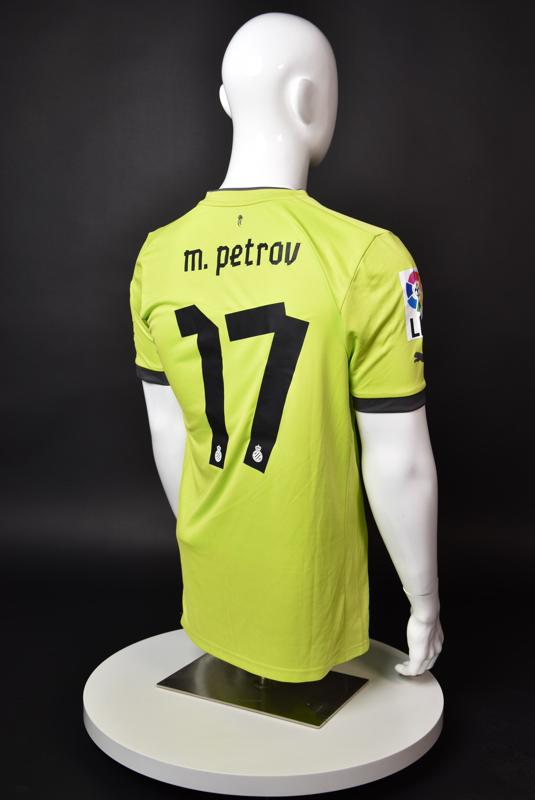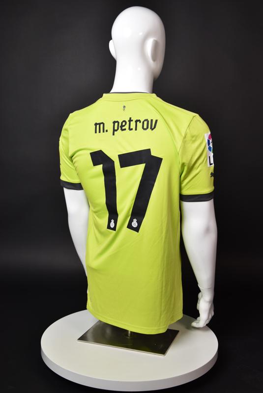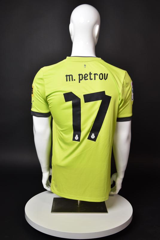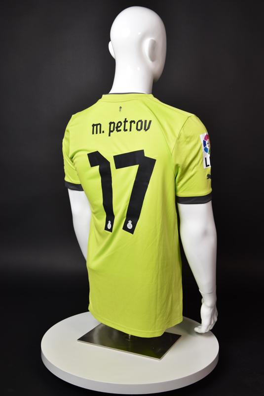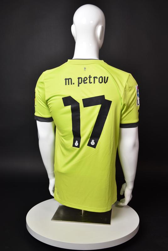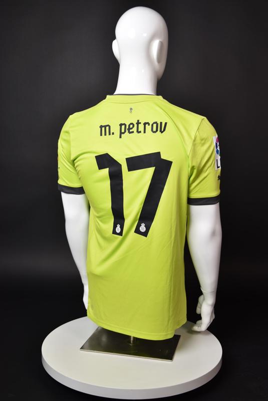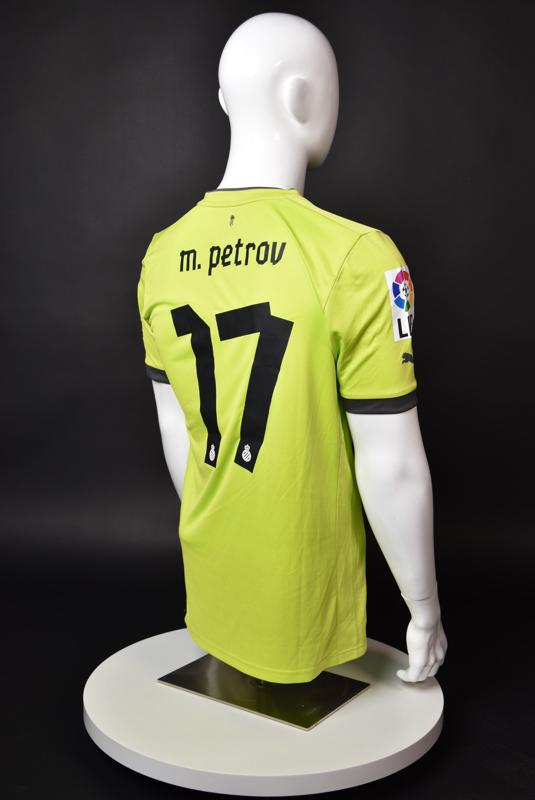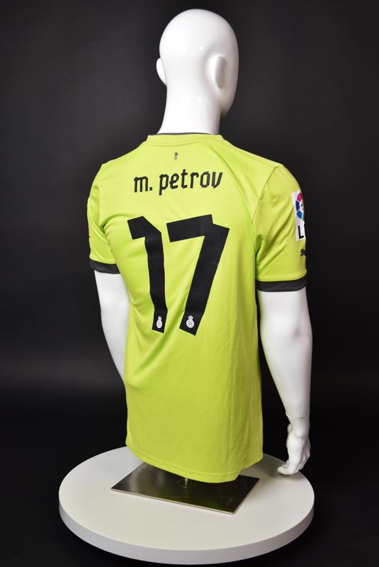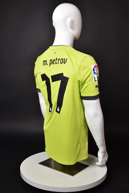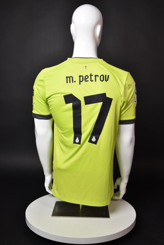 Espanyol shirt worn by Martin Petrov during his short spell at the Catalan club for which he played 8 games in the spring of 2013. Martin Petrov is a former Bulgarian international of Botev (Vratsa), CSKA, Servette (Geneva), Wolfsburg, Atletico (Madrid), Manchester City, Bolton and Espanyol. Champion and winner of the national cup of both Bulgaria and Switzerland. Former Bulgarian national team player with 90 matches and 19 goals with the "tricolor" shirt. Participant of Euro'2004 in Portugal, where he scored the only goal for the "lions" at the forum - in the 1:2 loss to Italy in the last match of Group "D".