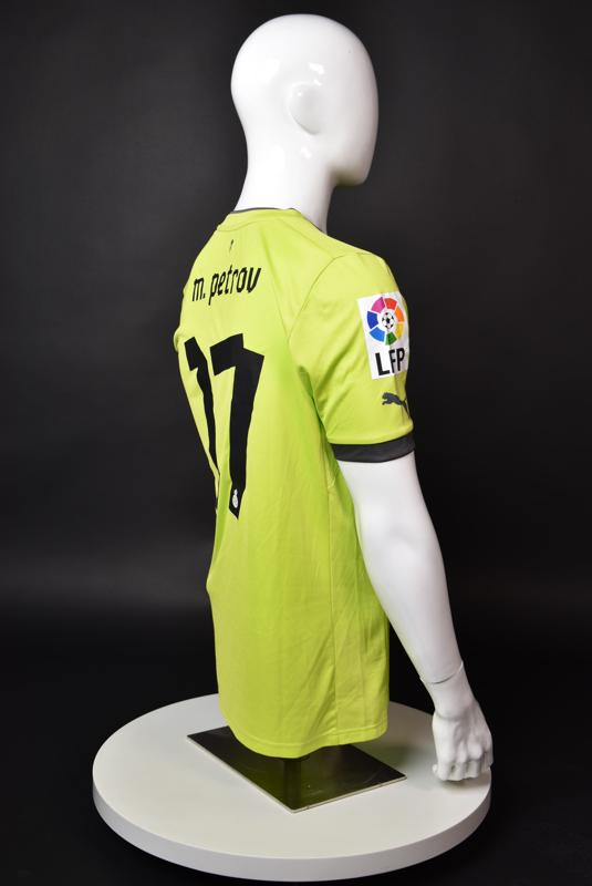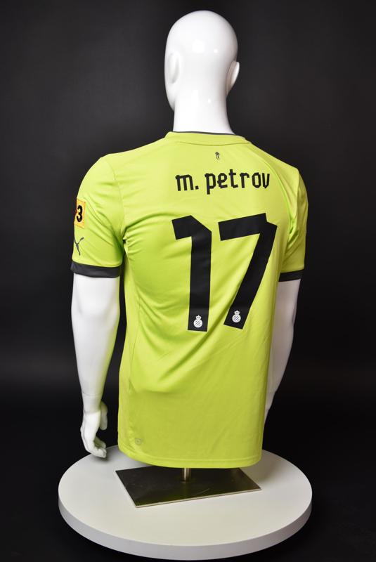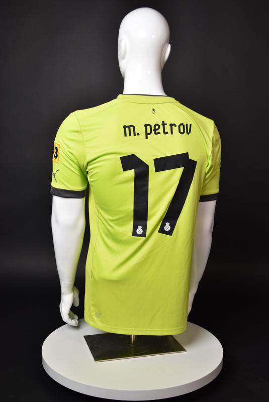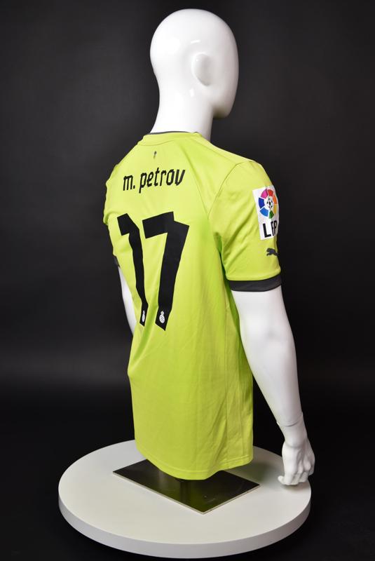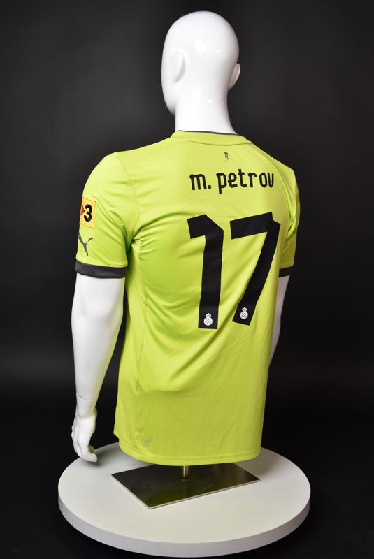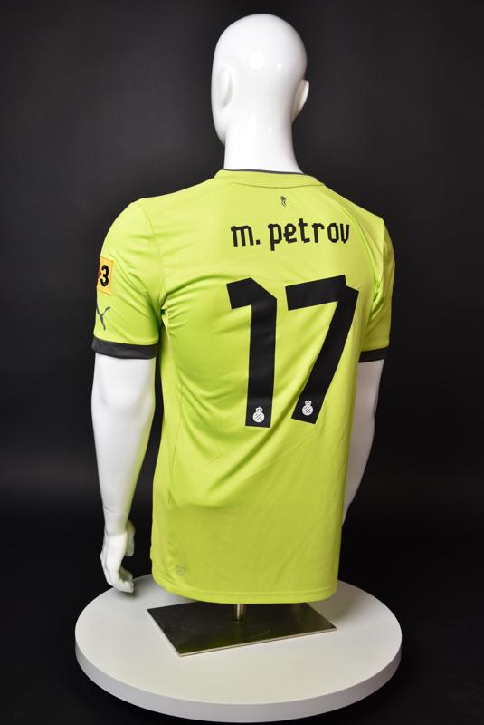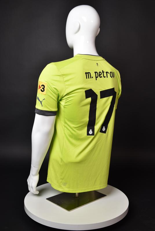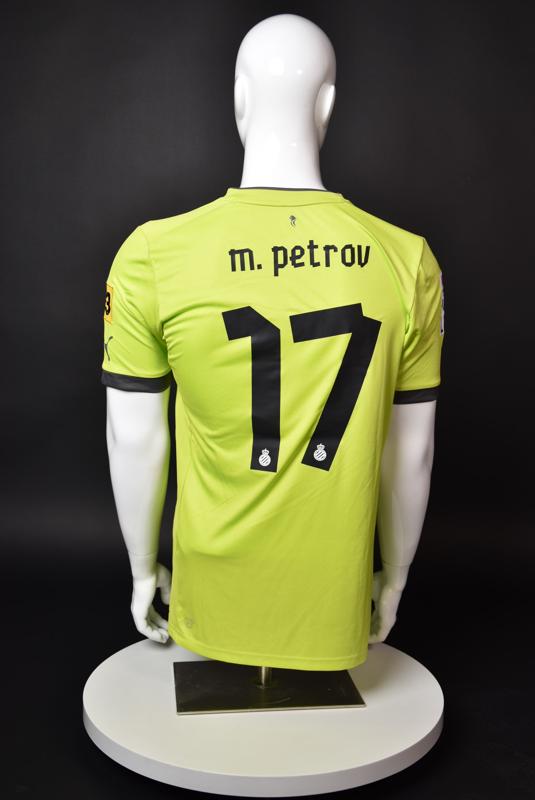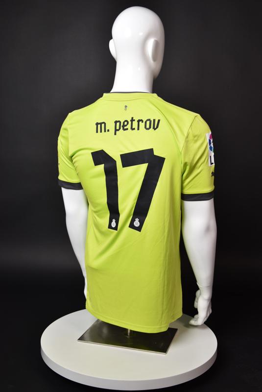 Espanyol shirt worn by Martin Petrov during his short spell at the Catalan club for which he played 8 games in the spring of 2013. Martin Petrov is a former Bulgarian international of Botev (Vratsa), CSKA, Servette (Geneva), Wolfsburg, Atletico (Madrid), Manchester City, Bolton and Espanyol. Champion and winner of the national cup of both Bulgaria and Switzerland. Former Bulgarian national team player with 90 matches and 19 goals with the "tricolor" shirt. Participant of Euro'2004 in Portugal, where he scored the only goal for the "lions" at the forum - in the 1:2 loss to Italy in the last match of Group "D".