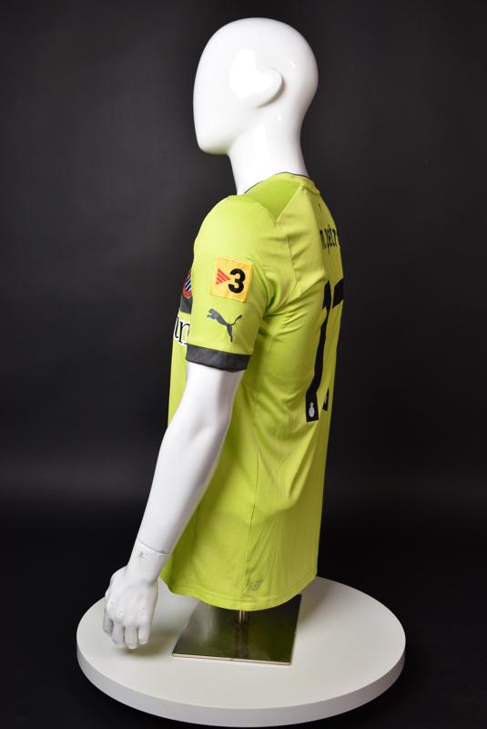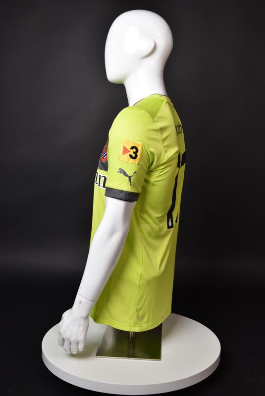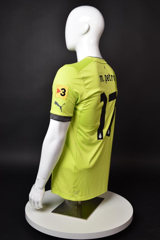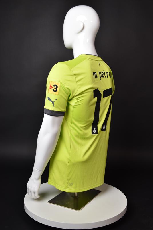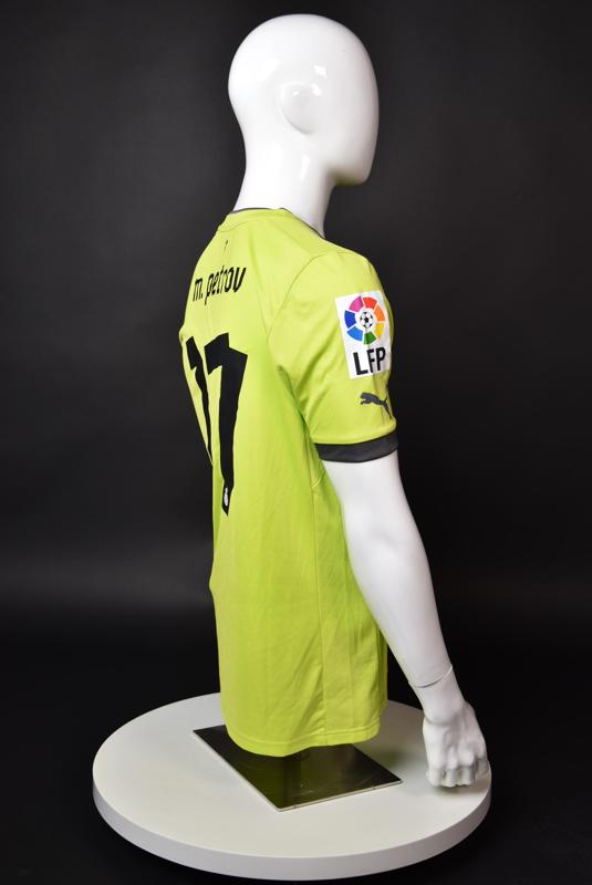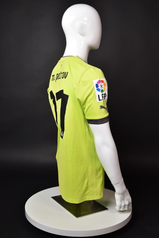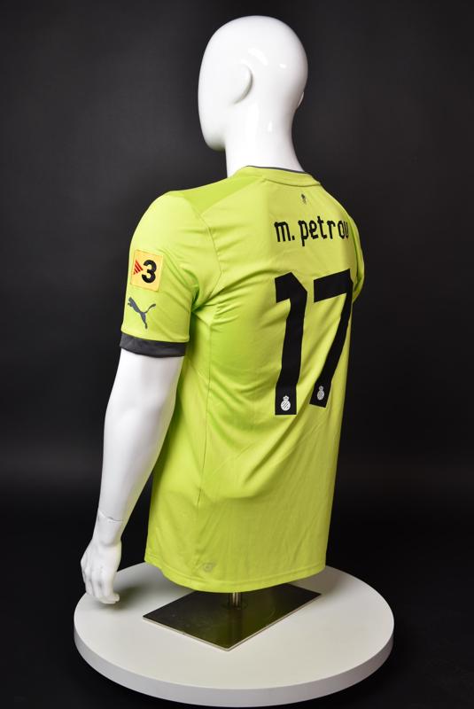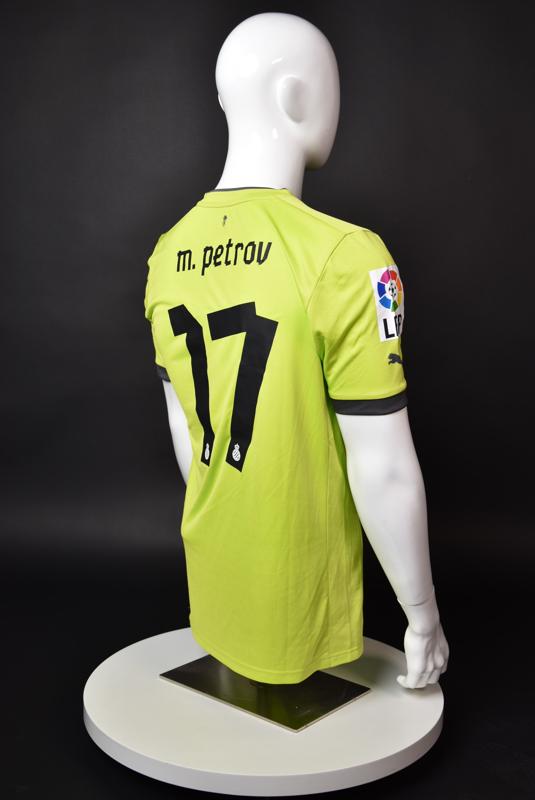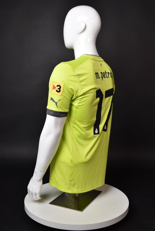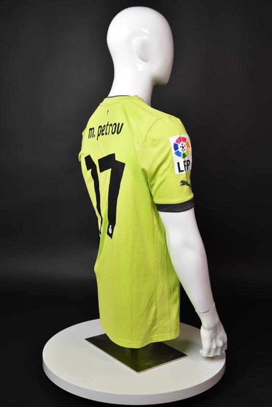 Espanyol shirt worn by Martin Petrov during his short spell at the Catalan club for which he played 8 games in the spring of 2013. Martin Petrov is a former Bulgarian international of Botev (Vratsa), CSKA, Servette (Geneva), Wolfsburg, Atletico (Madrid), Manchester City, Bolton and Espanyol. Champion and winner of the national cup of both Bulgaria and Switzerland. Former Bulgarian national team player with 90 matches and 19 goals with the "tricolor" shirt. Participant of Euro'2004 in Portugal, where he scored the only goal for the "lions" at the forum - in the 1:2 loss to Italy in the last match of Group "D".